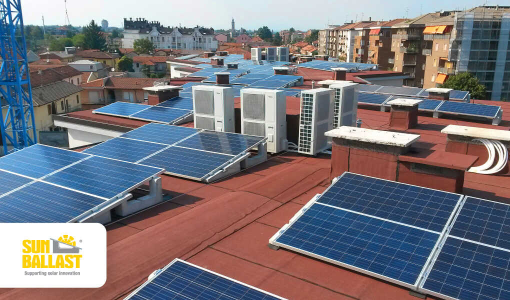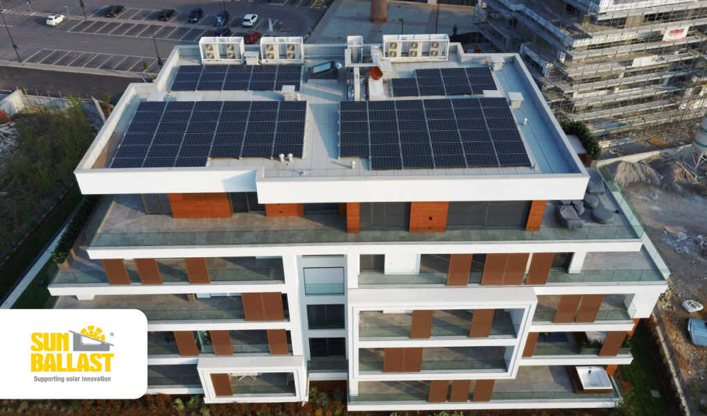 Ideal ist diese Struktur auch für sehr hohe Wohnanlagen oder Gebäude, auf die besonders starke Windkräfte einwirken. Die gegenüberliegende Anordnung der Ballastelemente vermeidet die Kanalisierung von Luftströmen und schafft es, der gesamten Photovoltaikanlage eine größere Stabilität zu verleihen, ohne dass Löcher in das Dach gebohrt werden müssen.
