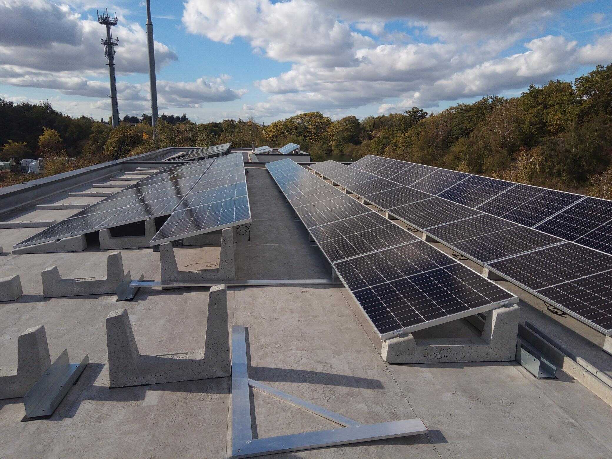Probleme durch Verschattung oder Platzprobleme werden sowohl mit Sun Ballast® 0° als auch mit dem segelförmigen System 5°.6 mit 3 horizontalen Modulen und Ost/West-Ausrichtung gelöst.