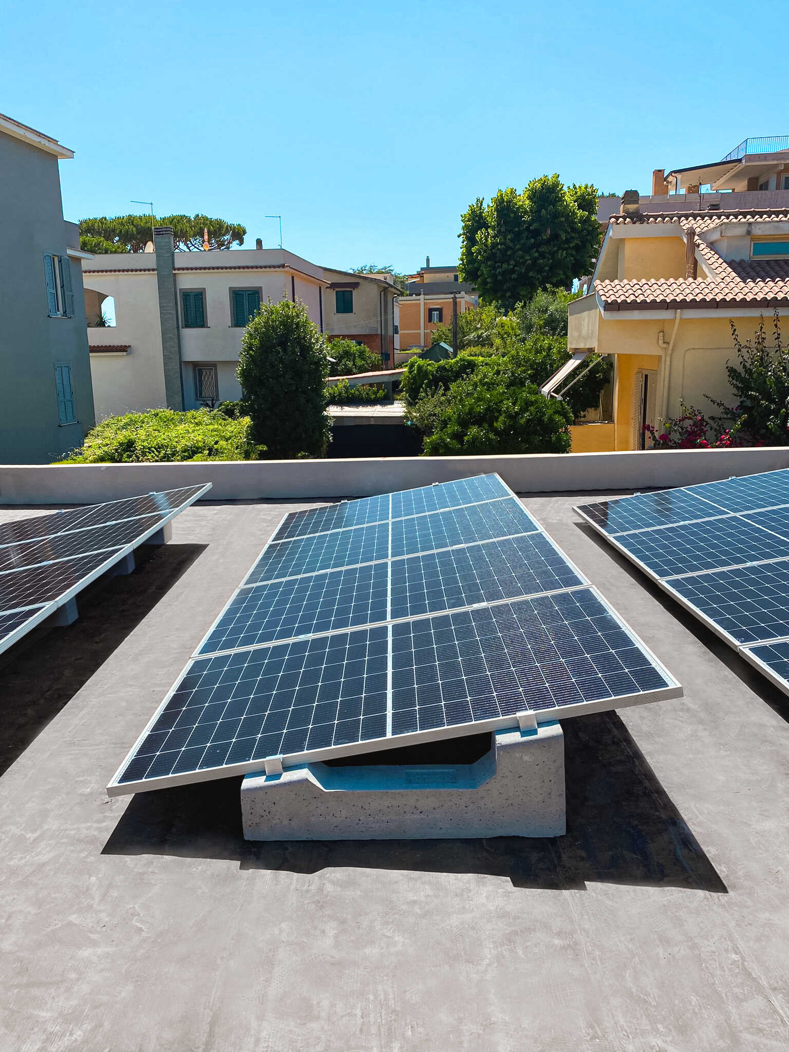 Es erfüllt sowohl die Funktion des Trägers als auch die des Ballasts für die Photovoltaikmodule und muss nicht auf dem Dach befestigt, sondern nur getragen werden. Bei der Montage wird eine schützende Gummihülle zwischen Stütze und Dach gelegt.