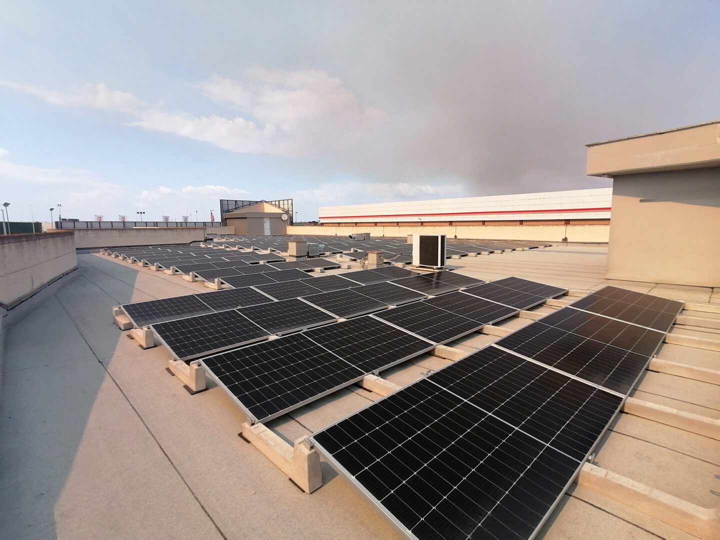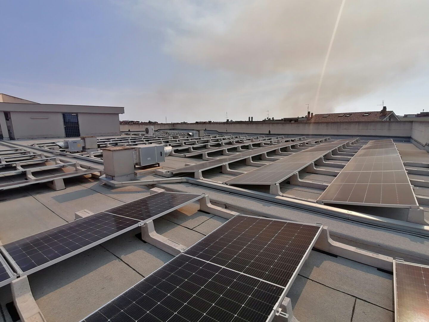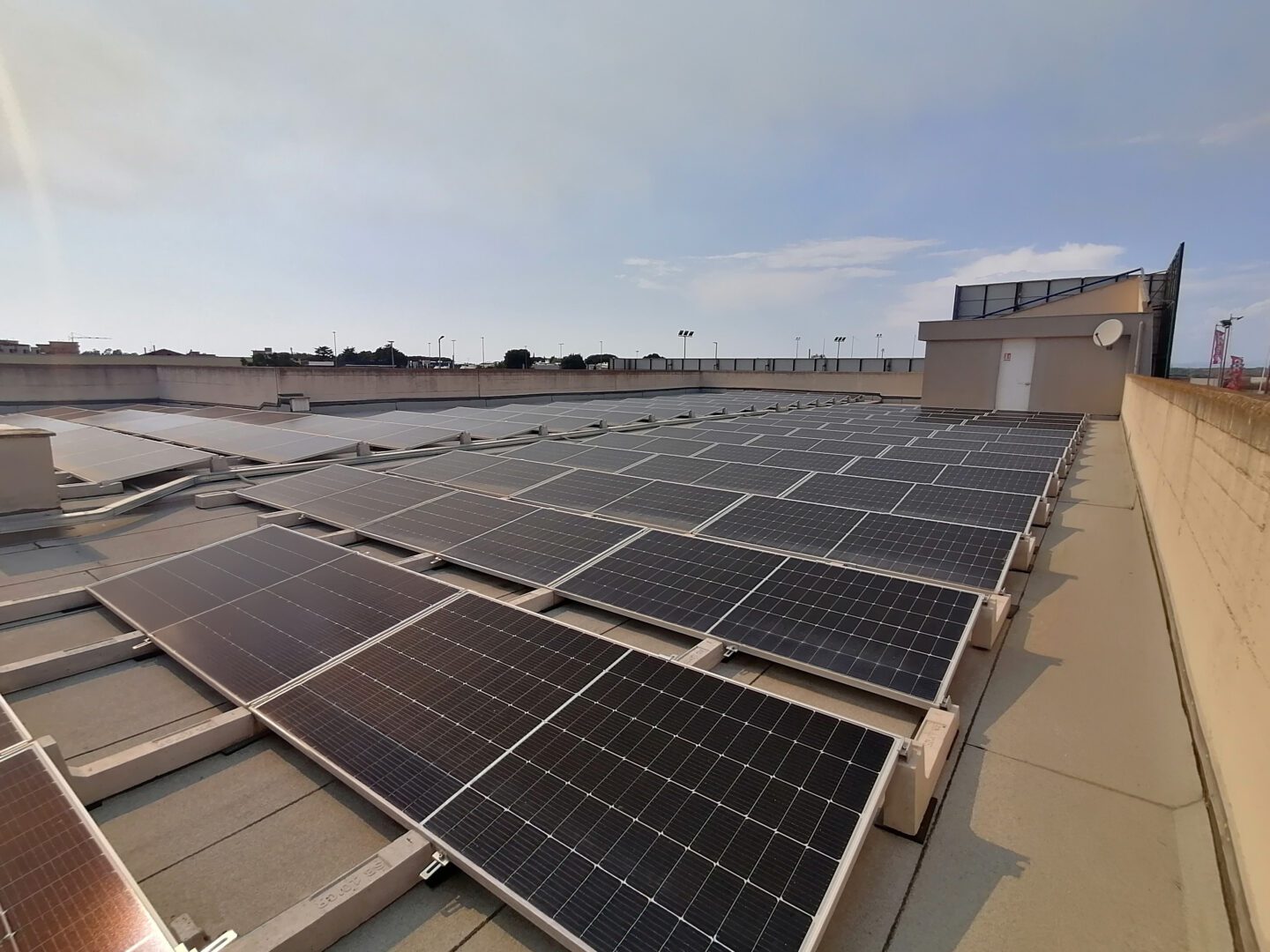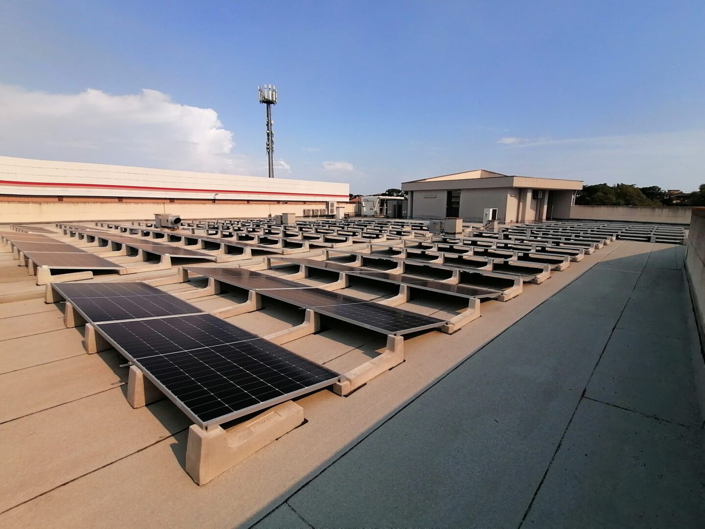 Die auf dem Foto sichtbare 80 kW-Anlage wurde von unserem Kunden Arcadia Italia S.p.A. in Rom gebaut. mit dem Connect -System 10°, einem System, bei dem jedes Ballast für Pv Anlage mit allen anderen in einem einzigen kollaborativen Netzwerk verbunden ist. Auf diese Weise ist es möglich, leichtere Strukturen zu verwenden und gleichzeitig eine sehr hohe Widerstandsfähigkeit gegen Witterungseinflüsse sicherzustellen und die Lasten perfekt ausgewogen zu verteilen.