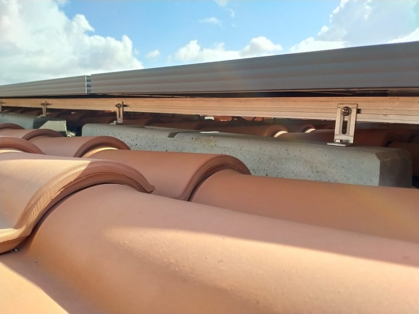 Die Sun Ballast-Strukturen erfordern keine Löcher im Dach, daher ist es ausreichend, sie zu verlegen und die darüber liegenden Paneele in den bereits auf dem Ballast vorhandenen Löchern zu befestigen.