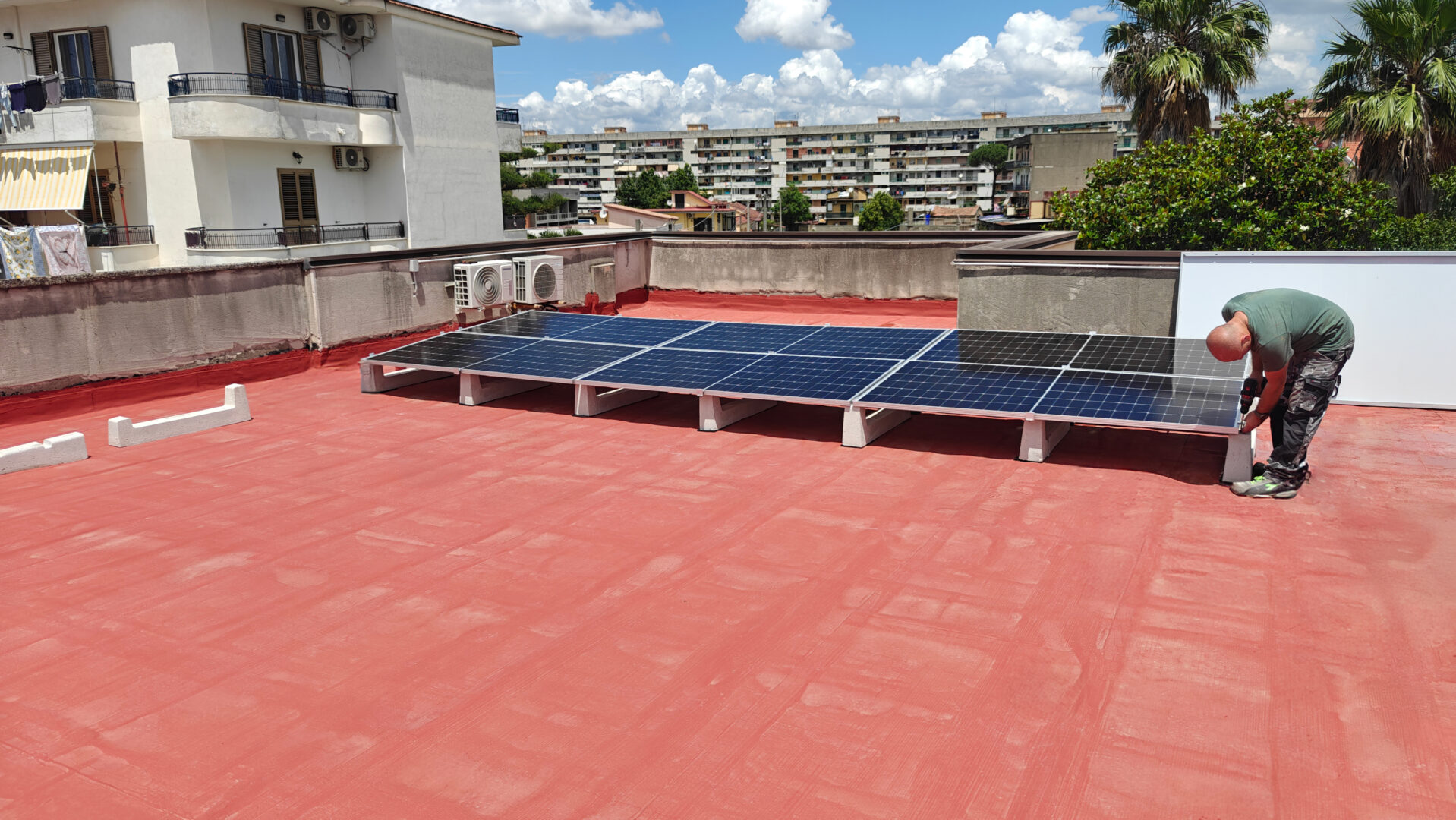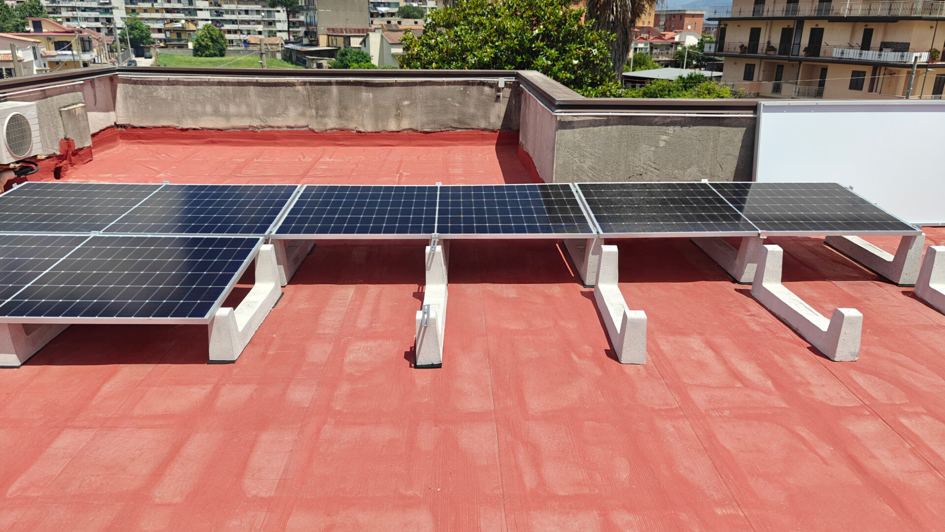 In diesem 6-kW-System – das in Acerra (Neapel) von unserem Kunden Dim Solution srl gebaut wurde – wurde das Segelförmiges System 5° tatsächlich durch Hinzufügen von No-Flex montiert: Dieses Zubehör, das aus einem zusätzlichen Ballaste für Pv Anlage und einer speziellen Metallhalterung besteht, ermöglicht die Befestigung des Moduls auch am Mittelteil, bietet zwei zusätzliche Auflagepunkte und reduziert das Risiko einer Biegung auf Null. Das No-Flex-Kit lässt sich problemlos mit allen Systemen mit horizontaler (oder querformatiger) Panelinstallation verwenden und berücksichtigt die von den Modulherstellern angegebenen Unterstützungsparameter.