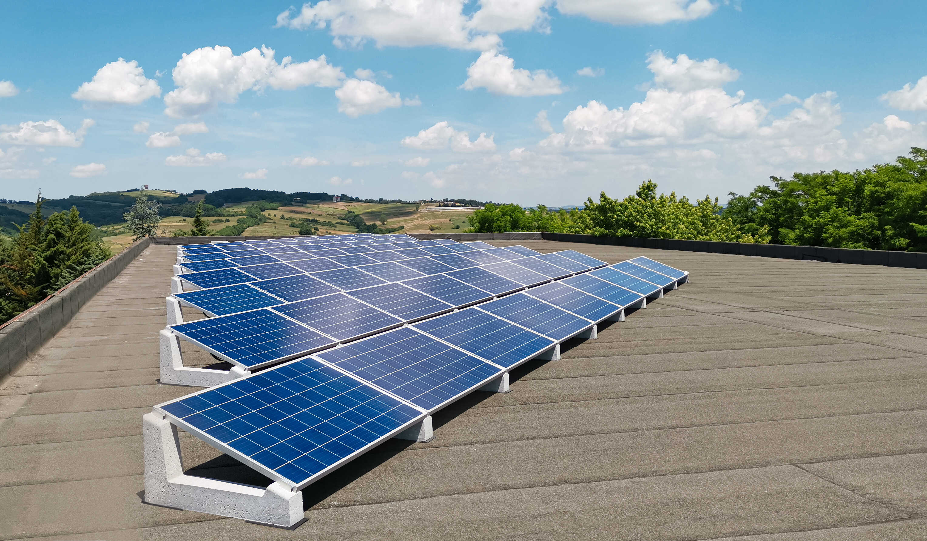 Auf einem Flachdach eines Gebäudes wurde dank die Montage von Sun Ballast eine Photovoltaikanlage errichtet.