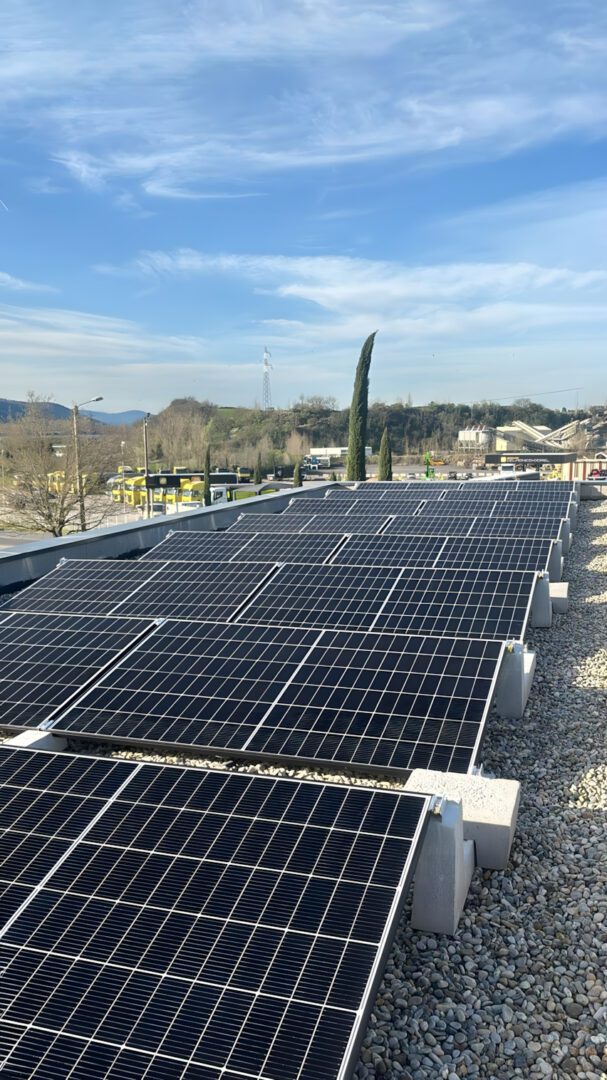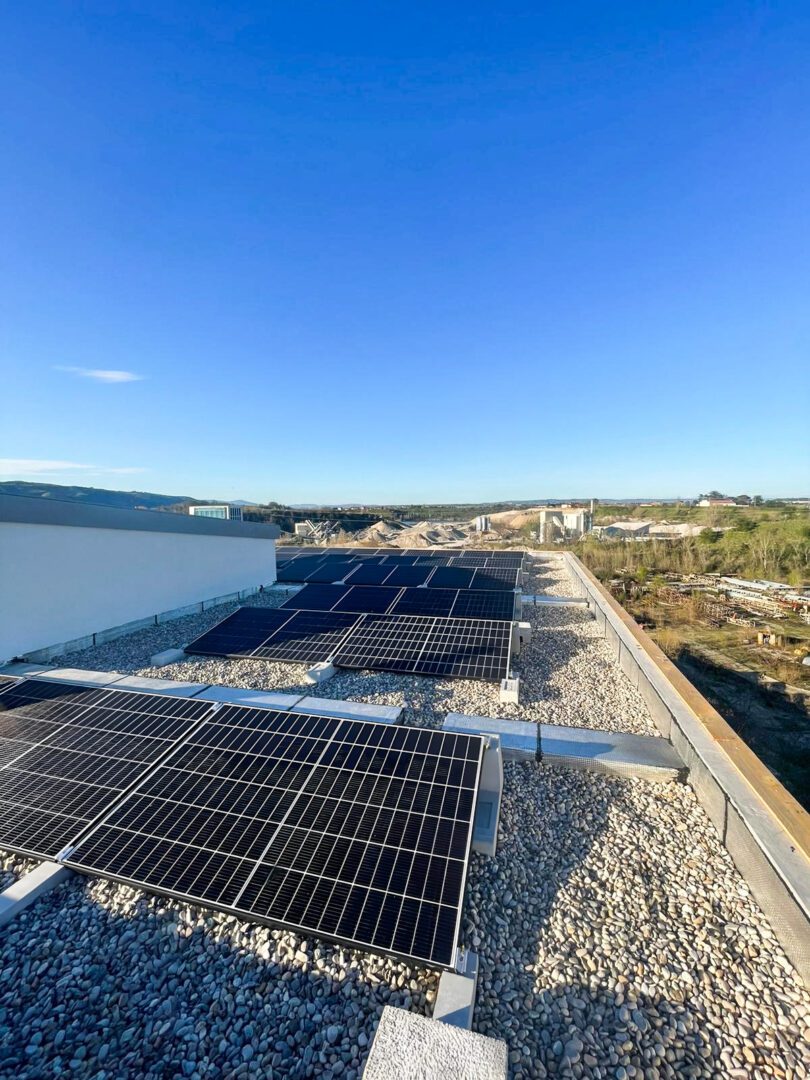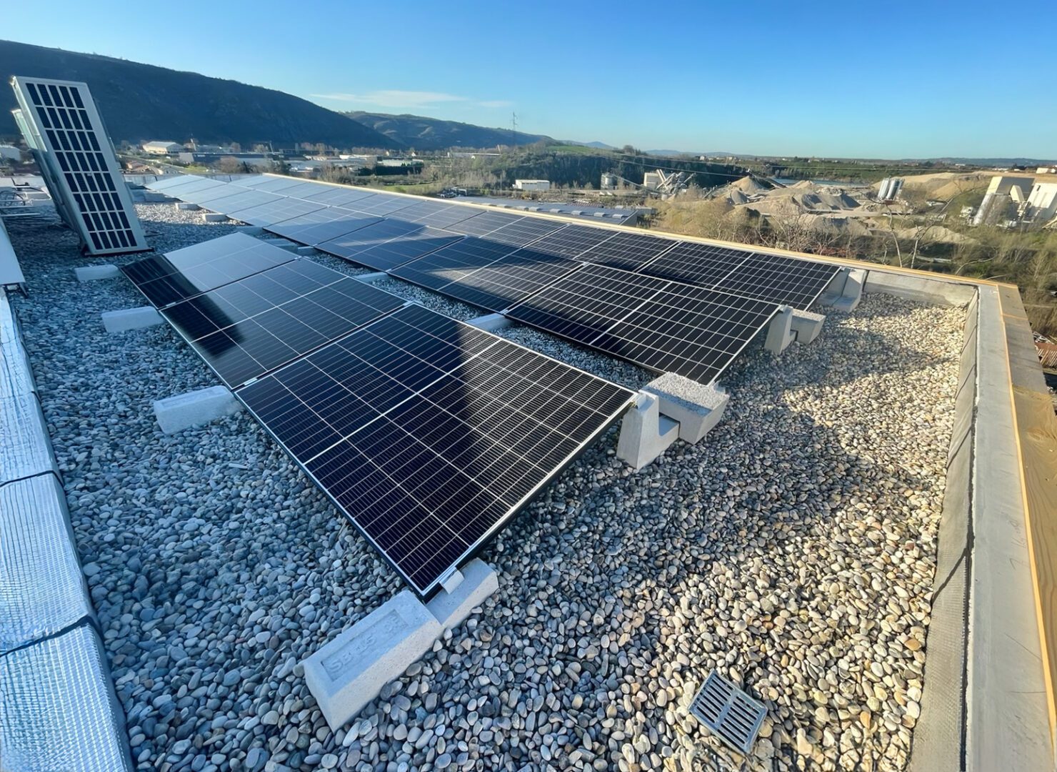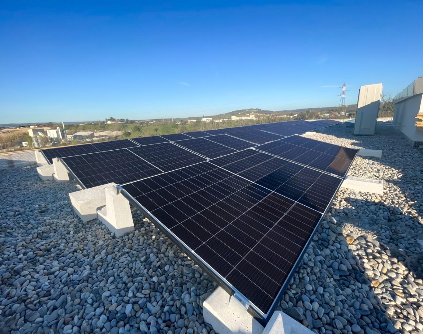 Bei diesem System ist jedes Photovoltaik-Ballast mit allen anderen in einem einzigen zusammenarbeitenden Netzwerk verbunden, wodurch ein sehr hoher Windwiderstand erzeugt und die Lasten über die gesamte Dachfläche verteilt werden. Die auf dem Foto sichtbare 29-kW-Photovoltaikanlage wurde in Andacette (Frankreich) von unserem Kunden Etera Sarl gebaut: Die Montage erfolgte auf einem flachen Kiesdach, und die Sun Ballast-Photovoltaikstrukturen benötigten keine Befestigungslöcher, sondern wurden einfach platziert Dadurch werden Installationszeiten und –kosten auf ein Minimum reduziert.