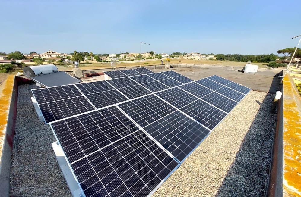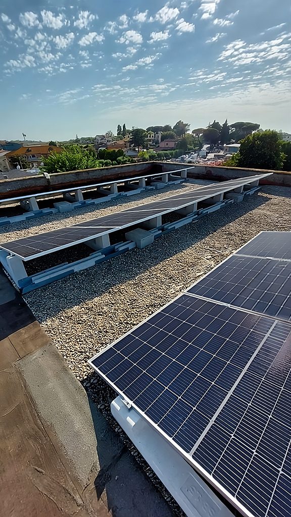 Die auf dem Foto sichtbare 6-kWp-Photovoltaikanlage wurde von der HM3 Service Group s.r.l. erstellt. auf einem flachen Kiesdach in Fiumicino (RM) mit Photovoltaik-Ballast von Sun Ballast. Photovoltaikkonstruktionen aus Beton bieten zahlreiche Vorteile, angefangen bei der Einfachheit bis hin zur Verkürzung der Installationszeiten: Für die Installation sind keine Löcher im Dach erforderlich, die Befestigungshülsen sind bereits im Beton vormontiert und die Installation ist bei jedem Typ schnell und einfach von flacher Oberfläche.