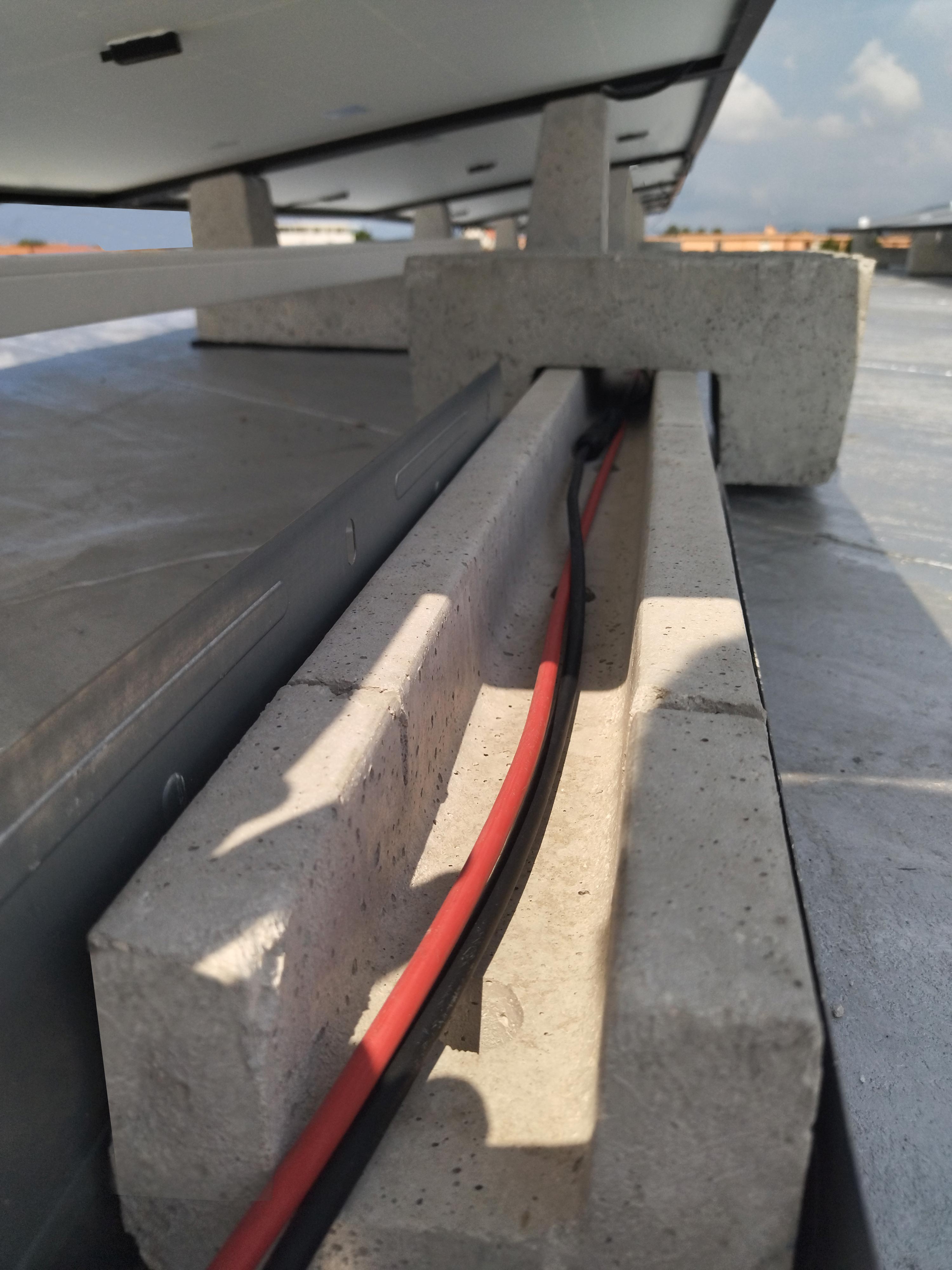 Das InstalMat-Photovoltaiksystem hat eine Leistung von 4,5 kWp erreicht, und durch die Hinzufügung des innovativen Cablowind-Systems wurde das System noch professioneller: Cablowind vereint in einem einzigen Zubehör sowohl die Funktion eines zusätzlichen Gewichts als auch die eines Kanals für Elektrokabel. Auch in diesem Fall ist die Montage schnell und einfach, erfordert keine Löcher und erfolgt einfach durch die Platzierung des Kanals in den Metallführungen (befestigt an den im hinteren Teil der Beton PV Montagesysteme vormontierten Buchsen). Dadurch erhöht Cablowind nicht nur die Stabilität der Anlage und den Windwiderstand, sondern ermöglicht auch eine sauberere und ordentlichere Verlegung der Elektrokabel, wodurch Photovoltaikanlagen auf Flachdächern noch solider und professioneller werden.