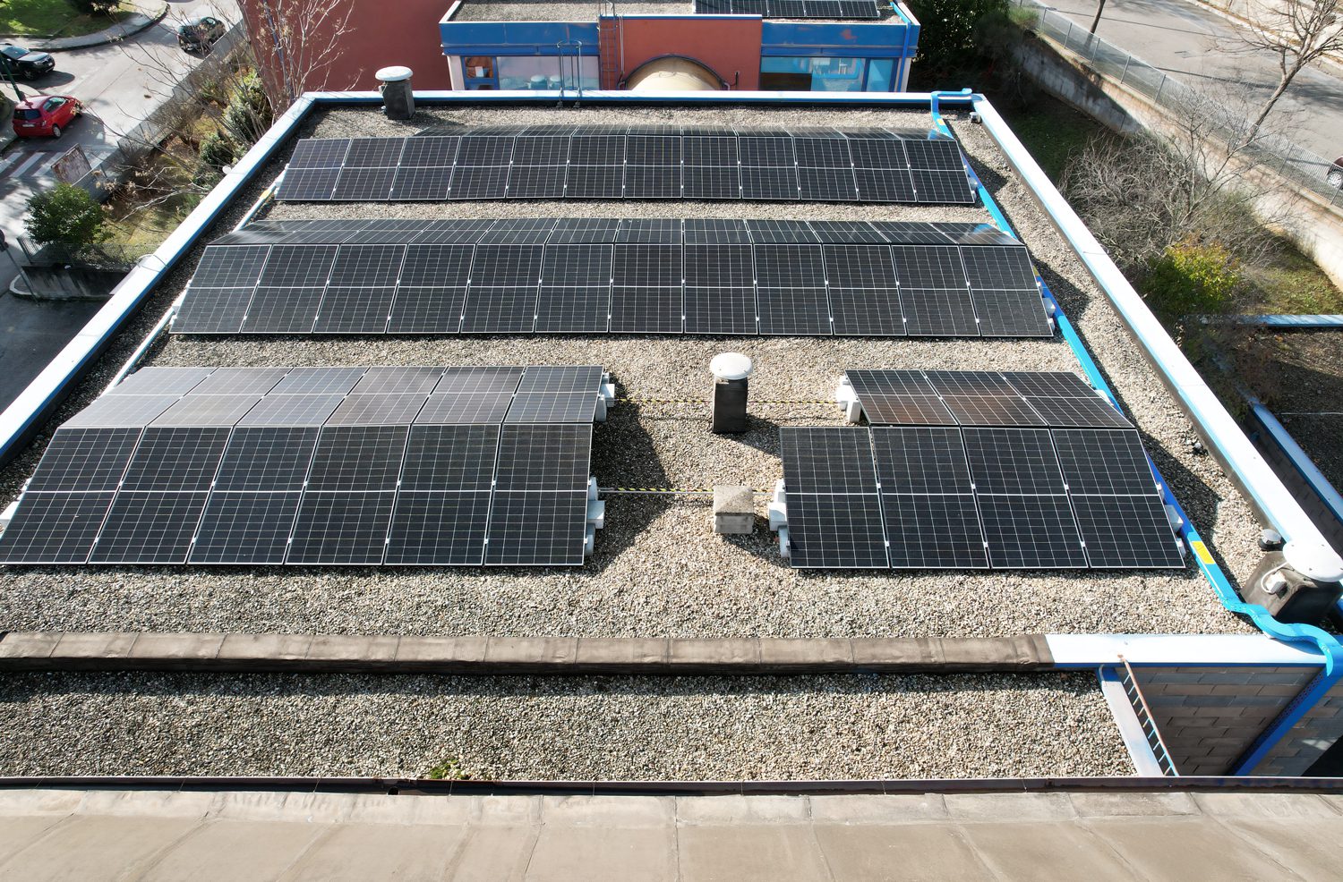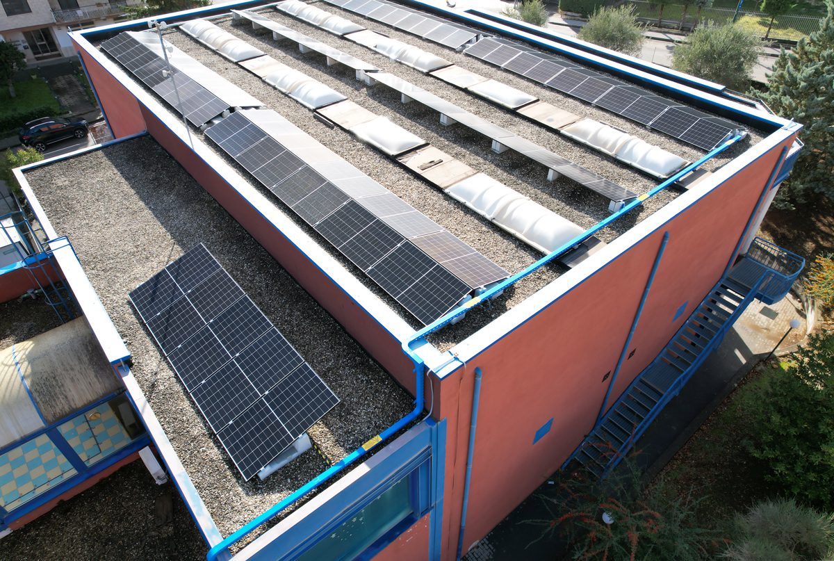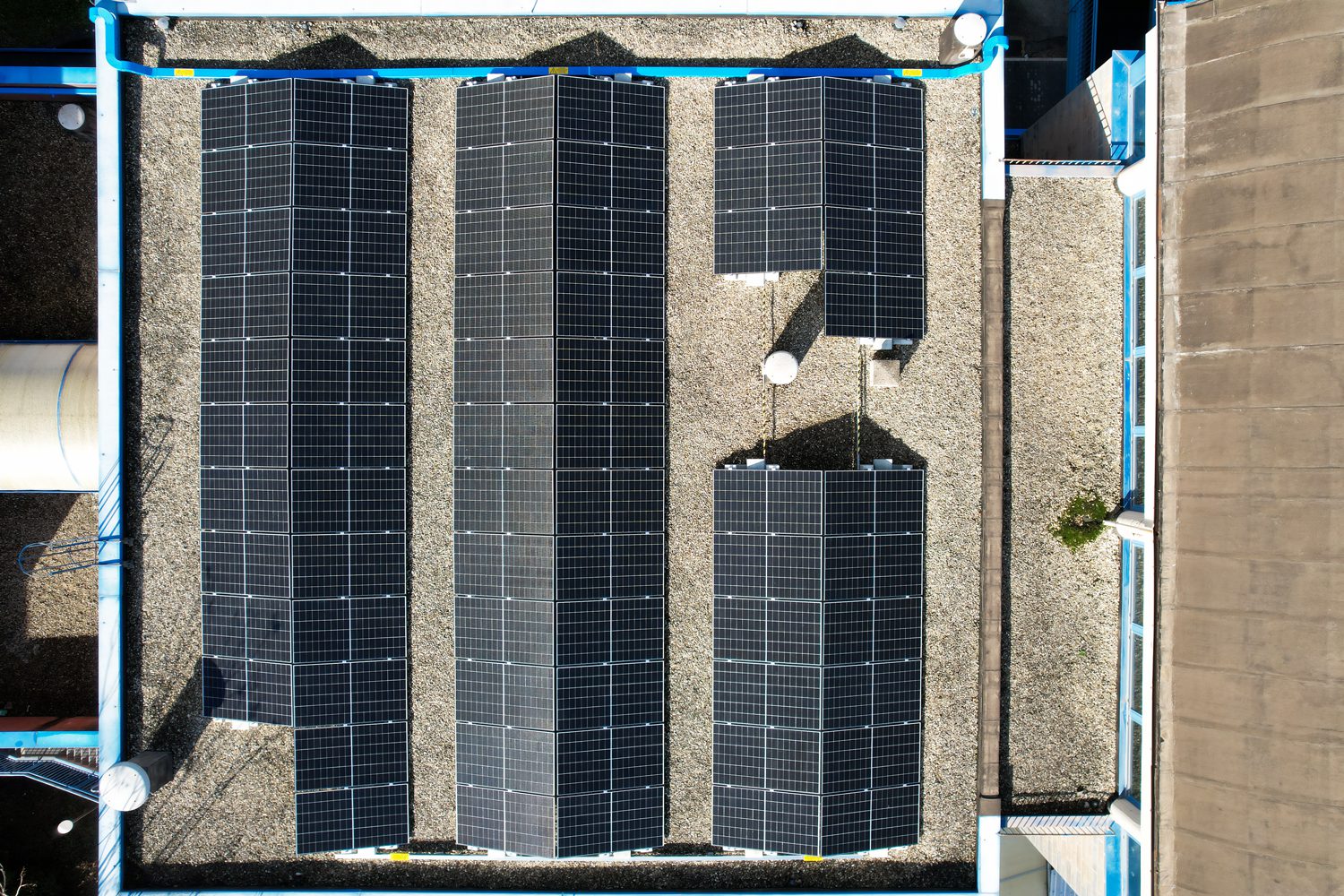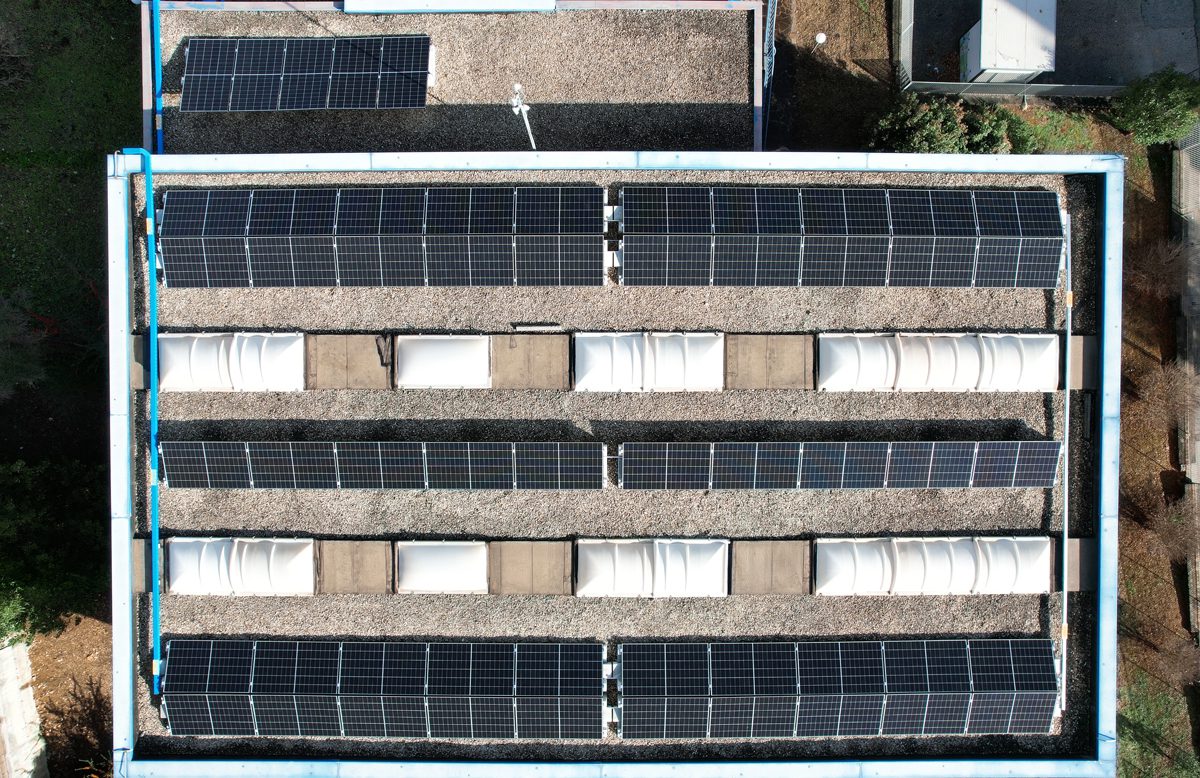 Photovoltaik-Strukturen ermöglichen nämlich die Befestigung von Photovoltaikmodulen ohne Bohren und können einfach – ohne dabei Schäden zu verursachen – auf jedem beliebigen Dachmaterial platziert werden. In diesem Fall wurden die Strukturen auf einer Kiesfläche angeordnet und die Module in Ost-West-Ausrichtung positioniert, eine ausgezeichnete Lösung, wenn es darum geht, den gesamten verfügbaren Platz auf dem Gebäude optimal zu nutzen.