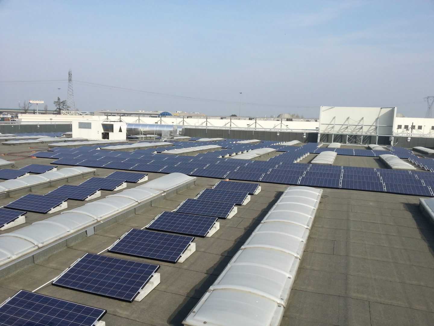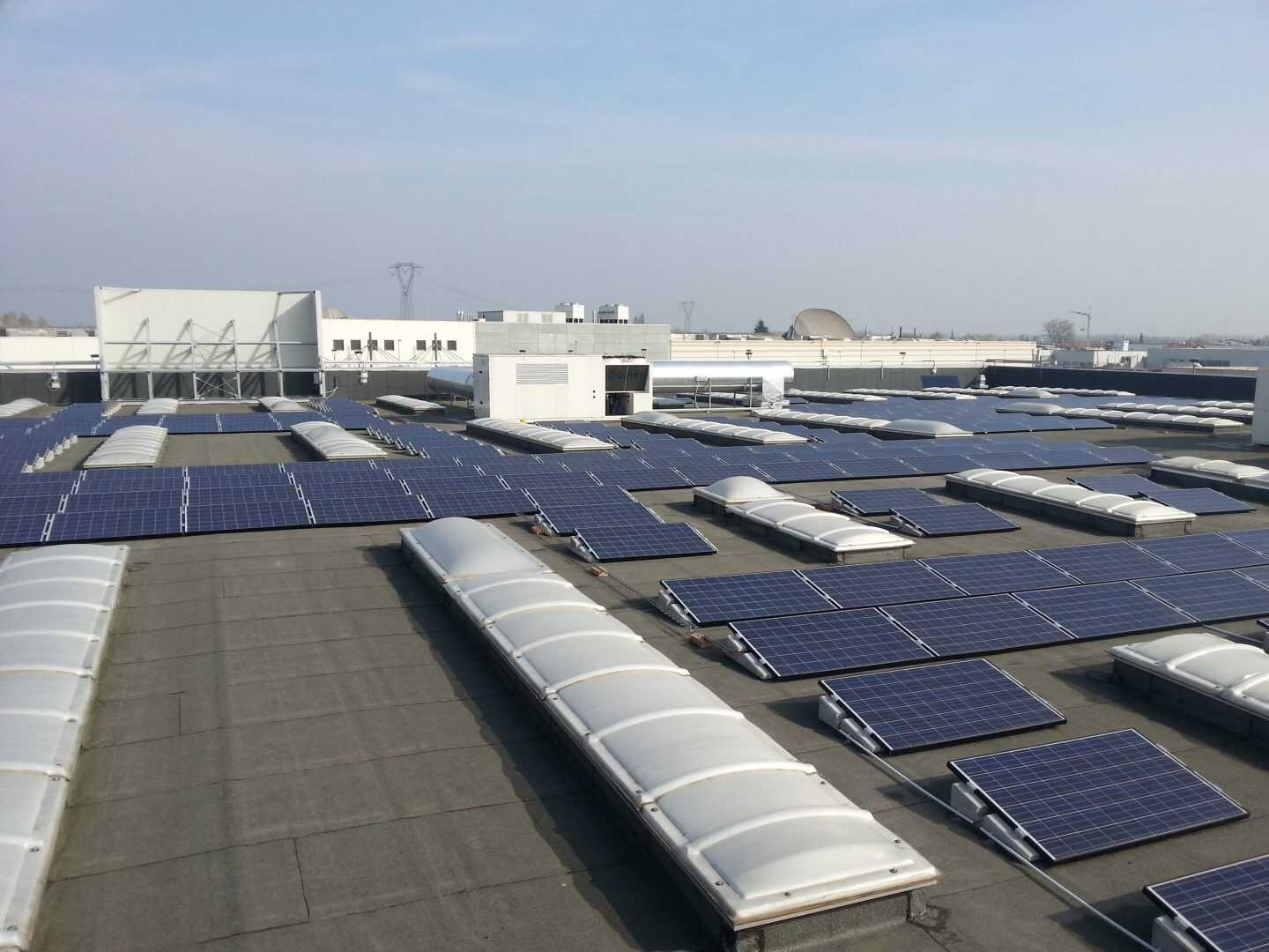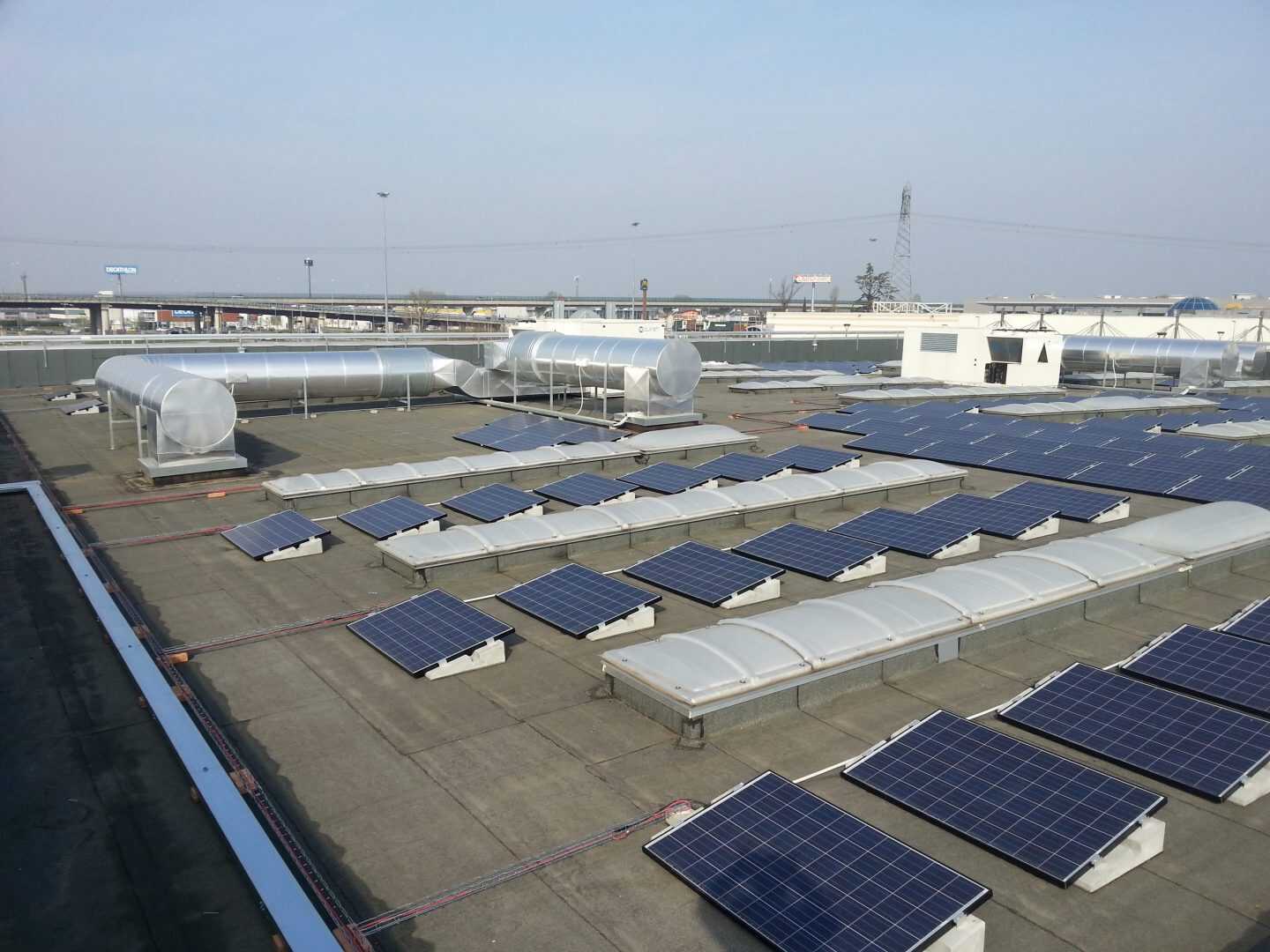 Wenn mit Flachdächern voller Hindernisse wie Oberlichter, Schornsteine, Klimaanlagen, etc. konfrontiert, die Standard-Einreihenlösung ist die beste Lösung, weil es Ihnen erlaubt, die Platten Anpassung der Struktur an die verfügbaren Räume zu positionieren.