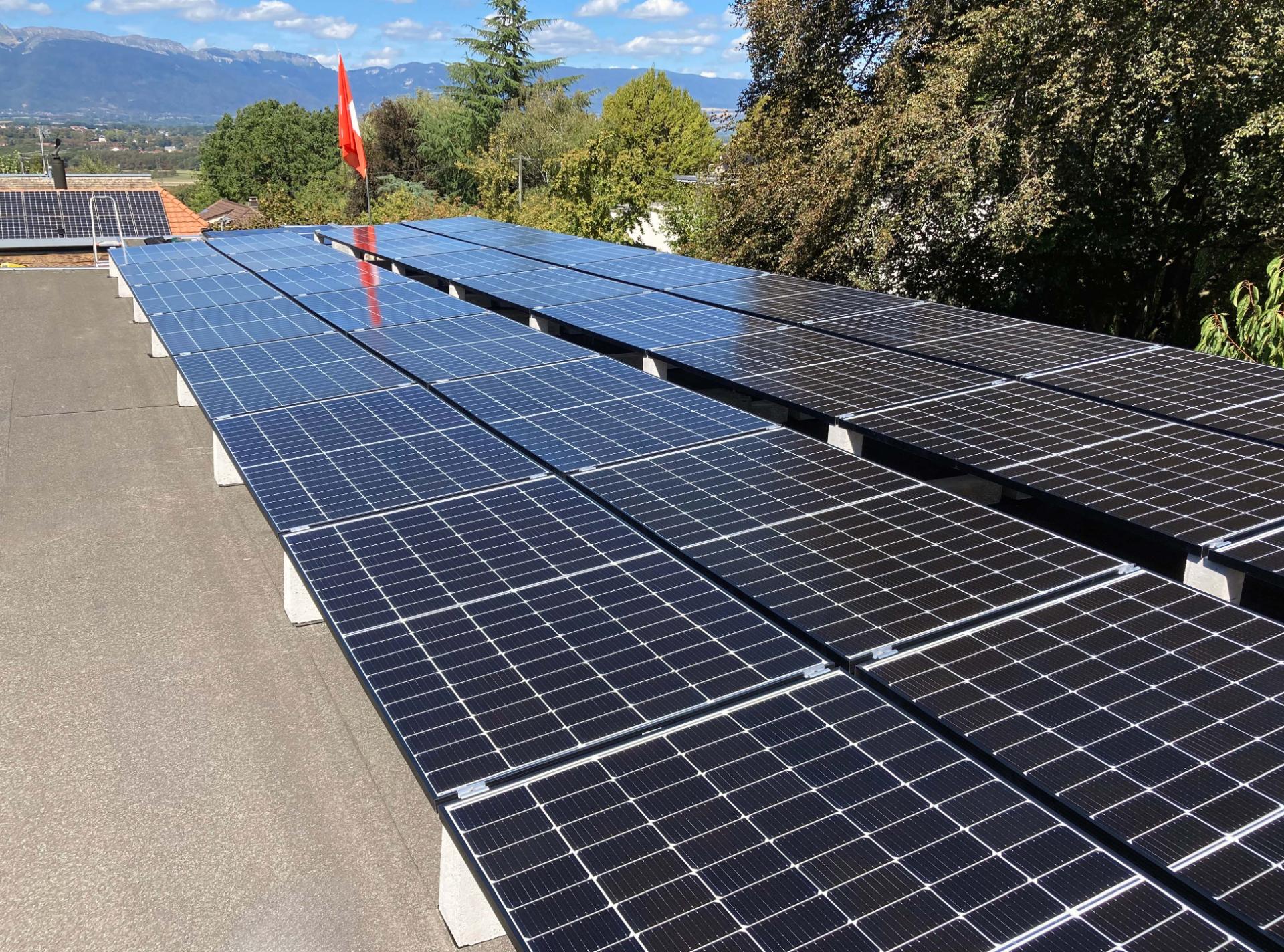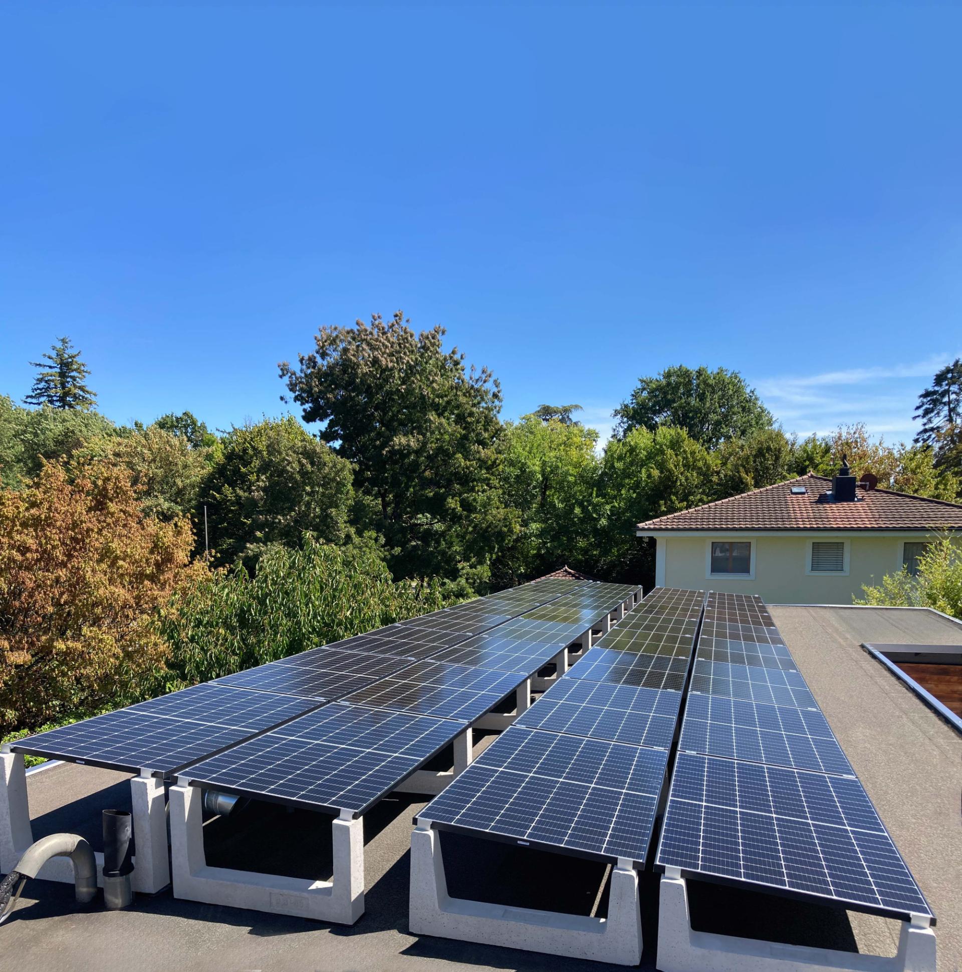 Die auf dem Foto sichtbare 12-kWp-PV-Anlage wurde von unserem Kunden Mechkat Bouldin Architectes auf dem Flachdach eines Gebäudes in Le Grand-Saconnex, Schweiz, errichtet und dank der Photovoltaik-Ballaste von Sun Ballast konnte die Installation mit minimalen Installationszeiten durchgeführt werden Dadurch werden Löcher im Dach vermieden und eine einfache Anpassung an die spezifischen Eigenschaften der Dacheindeckung ermöglicht.