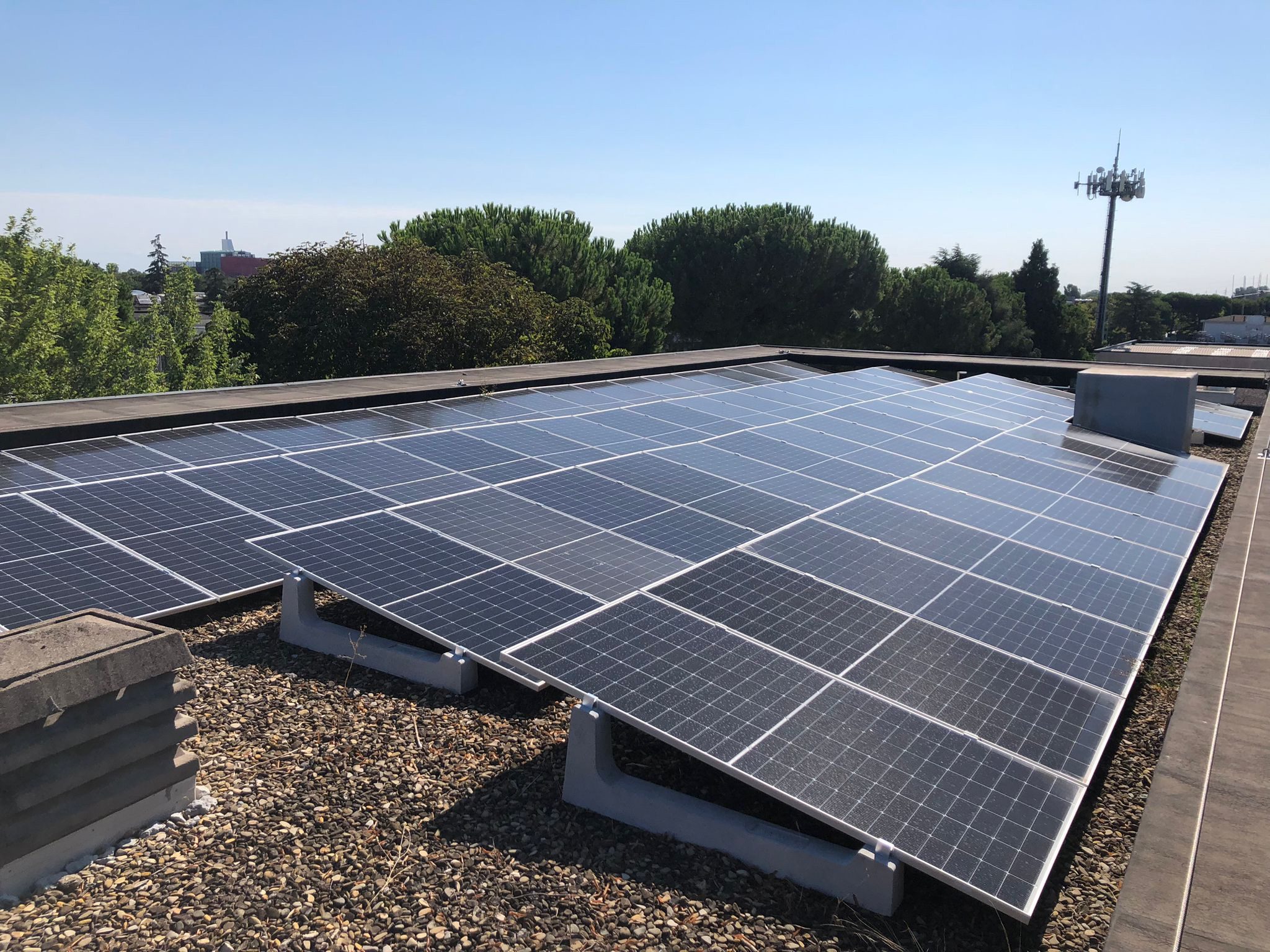 Die auf dem Foto sichtbare knapp 40 kWp Photovoltaikanlage wurde von unserem Kunden O.E.M.A. mit großen Panels installiert. di Morelli Marco & C. auf einem flachen Kiesdach in Forlì, und dank des Einzelreihe System 10°L von Sun Ballast war die Installation sehr einfach. Tatsächlich ermöglicht dieses spezielle Photovoltaik-Ballastelemente die vertikale Befestigung der Module, bietet eine hohe Belastungsfestigkeit und respektiert alle von den Herstellern angegebenen Stützparameter: ein großer Vorteil, der es ermöglicht, auch Photovoltaik-Module unterschiedlicher Größe in völliger Sicherheit zu handhaben.