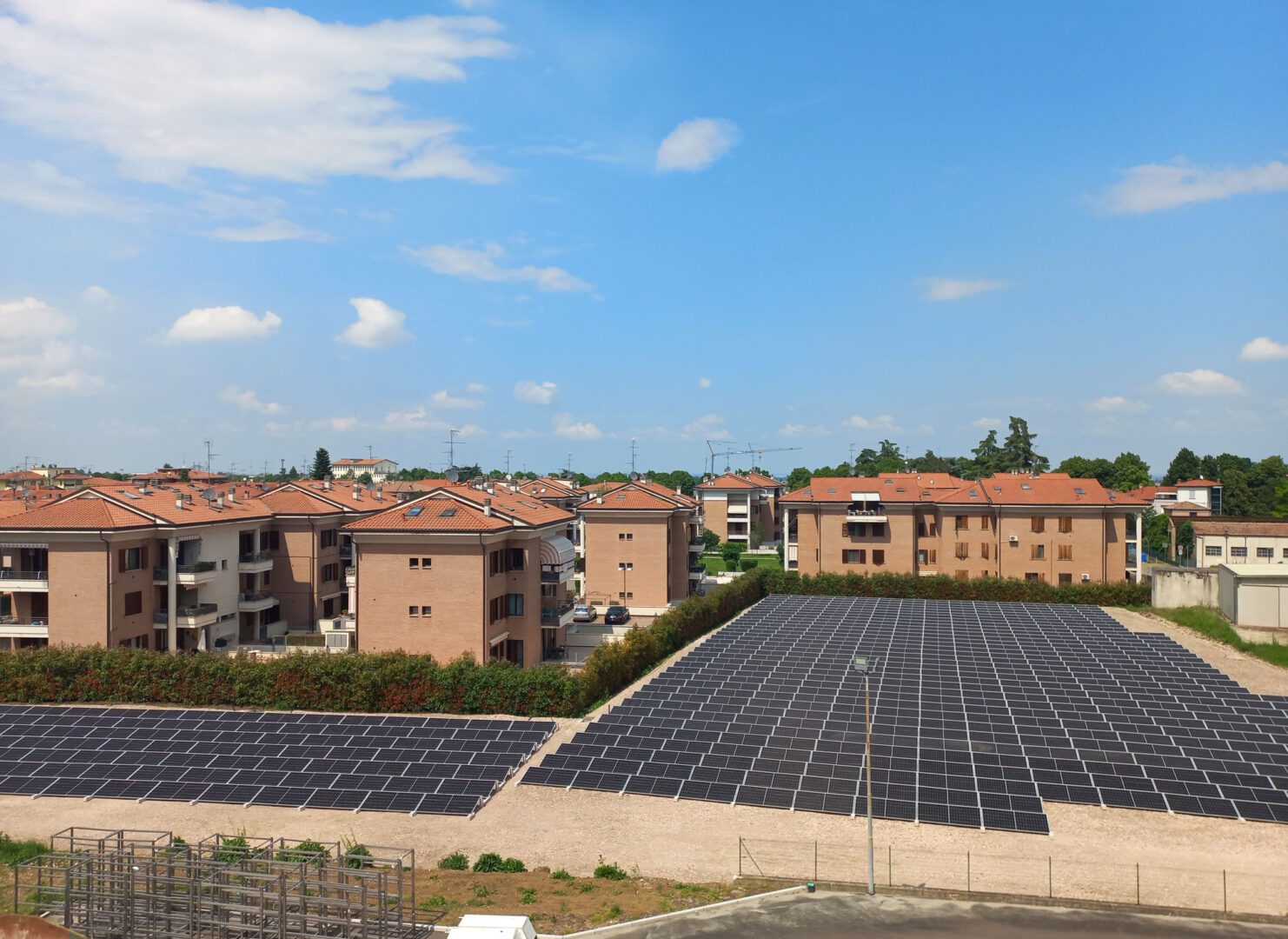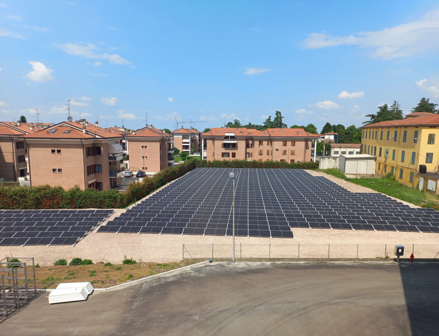 Die auf dem Foto sichtbare 360-kW-Anlage wurde in der Provinz Parma von unserem Kunden Orio Elettra Srl mit dem Connect System 20° gebaut, einem netzförmigen Montagesystem, bei dem jedes Ballast in einem einzigen Gitter mit allen anderen verbunden ist. Diese Konfiguration ermöglicht den Einsatz leichterer und handlicherer Strukturen und verteilt die Windlast und das Gewicht des Systems über das gesamte Gitter.