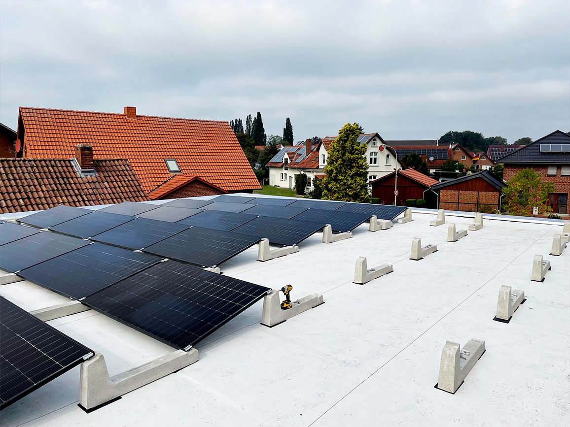 Die auf dem Bild zu sehende 29 kW Anlage wurde von unserem Kunden Rehburg Elektrotechnik auf dem Flachdach der Garage eines Wohnhauses in Petershagen (Deutschland) erstellt und ermöglichte durch den Einsatz des Connect- Systems 15° eine optimal ausgewogene Lastverteilung über die gesamte Dachfläche. Bei diesem System sind sämtliche Photovoltaikstrukturen in einem einzigen Netz miteinander verbunden und die Belastungen durch Witterungseinflüsse werden auf das gesamte Ballastnetz umverteilt.