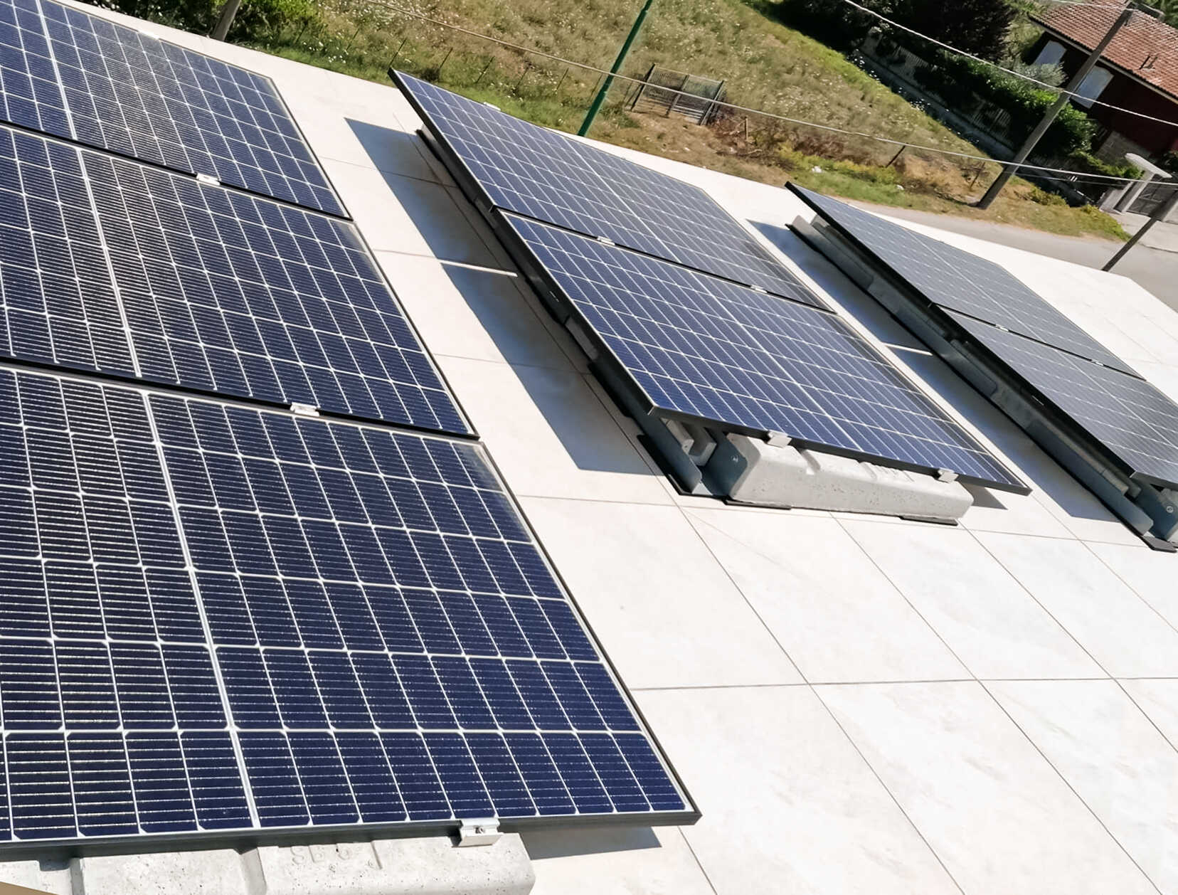 In kurzer Zeit ist es möglich, eine Photovoltaikanlage auch auf ebenen Oberflächen zu installieren. Unsere Systeme werden nämlich einfach auf den Boden gelegt, ohne dass Löcher oder Befestigungen gebohrt werden müssen, wodurch die Abdeckung ohne Beschädigung intakt bleibt.