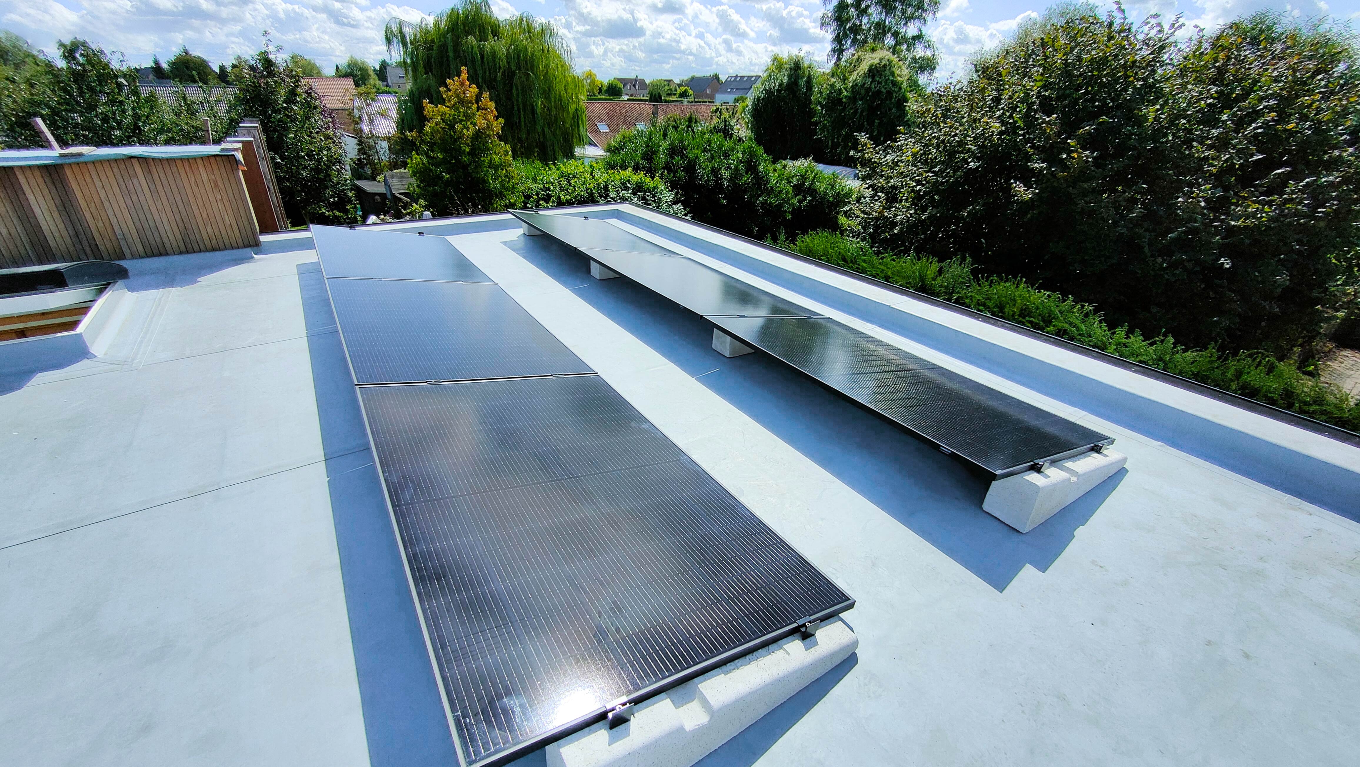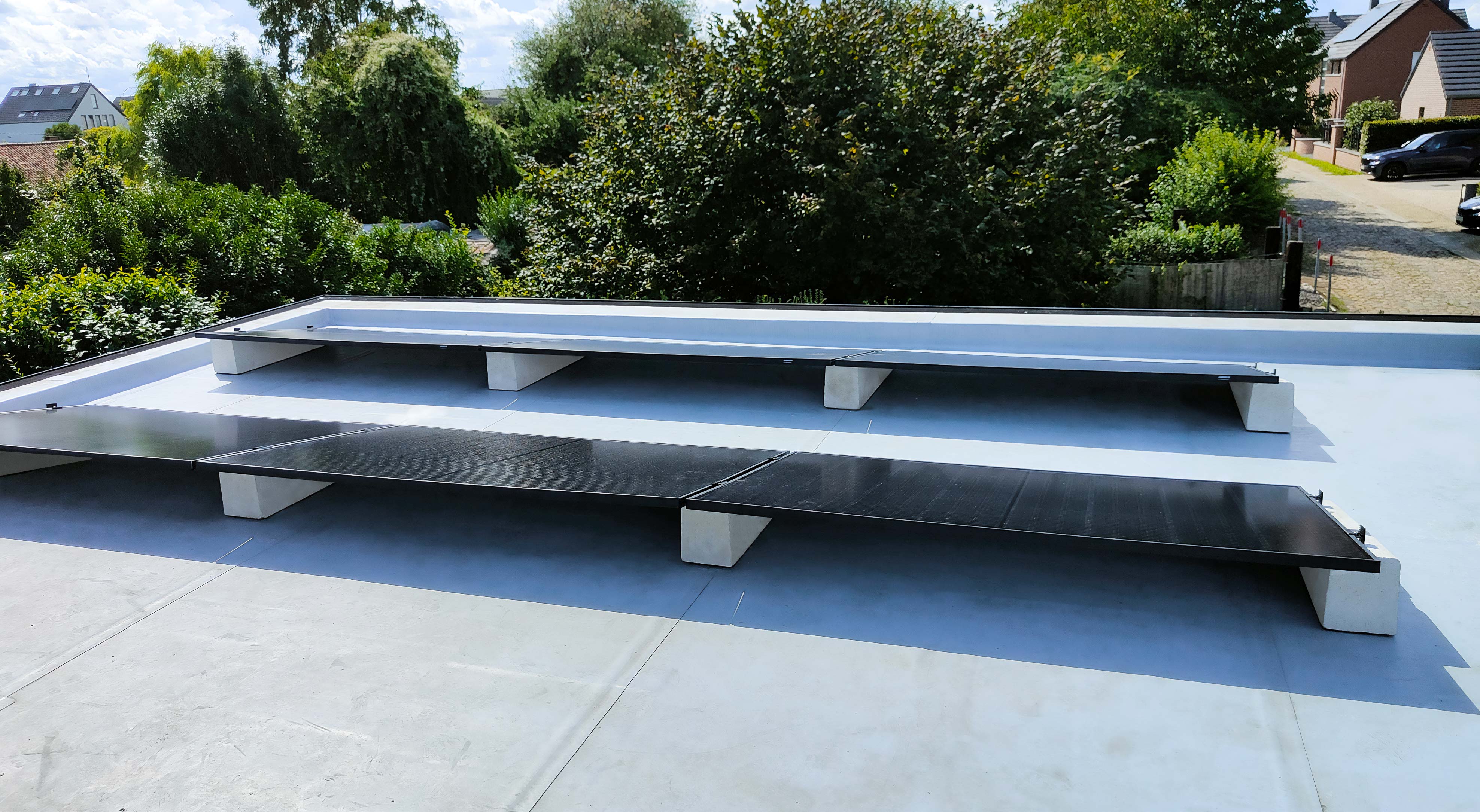 Eines der Hauptziele von Sun Ballast ist die Bereitstellung von Unterstützungssystemen, die die Realisierung von Photovoltaikanlagen immer einfacher, schneller und zugänglicher machen, nicht nur in großen Industrieumgebungen, sondern auch in kleinen Wohngebieten. Die auf dem Foto abgebildete Installation wurde von SLT Enterprise in Jodoigne – einem kleinen Dorf unweit von Brüssel – auf dem Flachdach eines Wohnhauses durchgeführt. Dank des Einzelreihe System von Sun Ballast verlief die Installation reibungslos, schnell und sicher, ohne die Schutzeigenschaften der Dacheindeckung in irgendeiner Weise zu beeinträchtigen.