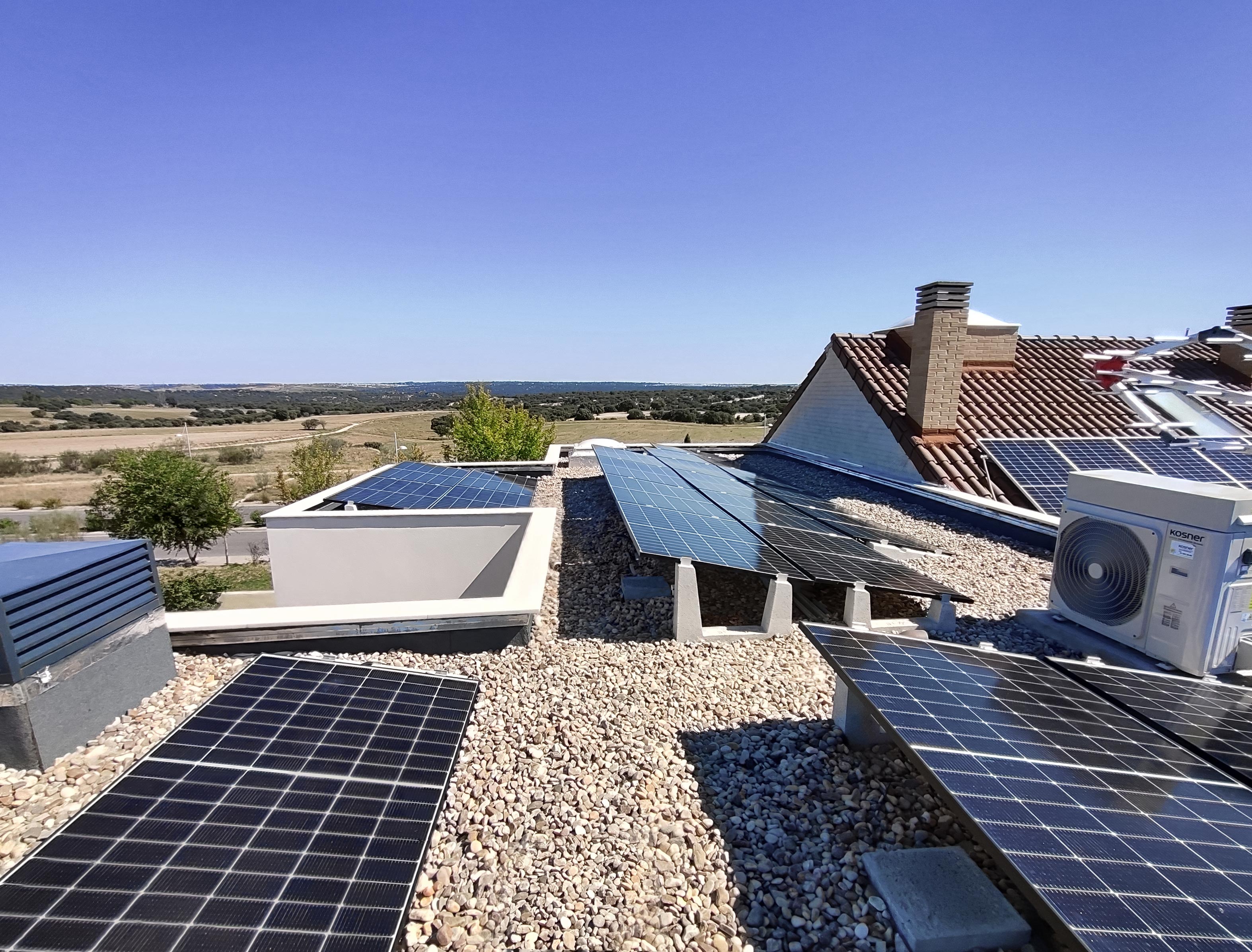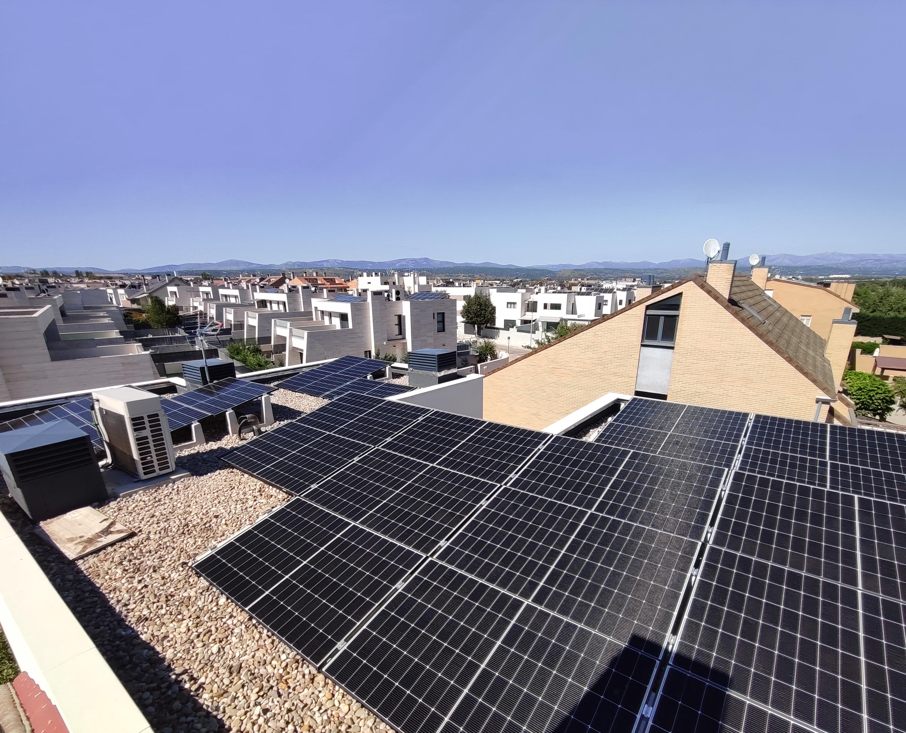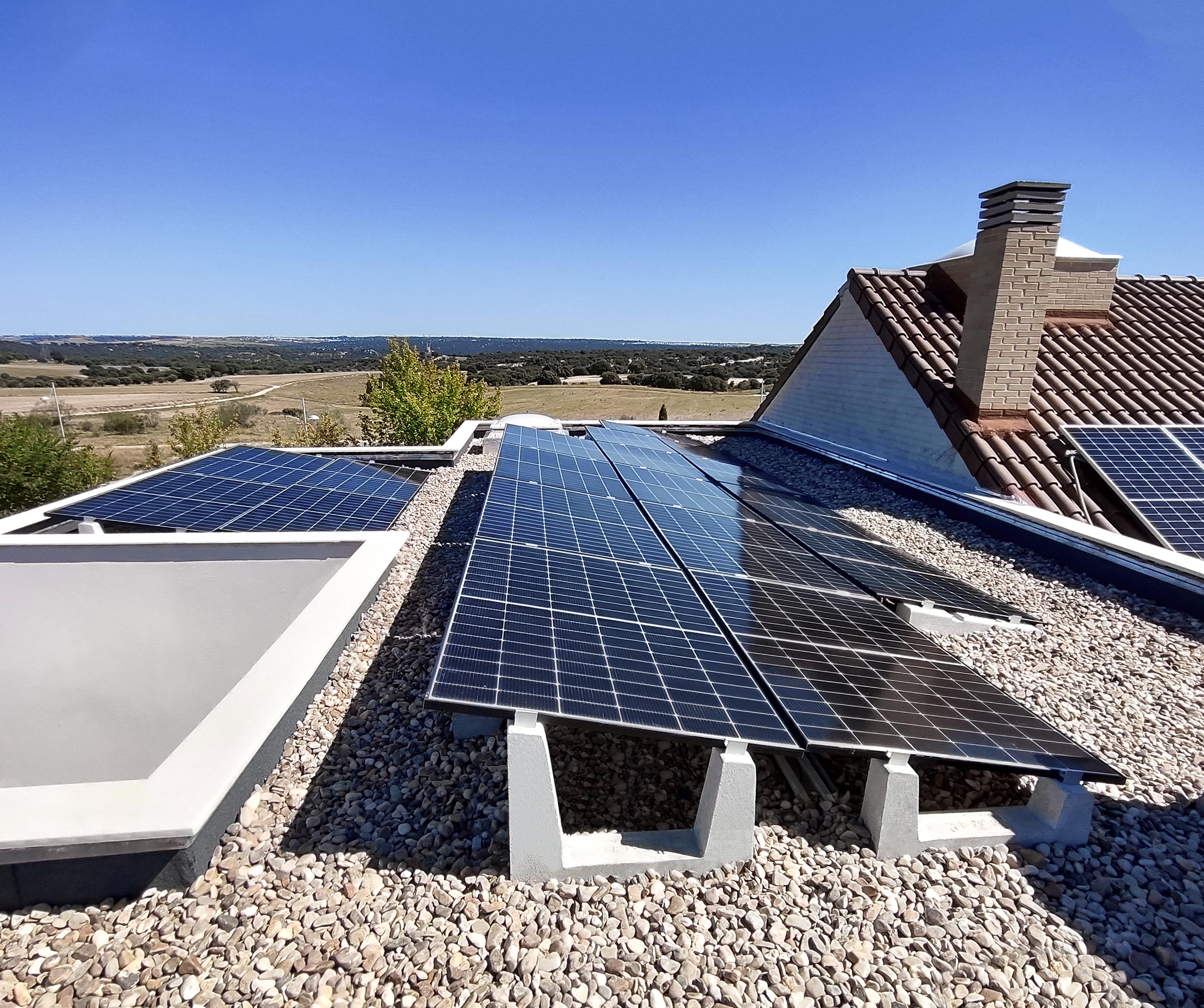 Die auf dem Foto sichtbare 11-kWp-PV-Anlage wurde von unserem Kunden Urbansolar auf dem flachen Kiesdach eines Wohngebäudes in Villanueva de la Cañada (in der Nähe von Madrid, Spanien) erstellt und dank der Betonballaste von Sun Ballast problemlos installiert Vereinfachung, Verkürzung der Installationszeiten, Vermeidung von Löchern in der Dacheindeckung und einfache Anpassung an die besonderen Eigenschaften des Daches.