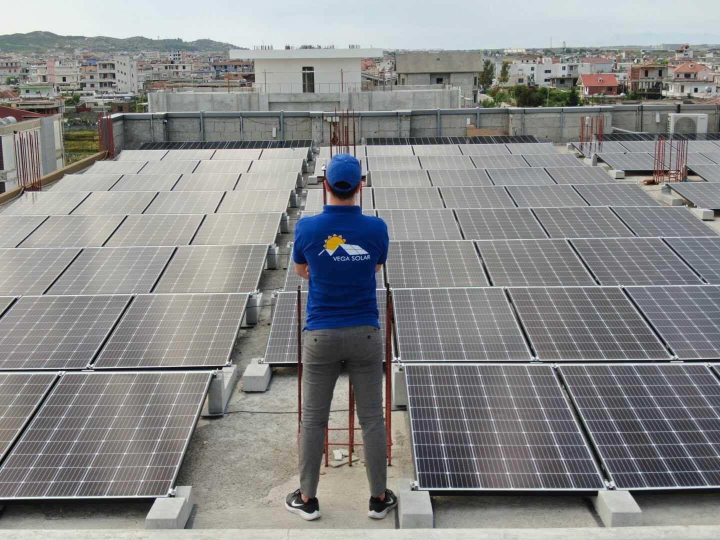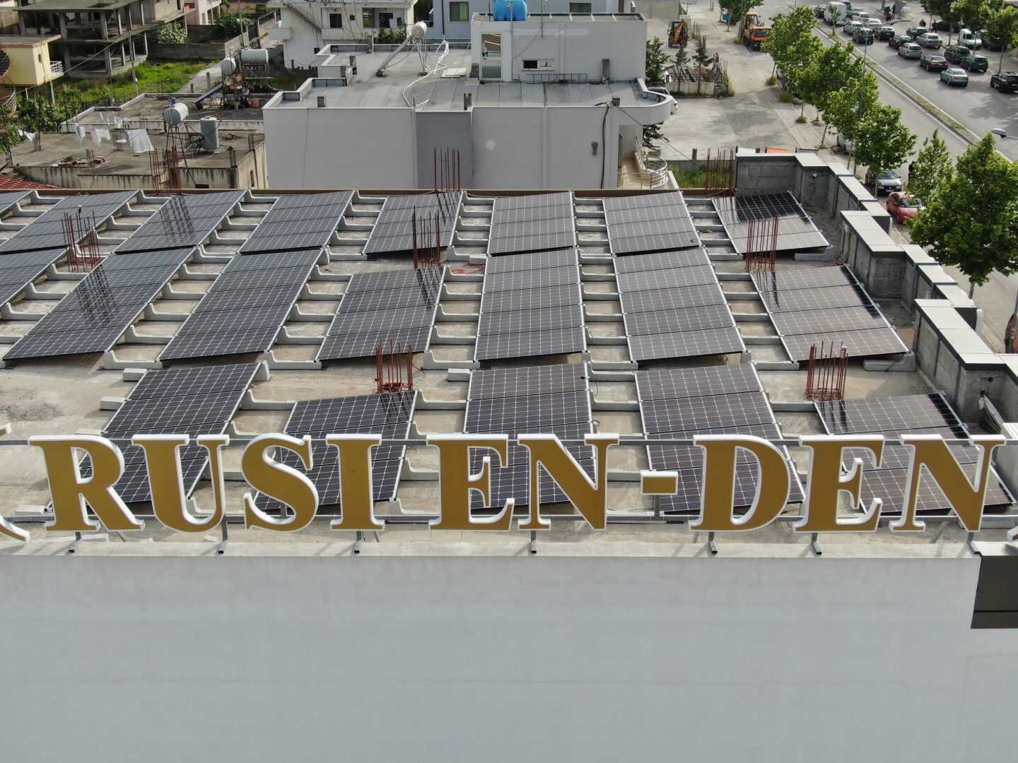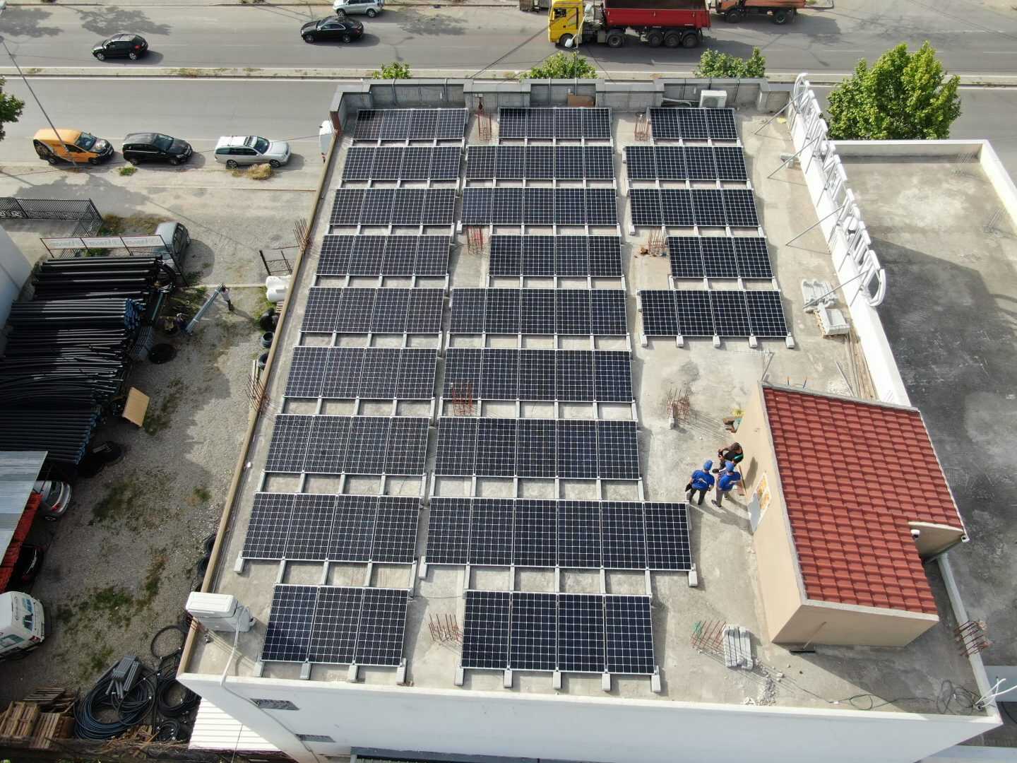 Auf dem Flachdach eines Einkaufszentrums in Albanien wurde diese Photovoltaikanlage von unserem Kunden Vega Solar mit dem Connect 10 ° Neigungssystem installiert.