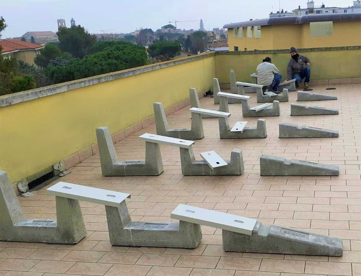 Una terraza de una casa con azulejos y con poco espacio donde se puede instalar un sistema fotovoltaico. La solución perfecta es el sistema vela Sun Ballast. Sí, porque el sistema vela así como todos los soportes de Sun Ballast no necesitan hacer agujeros en el techo para ser instalados, pero simplemente apoyarlo en la cubierta, evitando así roturas y problemas de infiltración.