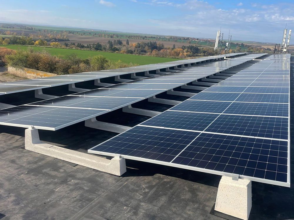 La instalación de 321 kW que se muestra en la foto fue realizada en Mšené-lázně (República Checa) por nuestro cliente EKOTEZ utilizando el sistema Industrial-XL 5°, un sistema en retícula donde cada lastra fotovoltaica está conectada con las demás en una única red interconectada.Esta configuración no solo alcanza un altísimo nivel de resistencia frente a los agentes atmosféricos, sino que también permite distribuir uniformemente los pesos sobre toda la superficie del tejado.