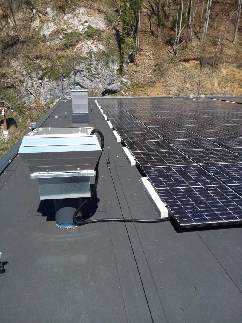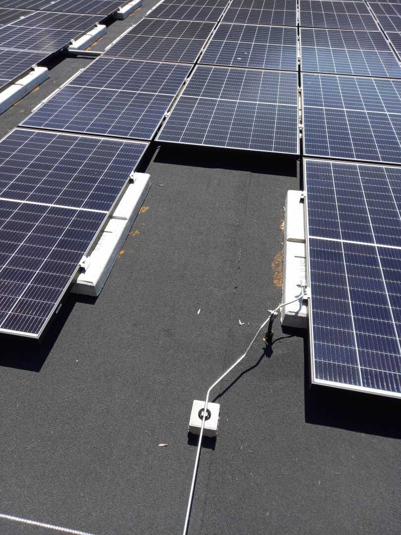 La estructura que soporta los paneles solares se colocó sobre un techo que tiene una ligera inclinación y se cubre con una tela asfaltica Sin embargo, les estructuras para fotovoltaico Sun Ballast no necesitan ser fijados en el techo, por lo que es posible evitar pinchazos pero si se quiere reducir la posibilidad de resbalones, se puede utilizar una espuma de poliuretano como se hizo en este caso. El resultado es una instalación limpia, profesional, eficiente y segura. Realmente gran trabajo