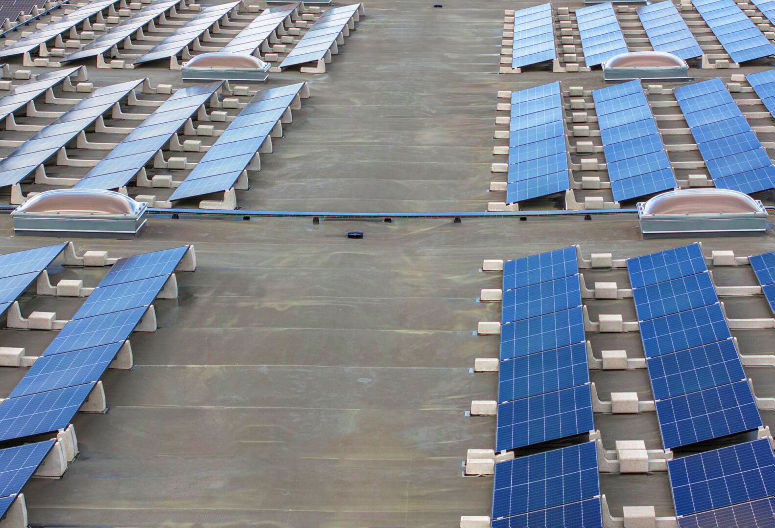 En esta gran nave industrial, los lastres fotovoltaicos del sistema Connect de Sun Ballast ofrecen una solución estable y duradera, y garantizan la máxima seguridad a todos los sistemas fotovoltaicos en techos planos, incluso en zonas con mucho viento. En este sistema, todas las estructuras para paneles fotovoltaicos están unidas entre sí en una sola red y las cargas están bien distribuidas en toda la superficie del techo.