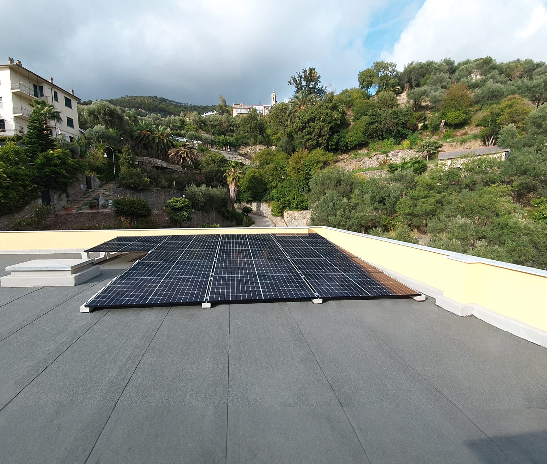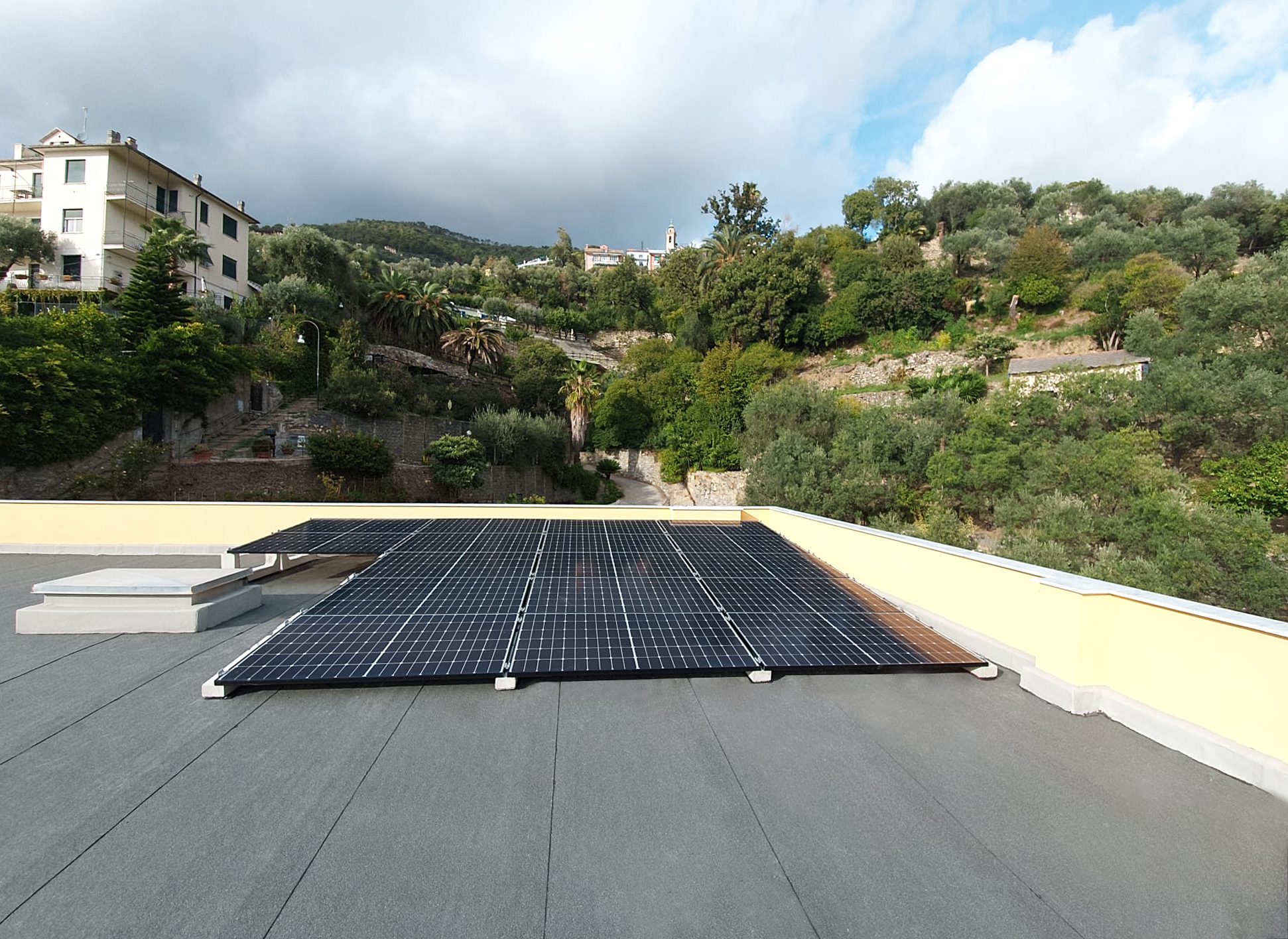 Este sistema de 6.63 kWp ha sido realizado en Génova por nuestro cliente ImpresaUno sobre una superficie plana en vaina, y el uso del sistema a Vela 5° ha permitido aprovechar al máximo todo el espacio dedicado a la instalación: modulando la altura de cada fila de paneles, la distancia entre ellos se elimina por completo, colocando las filas con una altura creciente hasta formar una «vela» de módulos extremadamente sólida, eficiente y productiva.