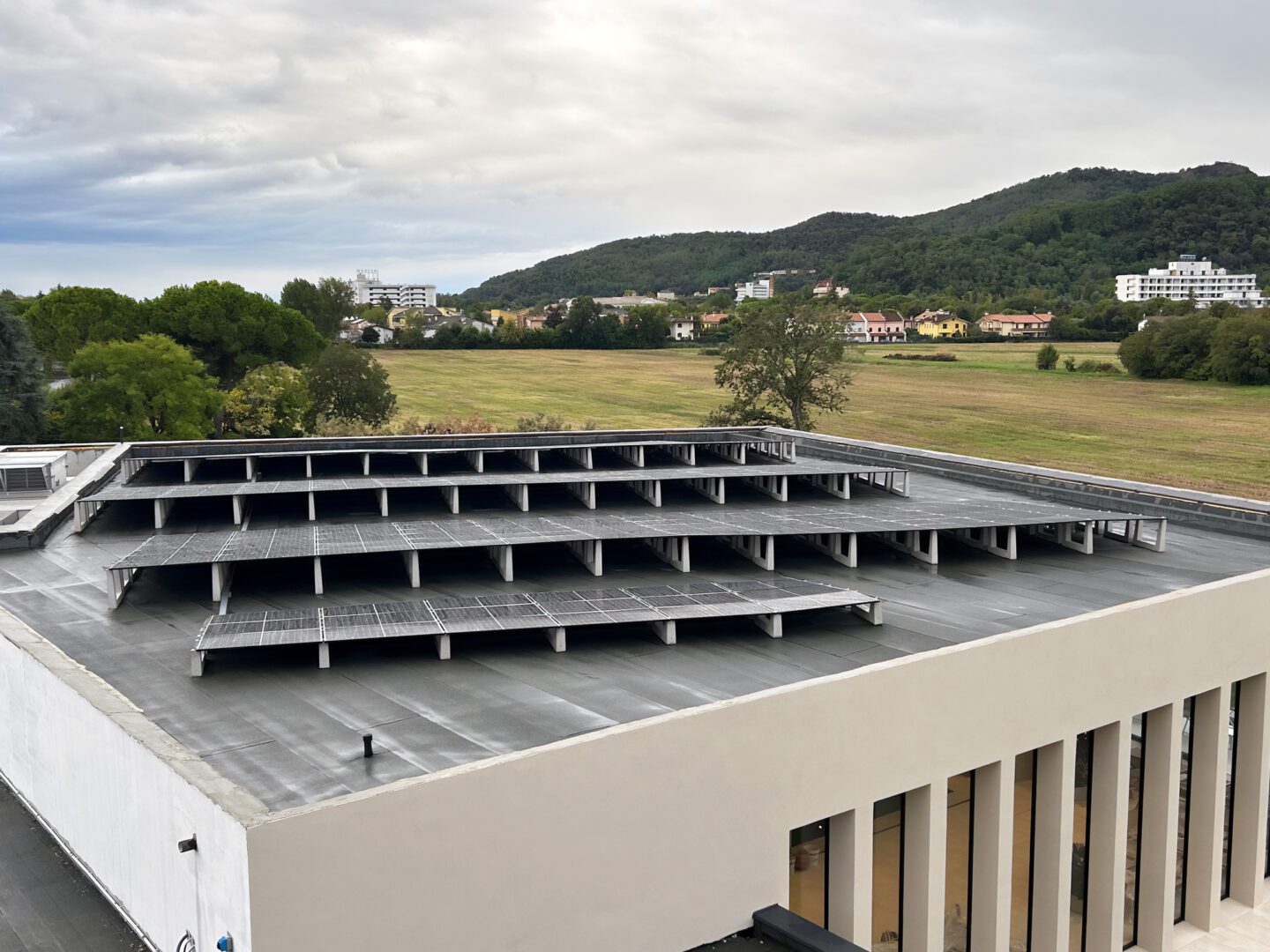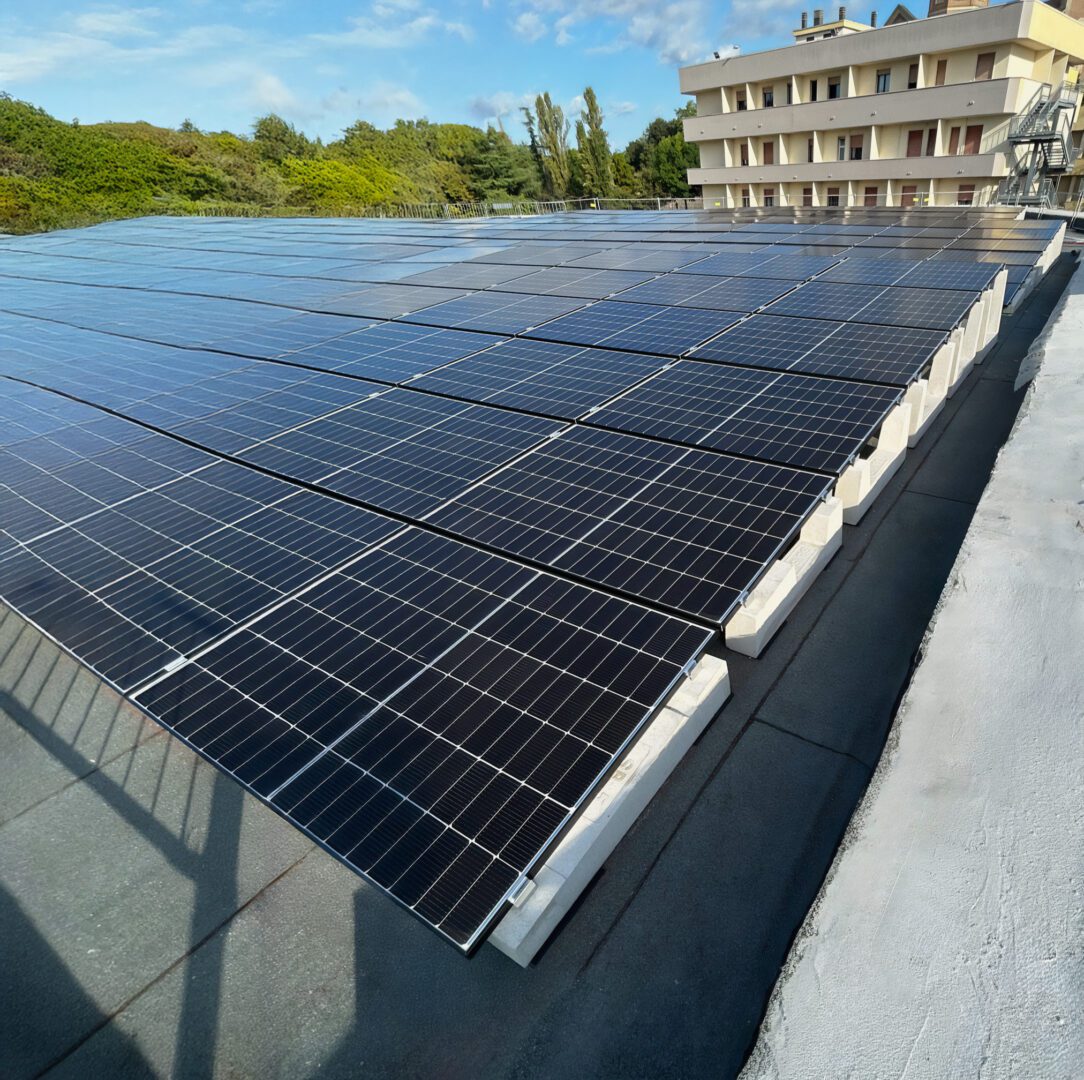 Las estructuras fotovoltaicas Sun Ballast no requieren ningún orificio de fijación, y el montaje se realiza de forma rápida y segura sin causar ningún daño a la cubierta de los edificios (en este caso una vaina ardesiata). El sistema utilizado también ha permitido aprovechar al máximo la superficie disponible: el sistema de Vela está compuesto por varios lastres de hormigón, cada uno con una altura creciente; gracias a esta configuración, Es posible colocar las filas de módulos una al lado de la otra, eliminando completamente la distancia entre ellas y optimizando los espacios.