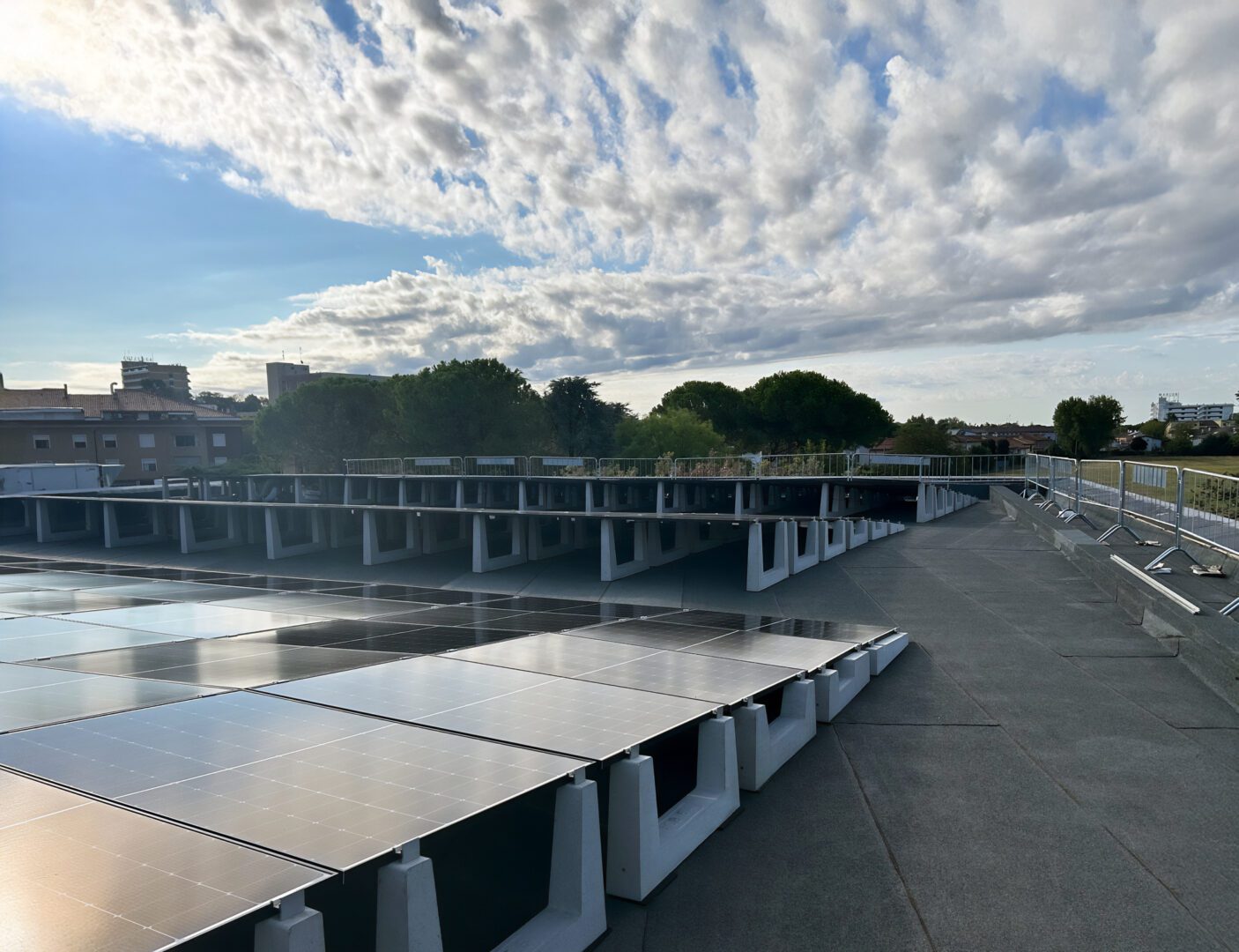 El sistema fotovoltaico de 100 kW visible en la foto – compuesto por diferentes «velas» de paneles – fue realizado en el techo plano de un hotel en la provincia de Padua por Evolved Group, y el uso de lastre para fotovoltaica Sun Ballast hizo la instalación fácil y rápida.