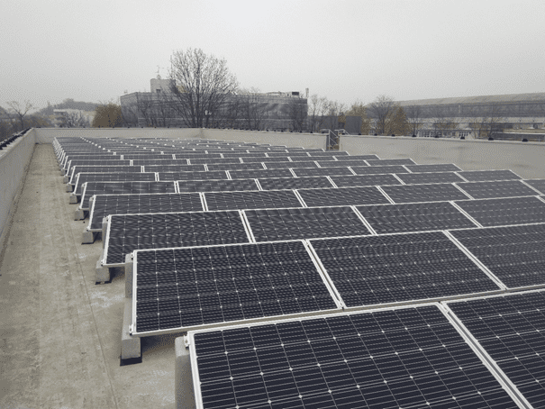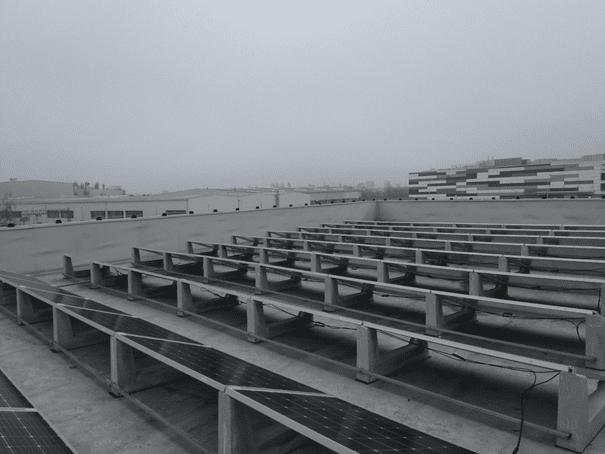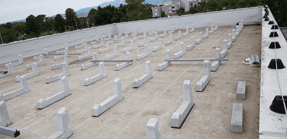 Estamos ubicados en Croacia en la ciudad de Zagreb donde nuestro cliente ITRS ha construido este sistema fotovoltaico con una potencia de 30 kWp con Sun Ballast 20 ° para evitar sombras debido a los altos parapetos.