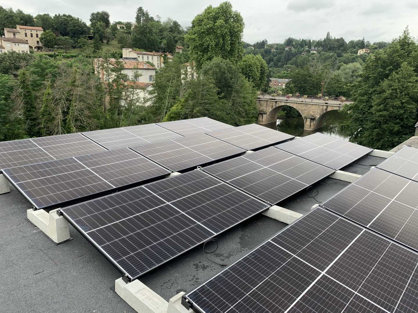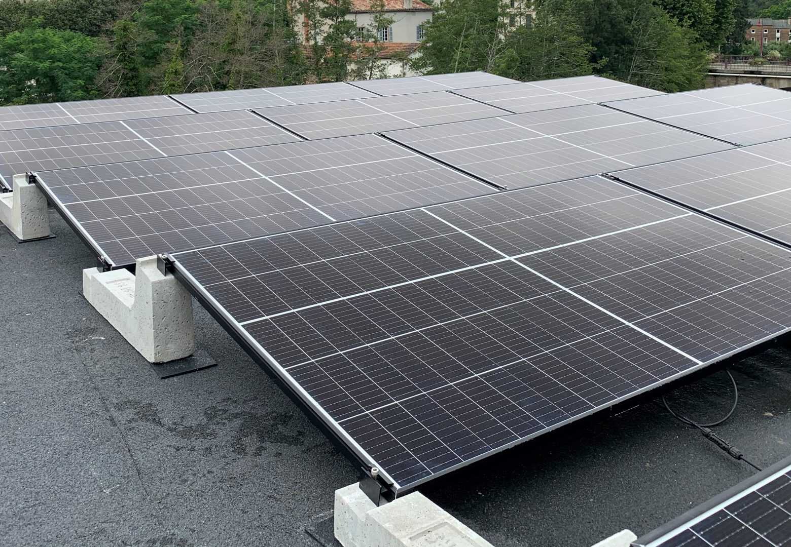 Sun Ballast ha proporcionado sus elementos de soporte para la realización de una hermosa instalación de paneles de generación solar sobre una superficie plana con revestimiento.