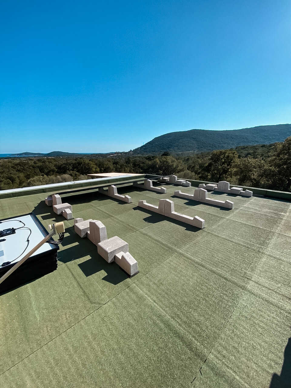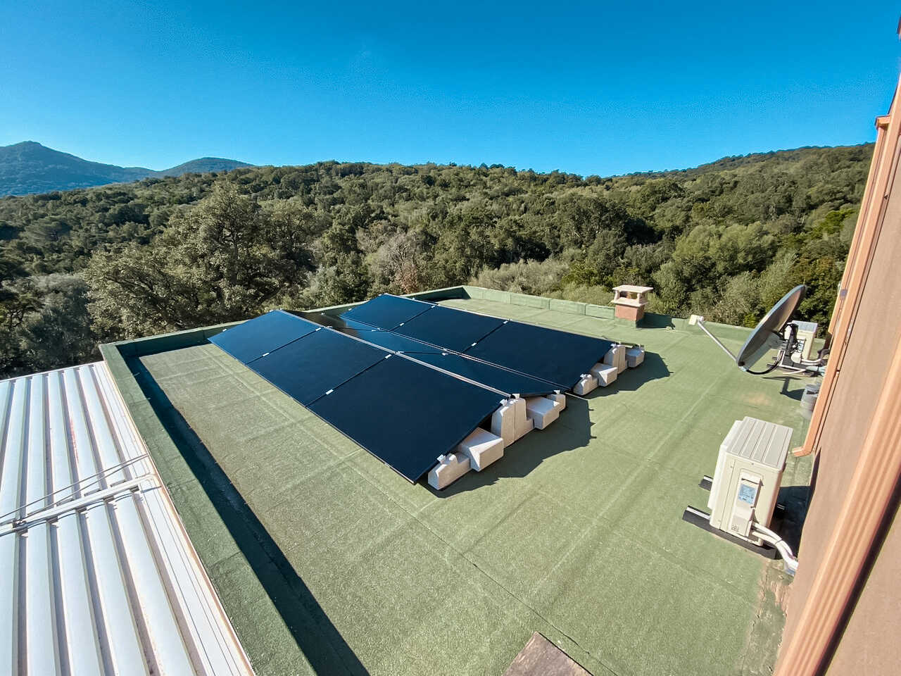 Para esta instalación de 12KWp realizada por SOLAIRE CORSE, el sistema elegido fue el Este-Oeste de 15°: la disposición de los paneles en dobles filas contrapuestas permite obtener una muy alta resistencia al viento, y con la adición de los pesos adicionales a «U» En los lastres laterales se garantiza la estabilidad de la instalación.