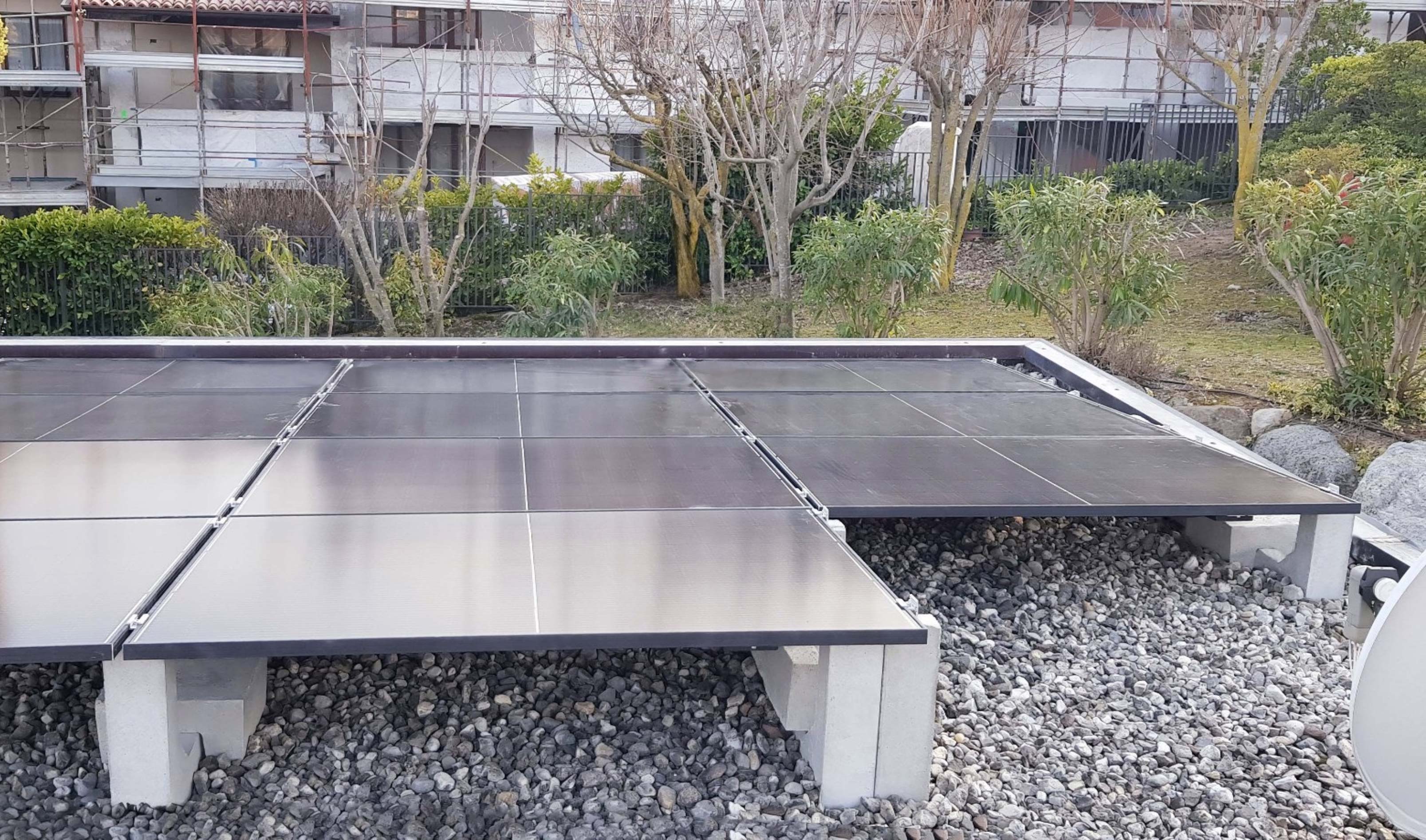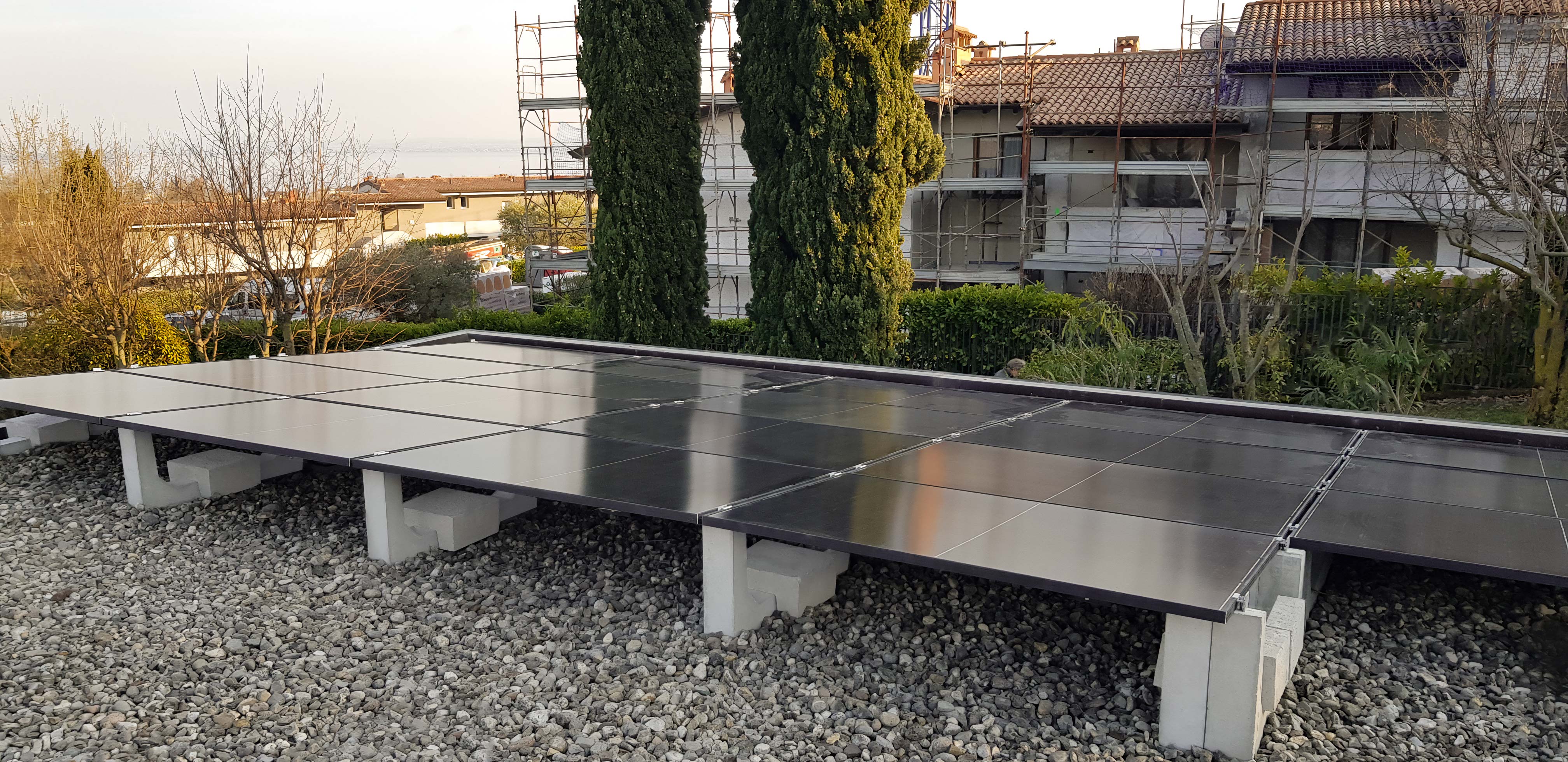 El sistema visible en las fotos ha sido realizado por nuestro cliente Tecnomax sobre un pequeño techo plano de grava, y el sistema a vela 5° de Sun Ballast ha permitido efectuar la instalación con gran facilidad, reduciendo los tiempos de instalación en más de un 30% y utilizando al máximo toda la superficie. En esta configuración, las filas de paneles se colocan consecutivamente una al lado de la otra, variando la altura de cada fila y reduciendo a cero las distancias entre los paneles. La grava tampoco ha supuesto un problema: los lastres Sun Ballast se colocan rápidamente sobre cualquier tipo de cubierta, y – incluso en el caso de la grava – la instalación no requiere ninguna preparación previa.
