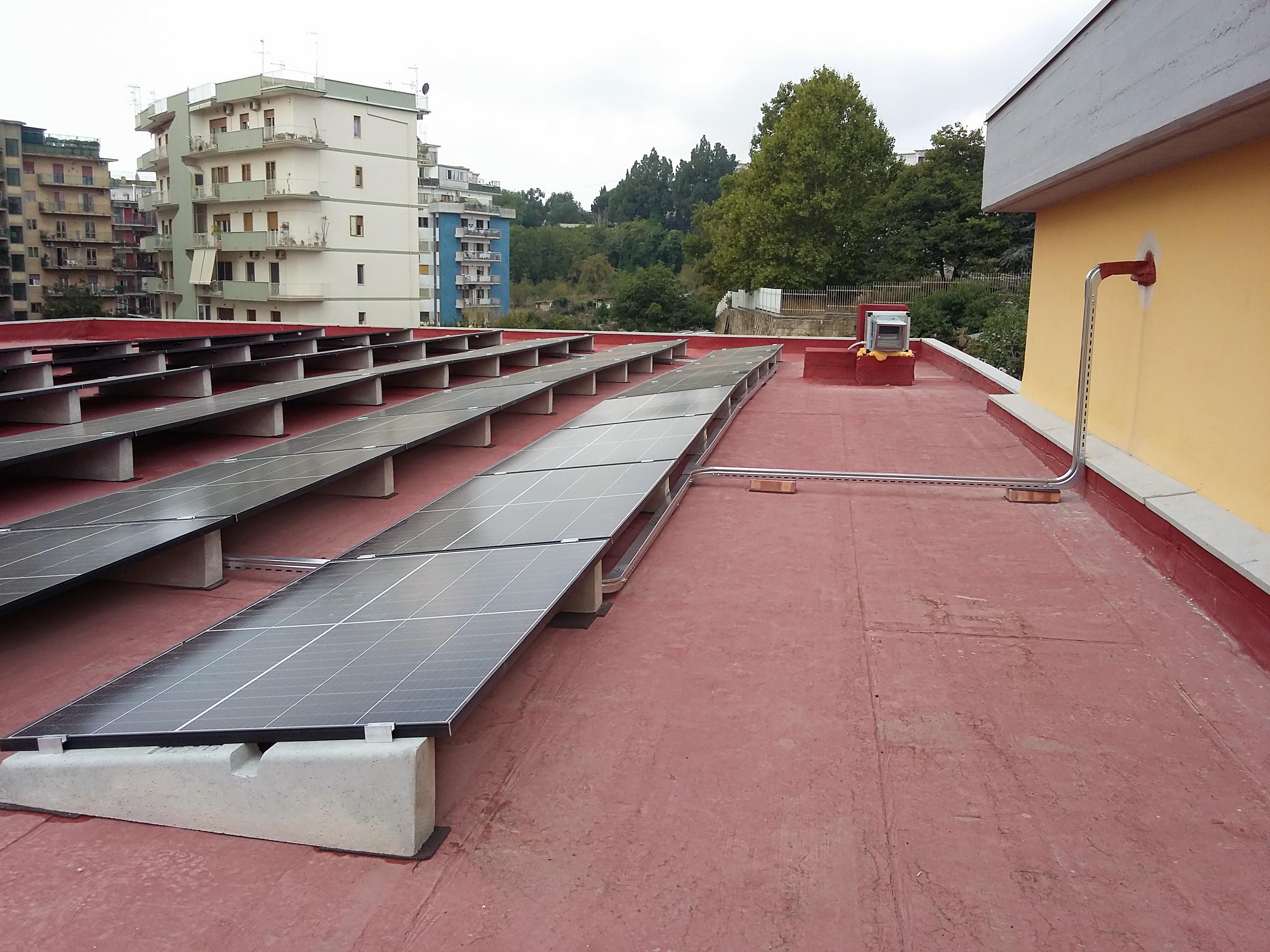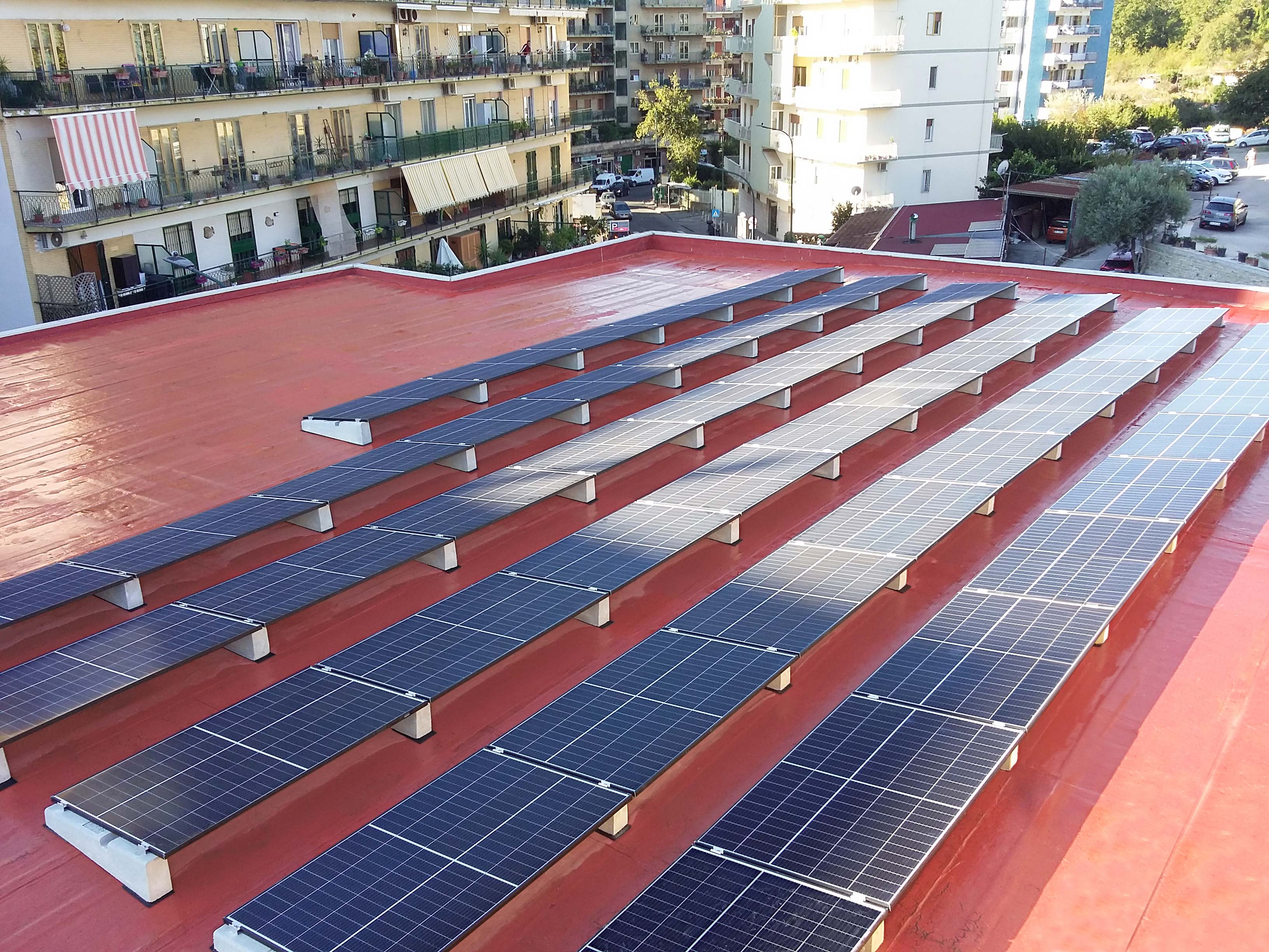 Este sistema fotovoltaico de 20 kWp fue instalado en un techo plano en Nápoles por nuestro cliente Tecnosolar (en colaboración con Re Sol Energy), y gracias al sistema Fila Simple 5° de Sun Ballast, las fases de instalación se realizaron de manera fácil y rápida. De hecho, las estructuras combinan en una única solución tanto la función de soporte como la de lastre, ofreciendo a los proyectistas e instaladores de sistemas fotovoltaicos sobre techo plano un sistema de montaje sencillo y extremadamente versátil.