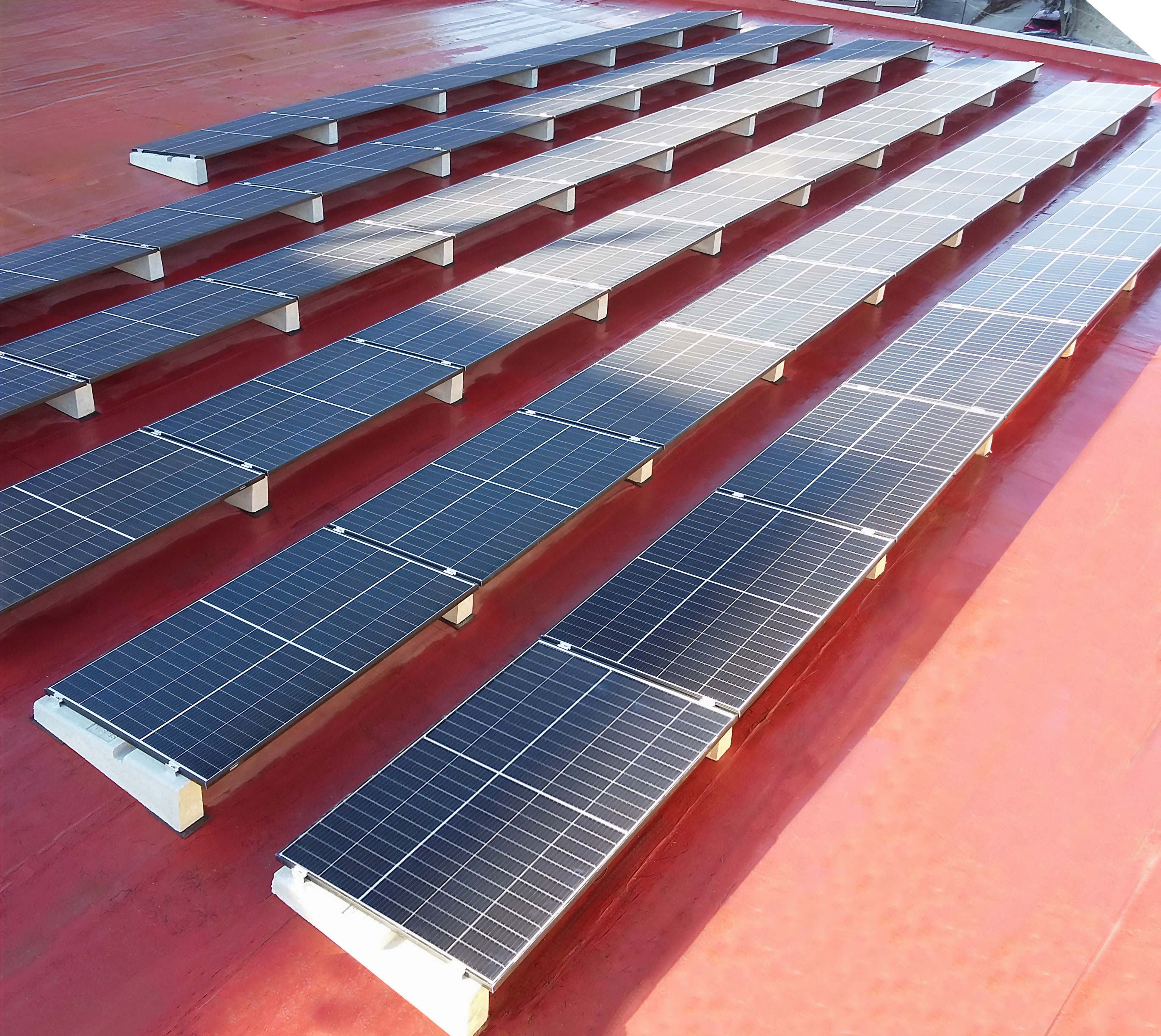 De hecho, los lastres fotovoltaicos del sistema Fila Simple están disponibles en una amplia gama de inclinaciones (de 0° a 30°), y han sido diseñados para permitir fijar los paneles fotovoltaicos tanto en sentido horizontal como vertical en cualquier tipo de superficie plana, reduciendo los tiempos de instalación y garantizando al mismo tiempo un alto nivel de resistencia a las cargas de viento.