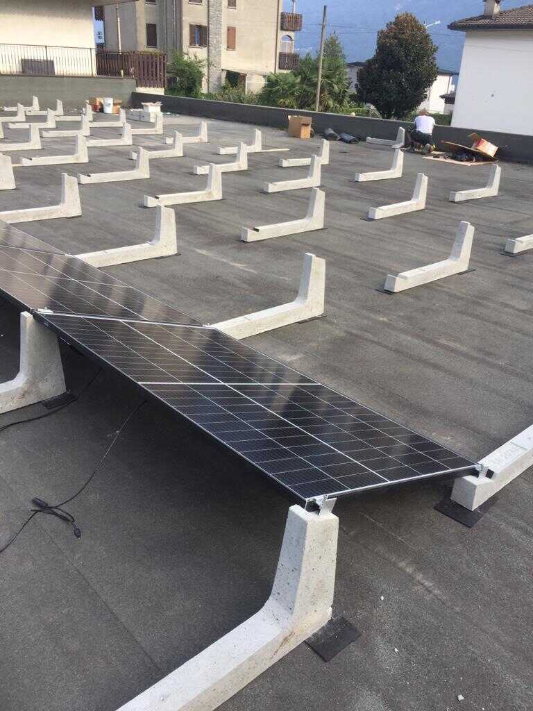 La stabilité des ballasts Connect est donnée précisément par les caractéristiques intrinsèques du système, composé de trois ballasts en béton, reliés entre eux, qui forment un véritable treillis. Outre la stabilité, l’autre avantage intéressant apporté par ce système réside certainement dans la répartition homogène du poids du lest qui ne sollicite ainsi pas excessivement la toiture. Comme vous pouvez également le voir sur les photos, le système s’adapte bien à chaque besoin, en effet les rangées de panneaux peuvent être interrompues pour éviter facilement les obstacles sur le toit.