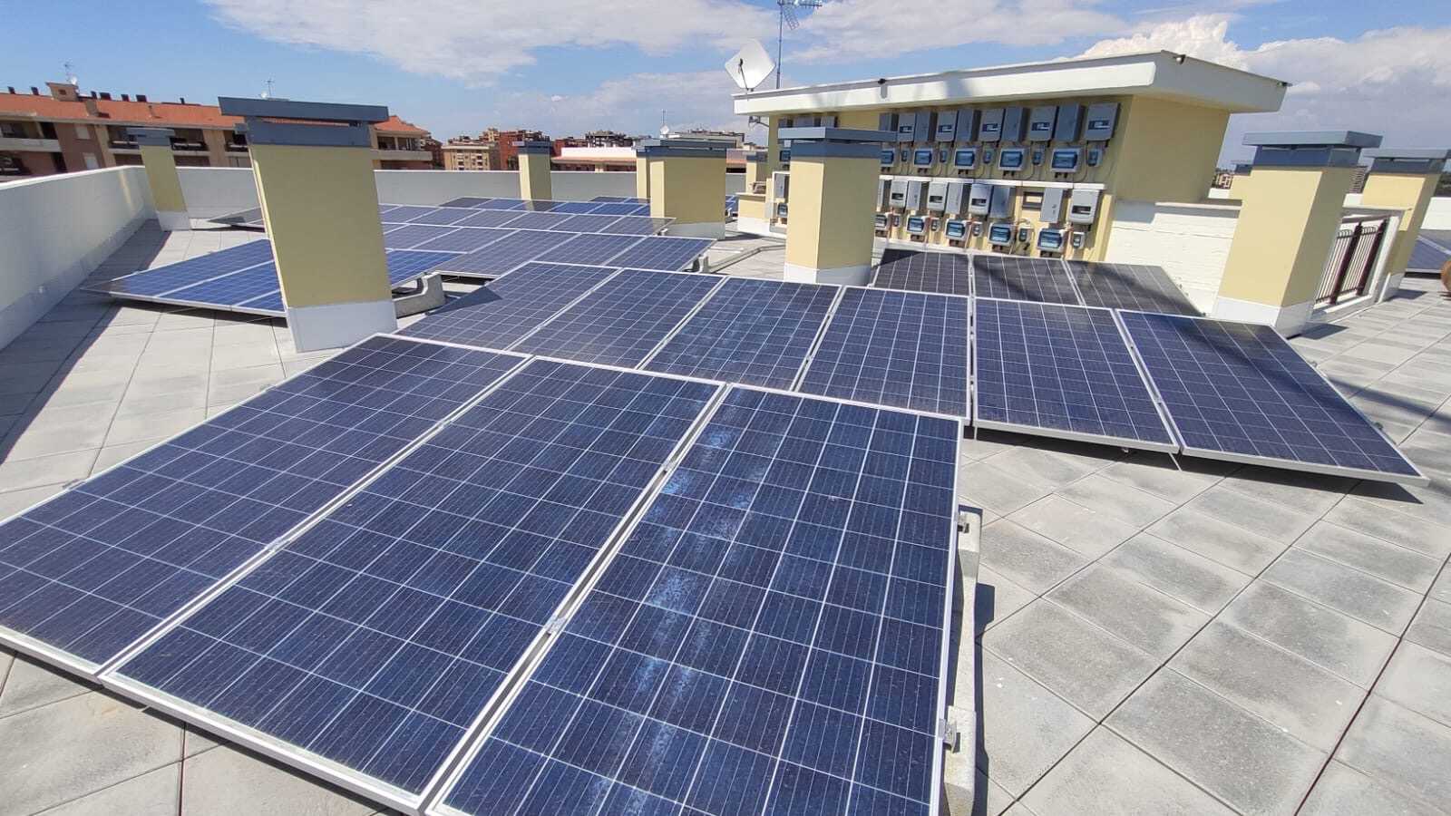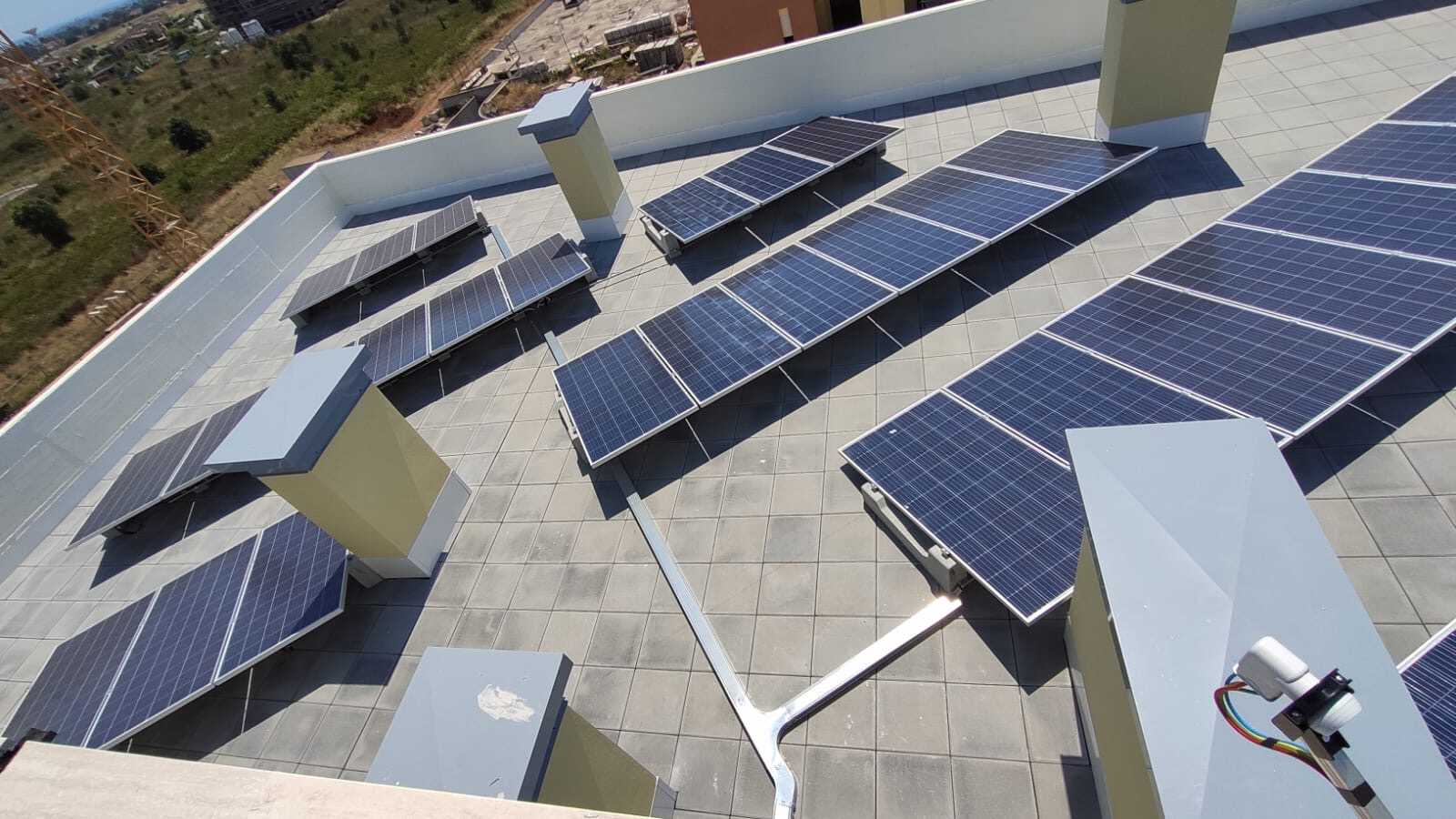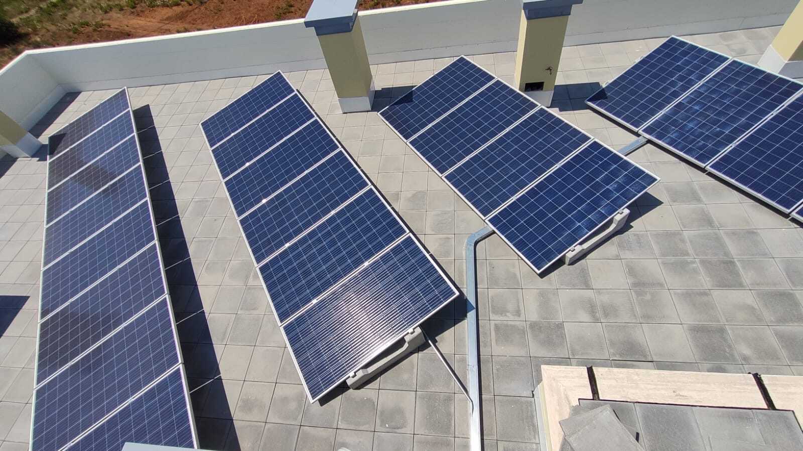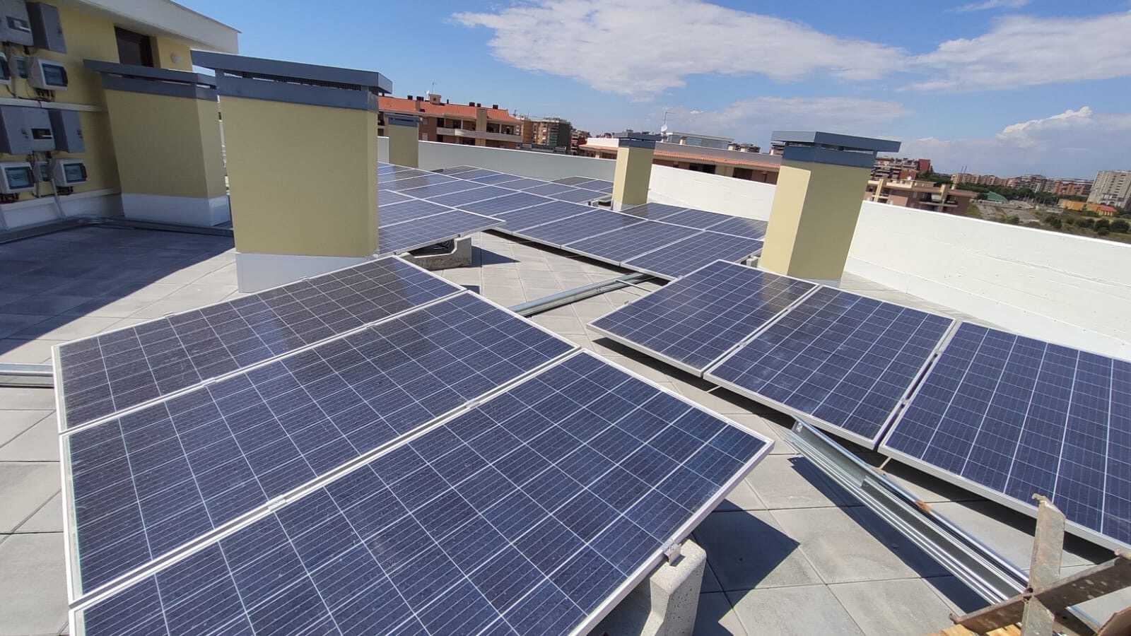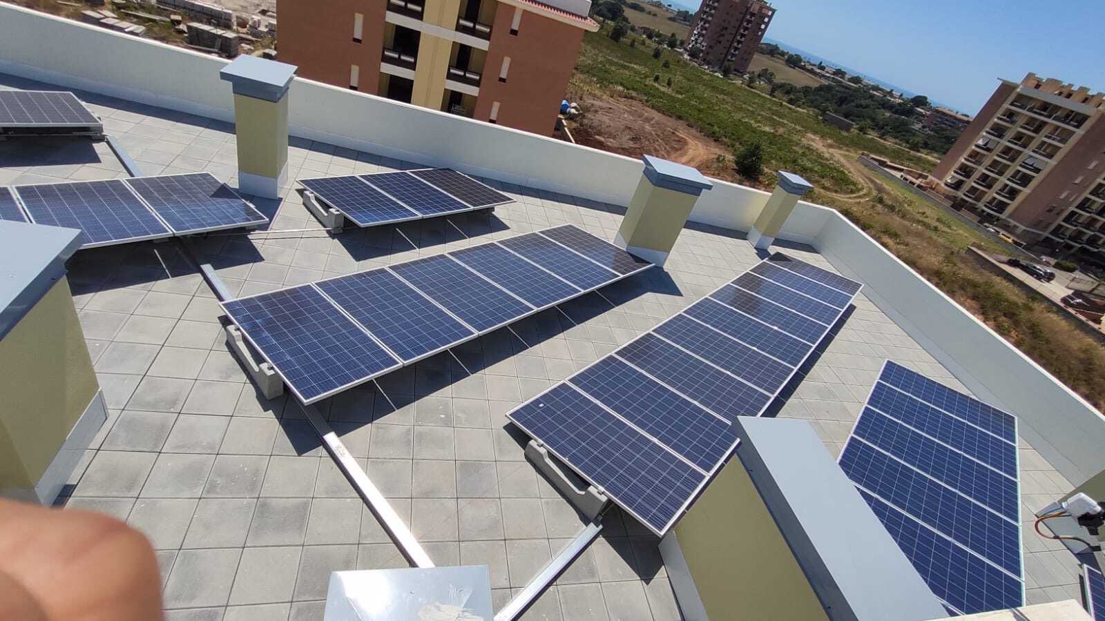Des supports qui n’ont pas besoin d’être fixés sur le toit et qui peuvent être déplacés sans difficulté pour contourner les obstacles sur le toit. Ainsi, 70 systèmes photovoltaïques de 1 kWc ont été installés pour chacun pour tous les immeubles.