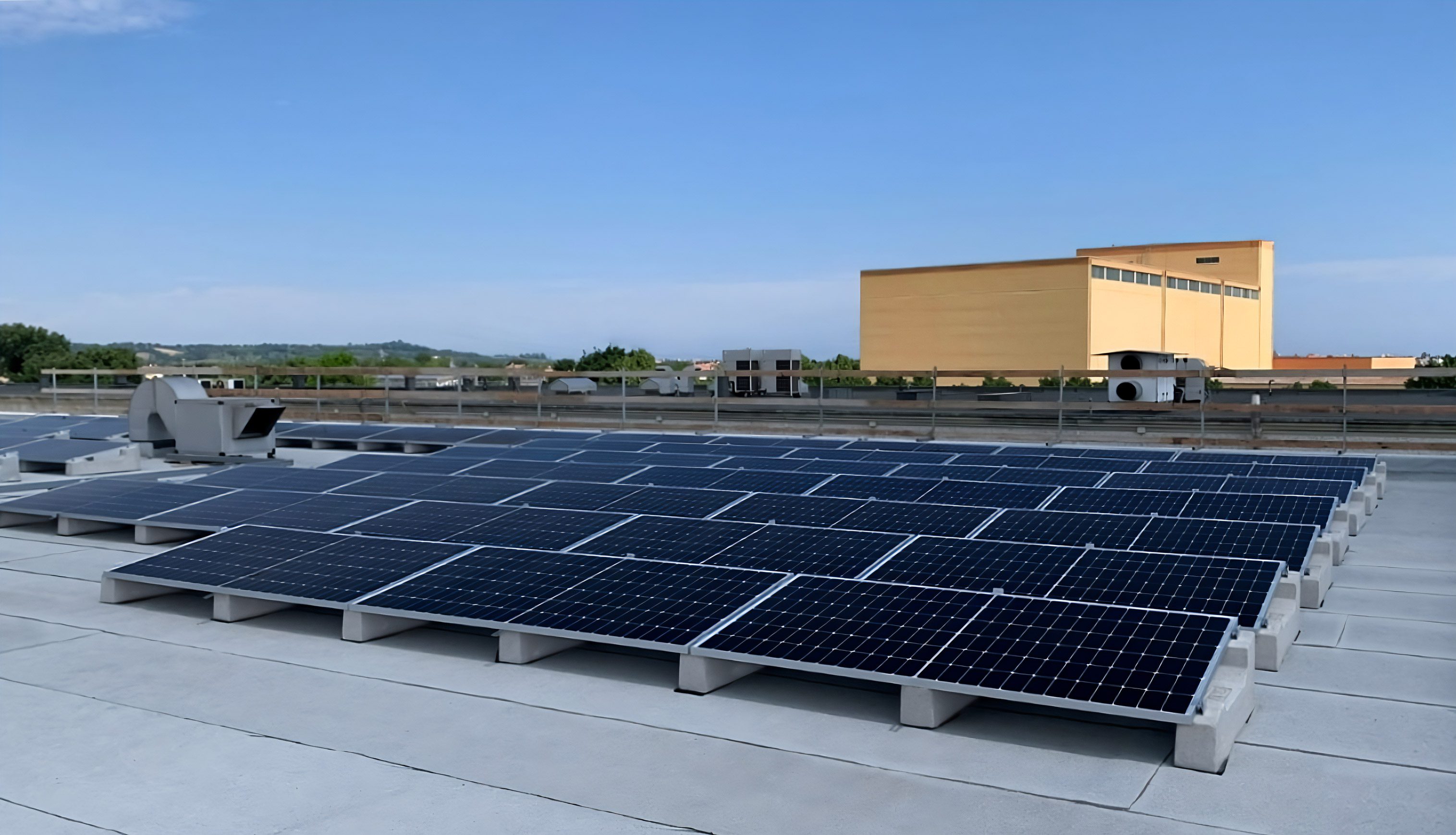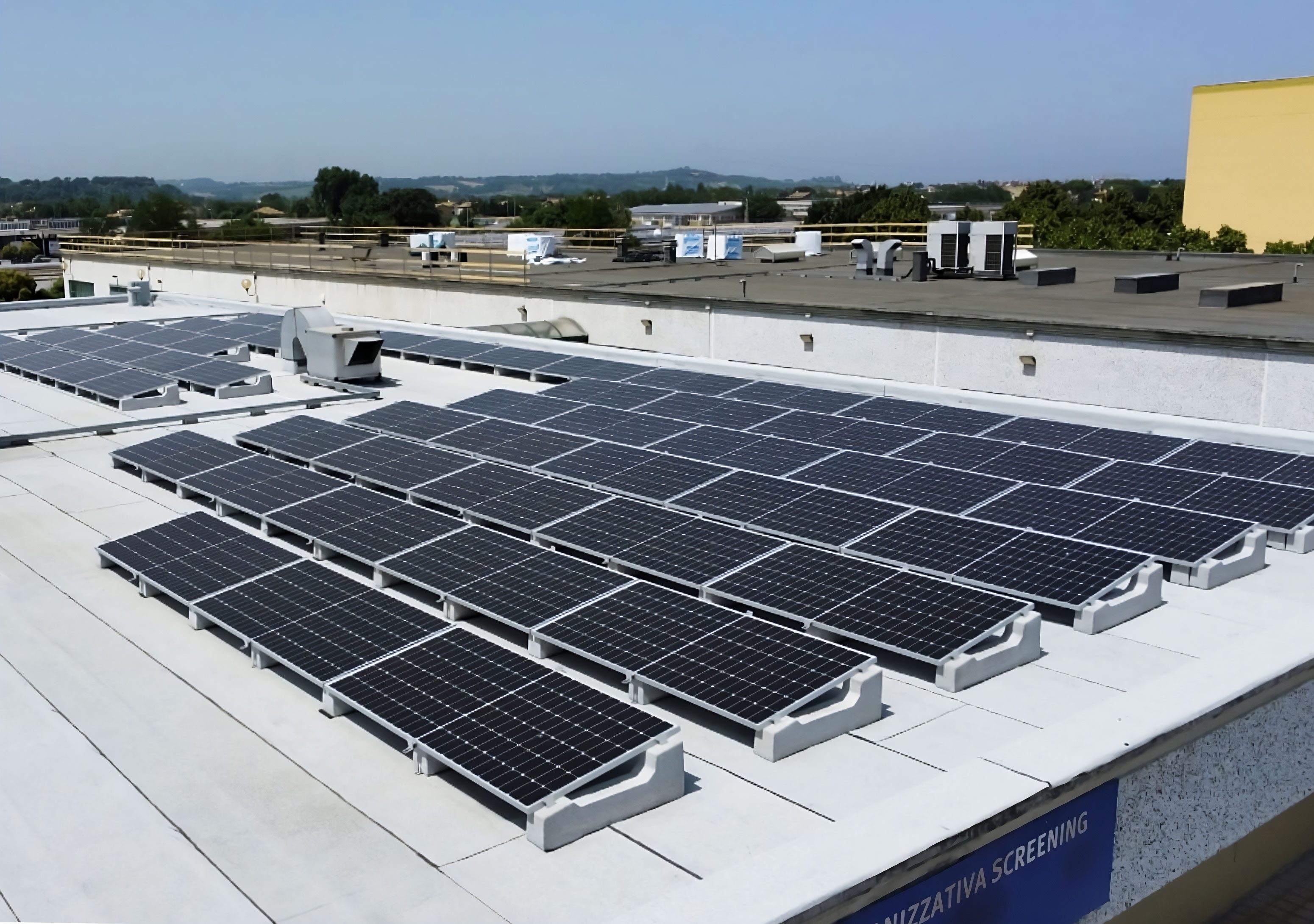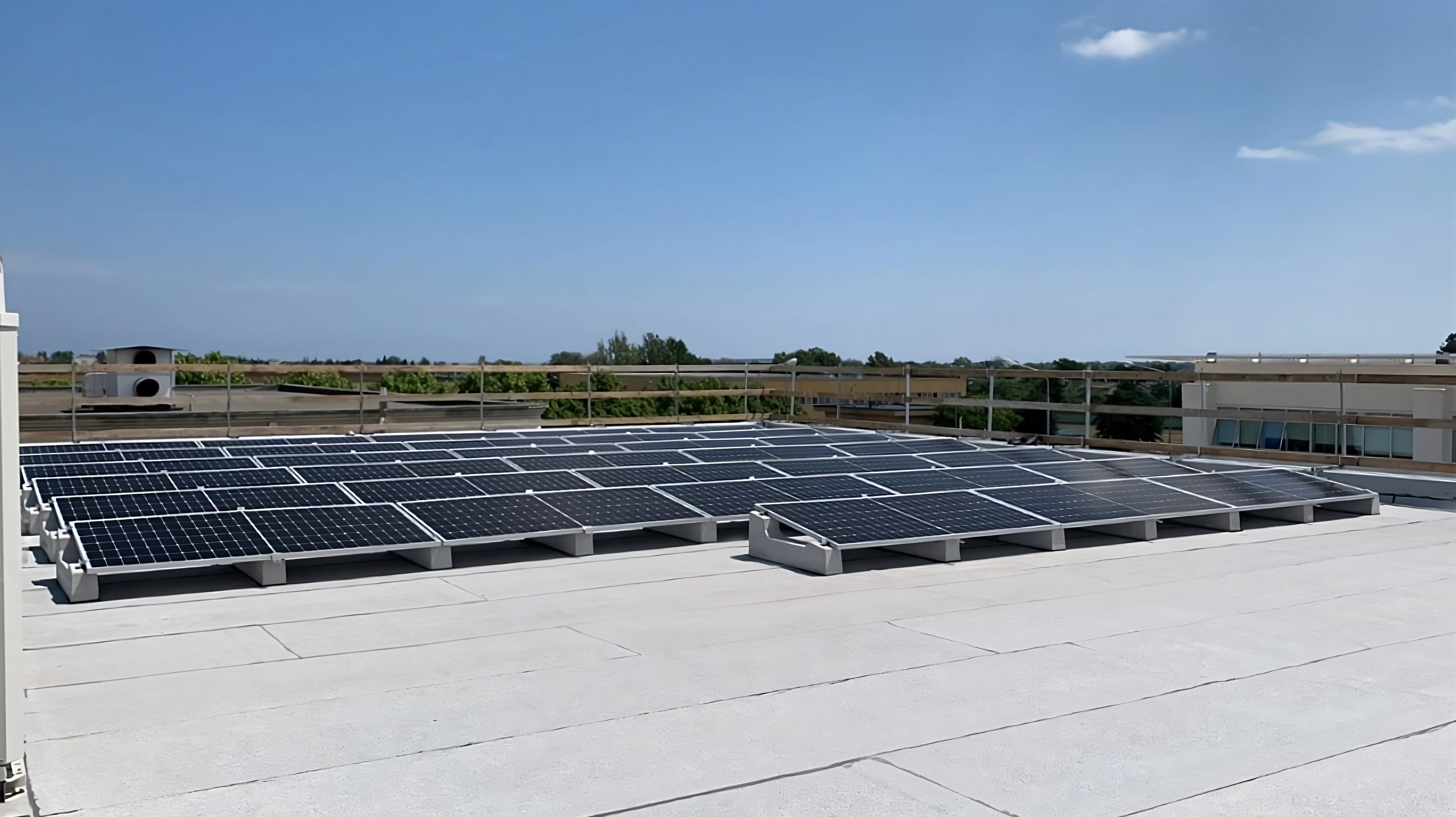 En effet, le système Standard – utilisé ici dans la version 10°, – assure une pose simple et rapide sur tout type de surface plate, et ne nécessitant aucune fixation, il permet de procéder rapidement même en présence de couvertures délicates telles que gaines et revêtements de sol. La possibilité de régler la longueur et la distance entre les rangées permet également d’adapter la configuration de l’installation à celle de la couverture, en contournant facilement les obstacles et en optimisant la surface disponible.