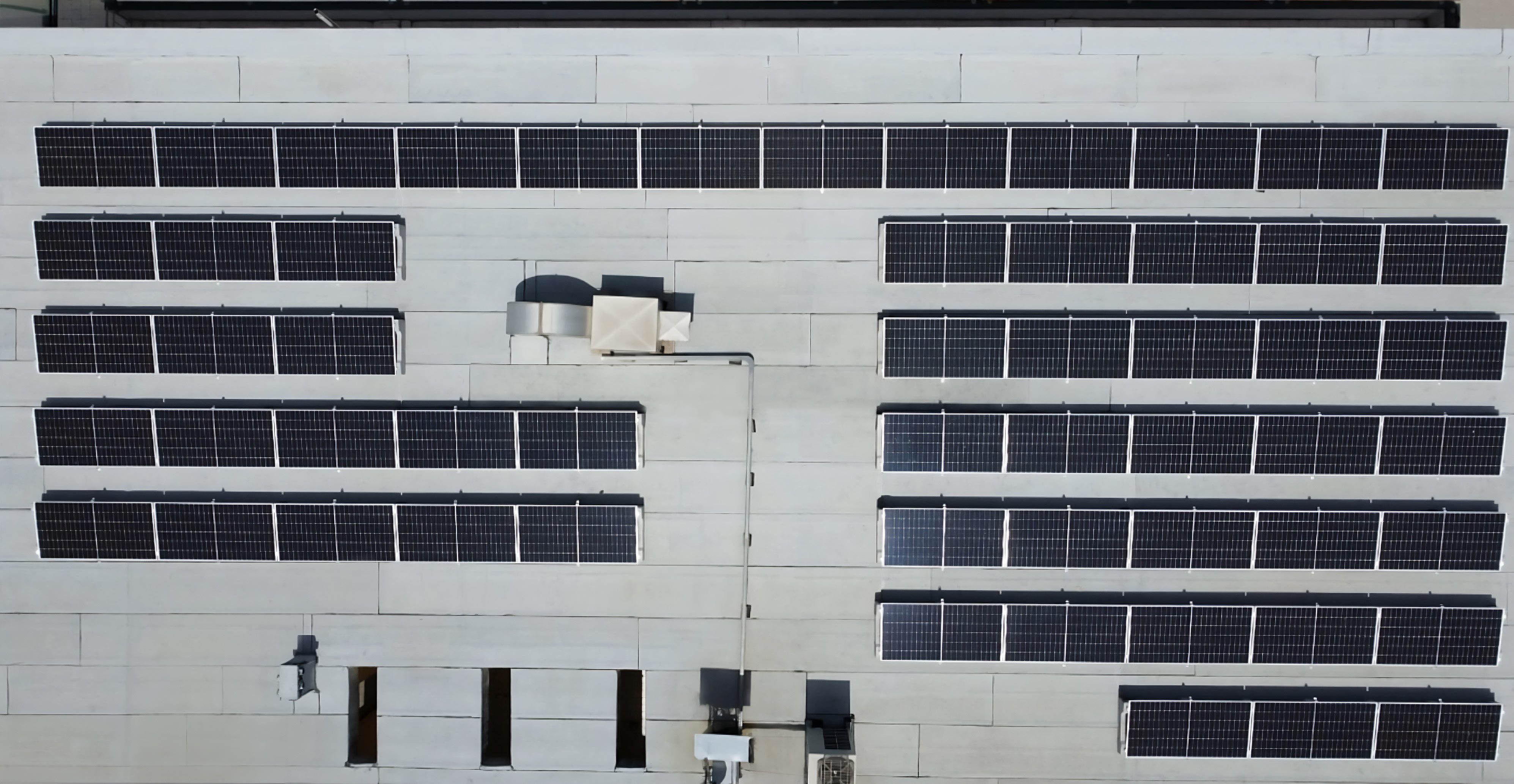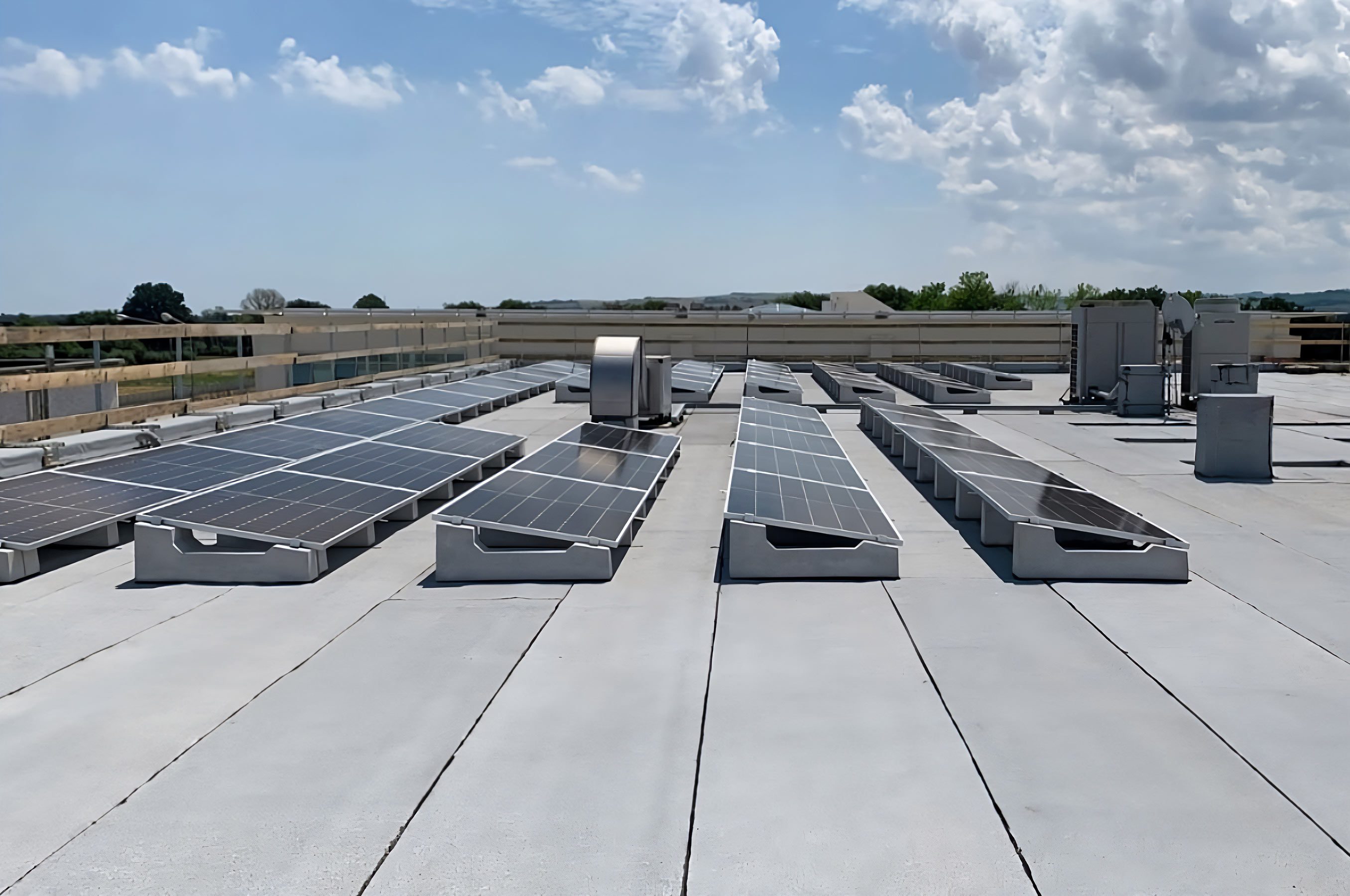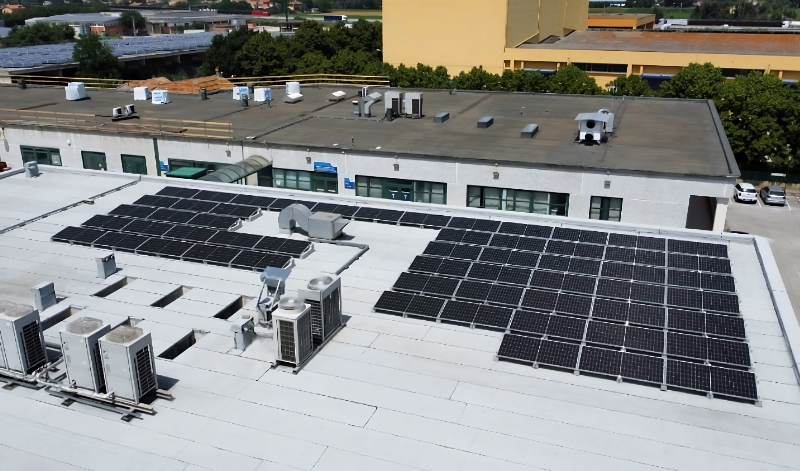 En effet, le système Standard – utilisé ici dans la version 10°, – assure une pose simple et rapide sur tout type de surface plate, et ne nécessitant aucune fixation, il permet de procéder rapidement même en présence de couvertures délicates telles que gaines et revêtements de sol. La possibilité de régler la longueur et la distance entre les rangées permet également d’adapter la configuration de l’installation à celle de la couverture, en contournant facilement les obstacles et en optimisant la surface disponible.