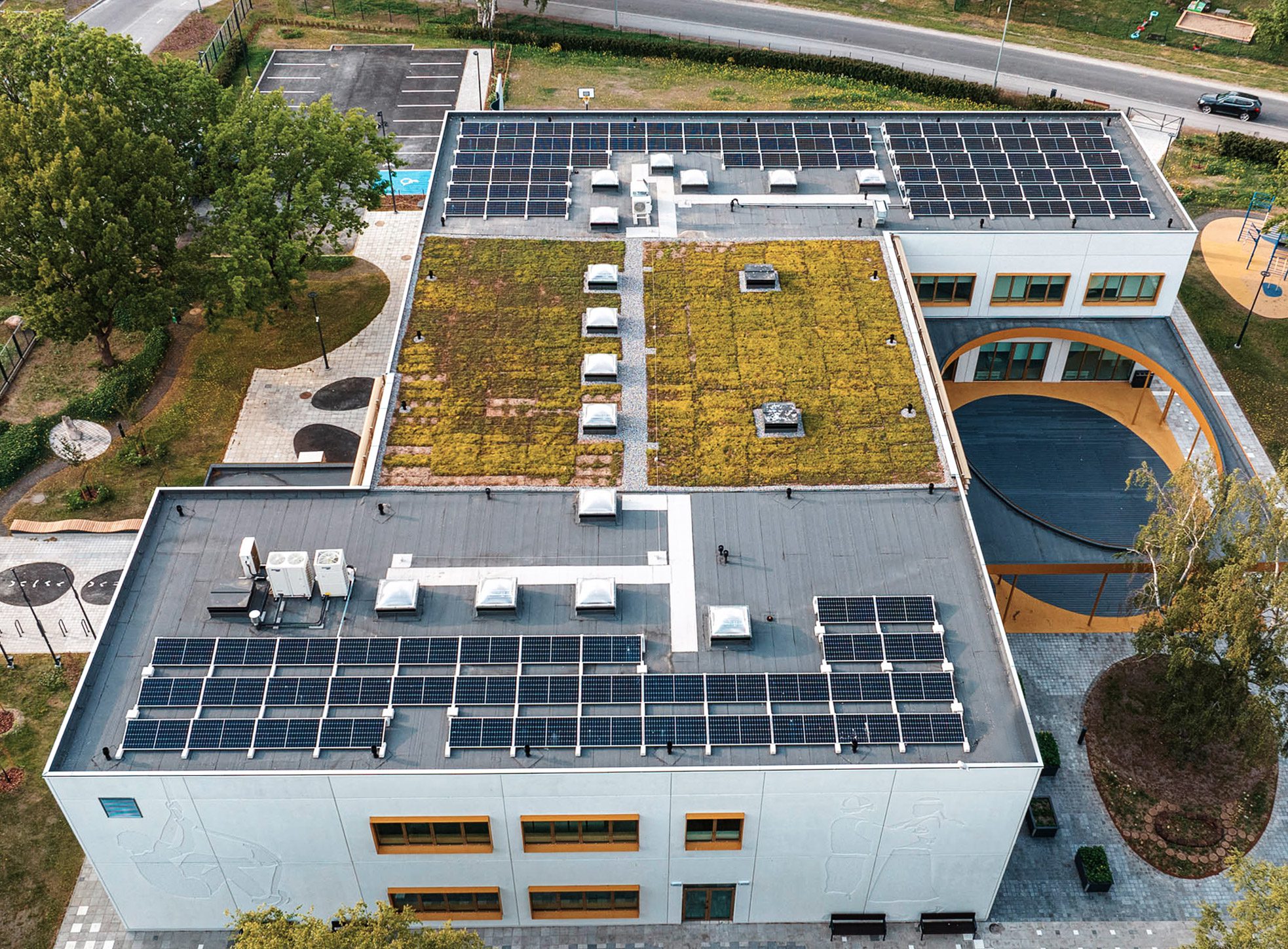 Le système Connect est disponible dans une large gamme d’inclinaisons – de 5 °à 30 ° – et est compatible avec le système No-Flex (dédié aux grands panneaux) et avec les poids supplémentaires « U-Block« . Ces derniers ont été posés directement sur les ballasts périmétriques, renforçant encore l’étanchéité des structures et assurant une stabilité maximale même aux endroits les plus exposés au vent.