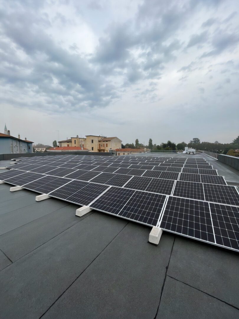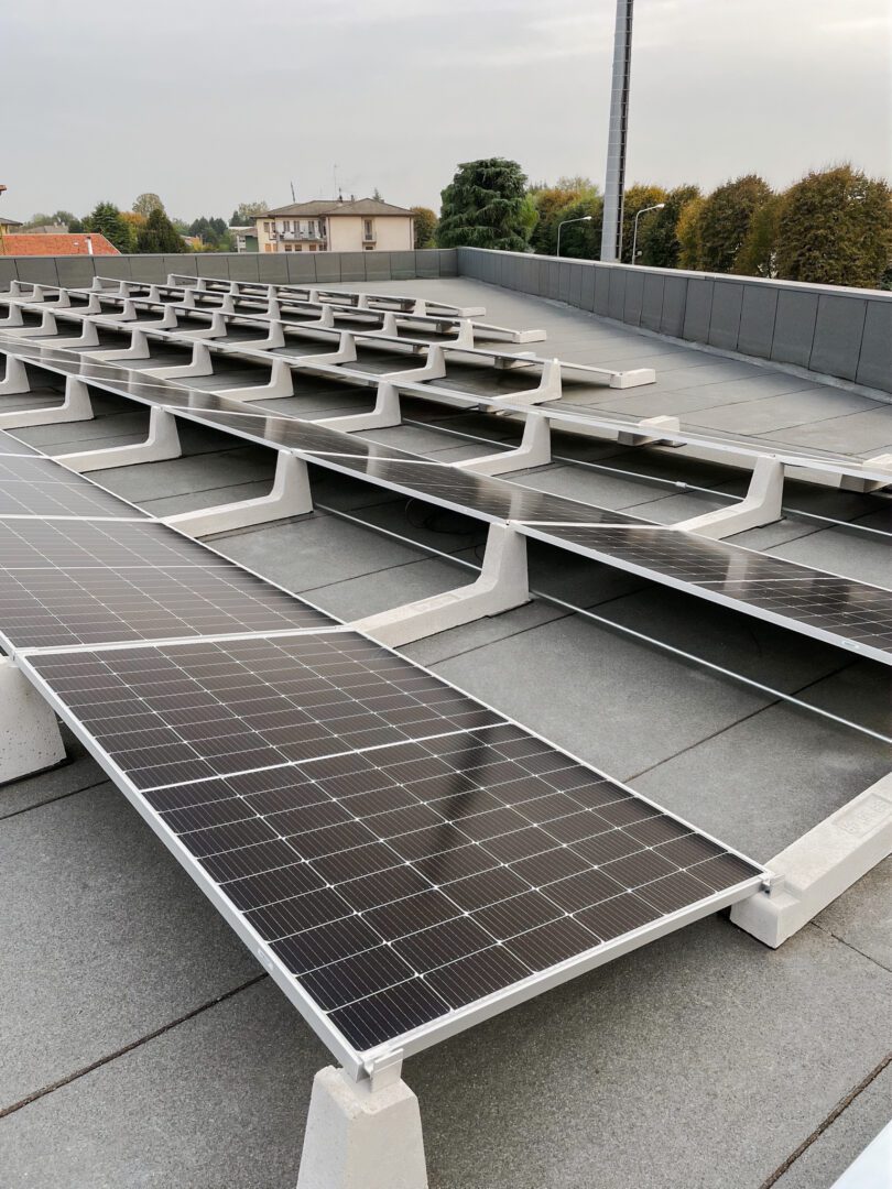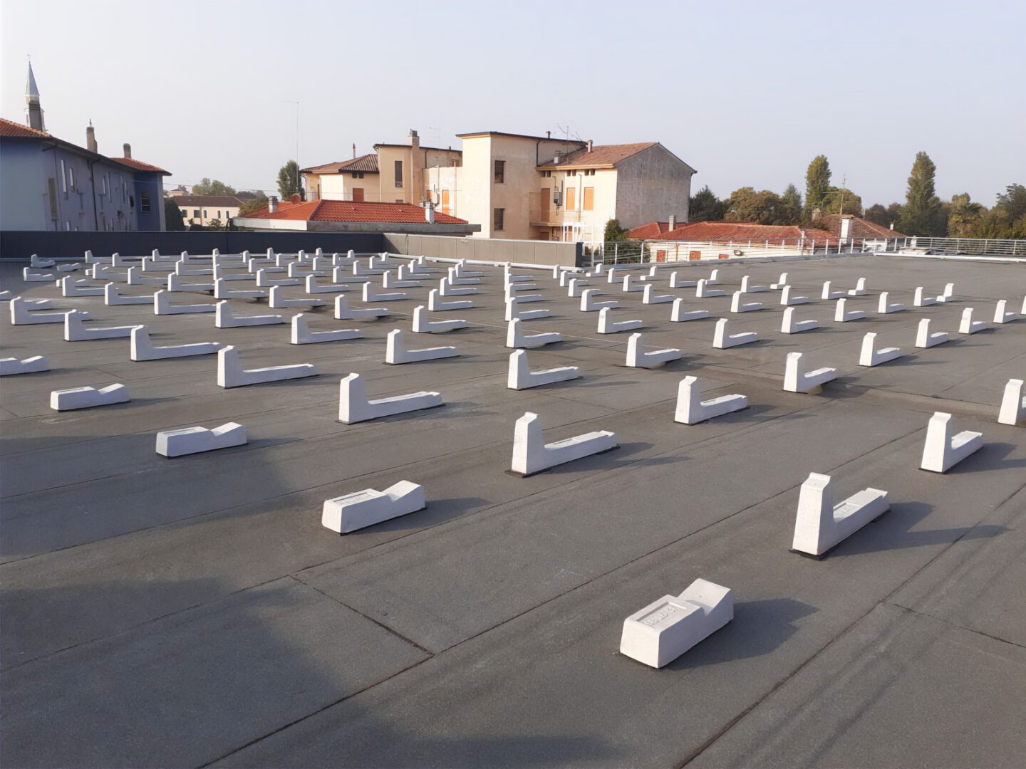 L’installation de 500 kW visible sur la photo a été réalisée à San Giorgio delle Pertiche (dans la province de Padoue) par notre client Errem Impianti sur un grand toit plat en membrane, et le système Connect 10° a assuré une très haute stabilité aux modules. La structure réticulaire de ce système de fixation pour panneaux photovoltaïques permet de répartir les poids et les sollicitations mécaniques sur l’ensemble du réseau de ballasts, tout en équilibrant les charges sur toute la surface du toit.