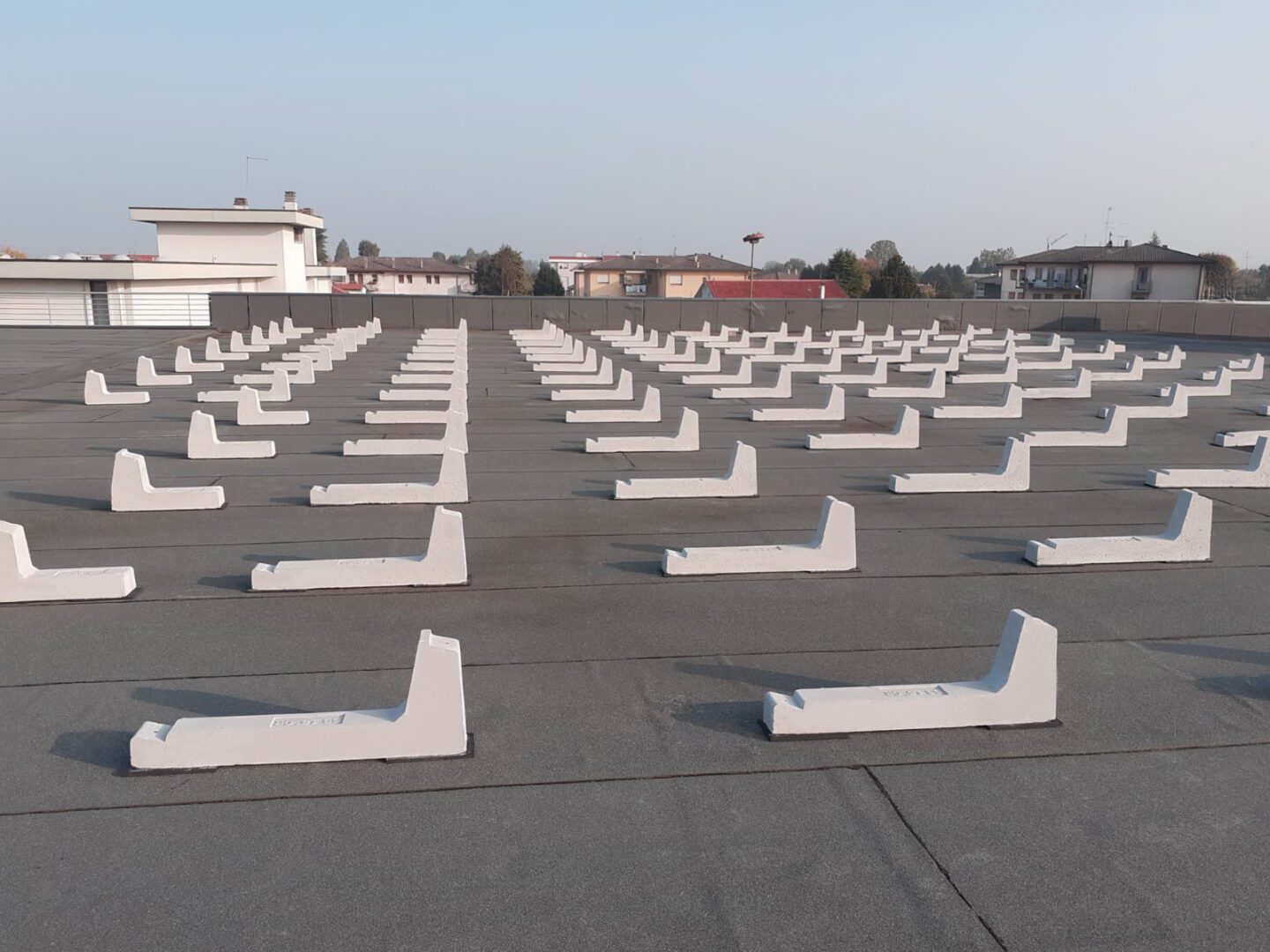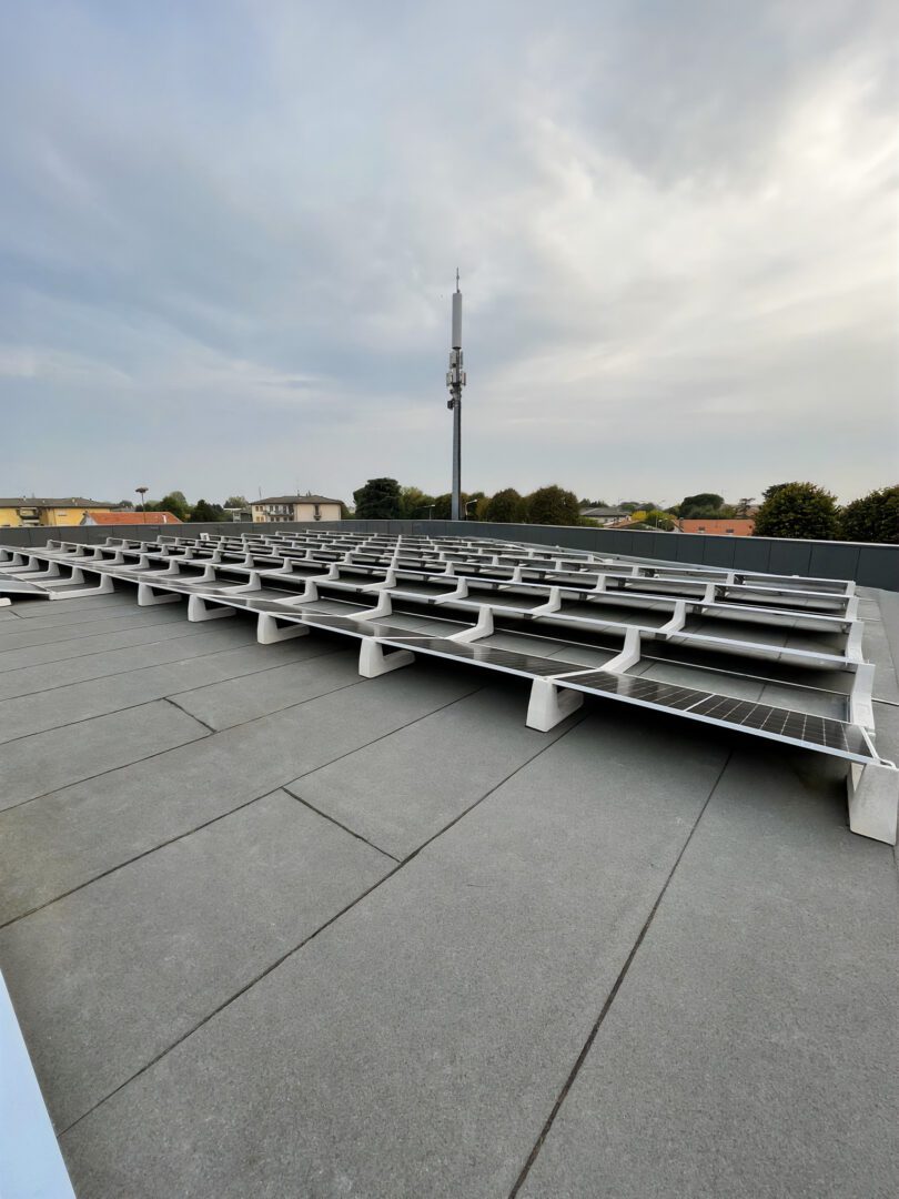 Le système Connect – breveté et testé en soufflerie – est disponible en plusieurs versions allant de 5° à 30° d’inclinaison et peut être installé sur tout type de bâtiment à toit plat. Comme tous les ballasts pour photovoltaïque Sun Ballast, ceux utilisés dans cette installation contiennent déjà à l’intérieur des douilles M8 pour la fixation des pinces et garantissent le plus haut niveau de sécurité et de fiabilité.