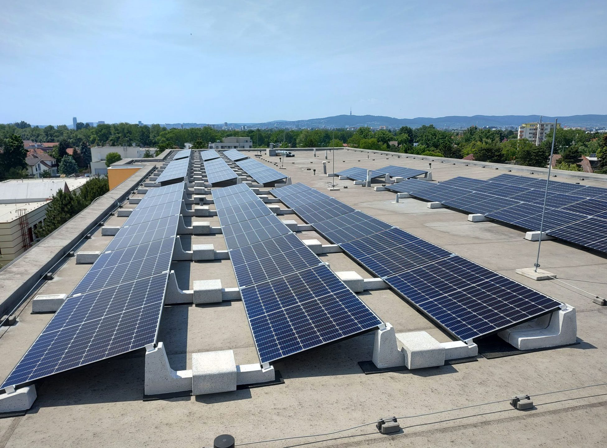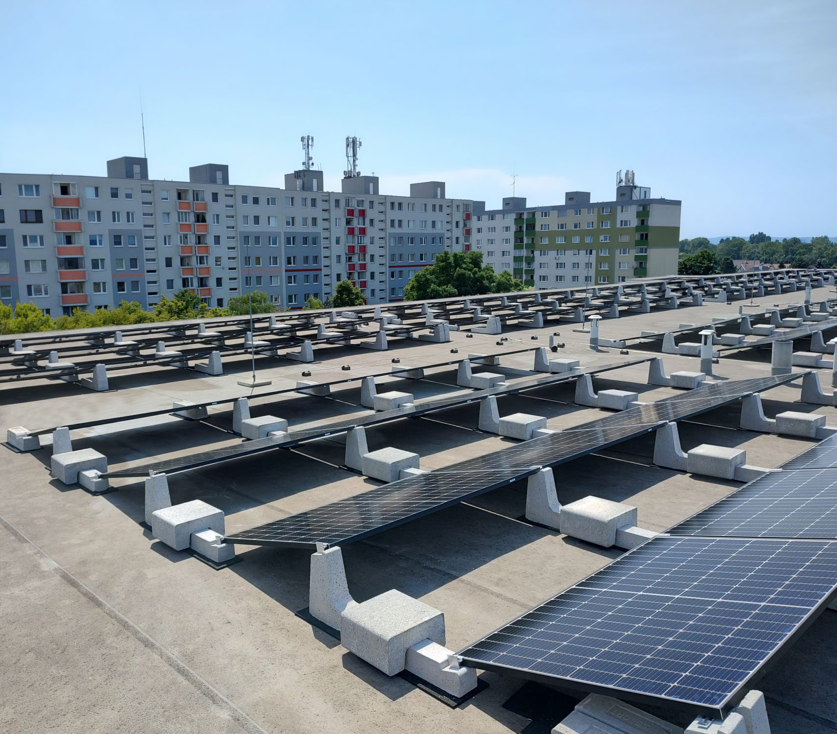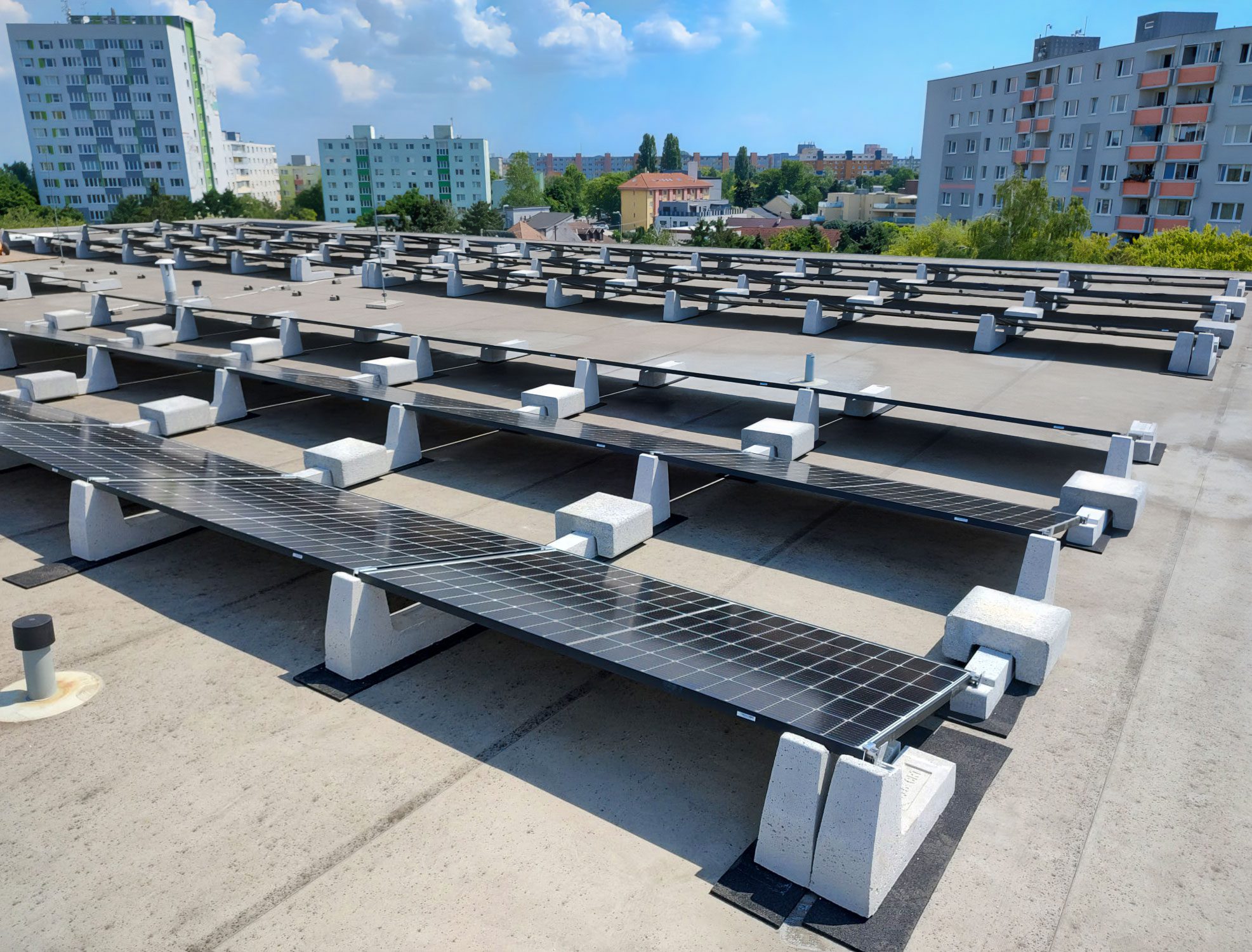 L’installation photovoltaïque en photo a atteint 42 kwp, et a été réalisée à Vrakuňa (Slovaquie) par notre client JV Energy : l’installation a été réalisée sur le toit plat d’un bâtiment industriel, et les ballasts en béton Sun Ballast ont permis de simplifier toutes les phases de pose, en ne nécessitant aucun trou de fixation et en minimisant les temps de pose. Le système Connect (utilisé ici dans la version 15 °) est disponible dans une gamme d’inclinaisons – 5 °, 10°, 15 °, 20° , et 30° , et se compose de trois structures différentes : un ballast antérieur, un centrale et un terminal.