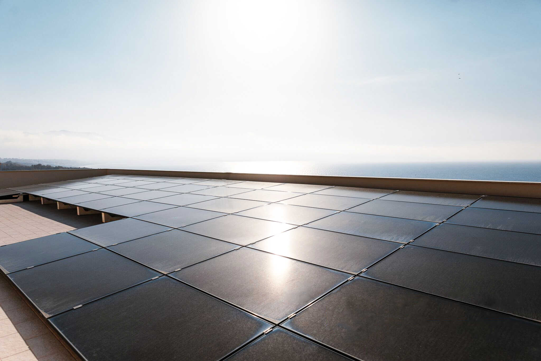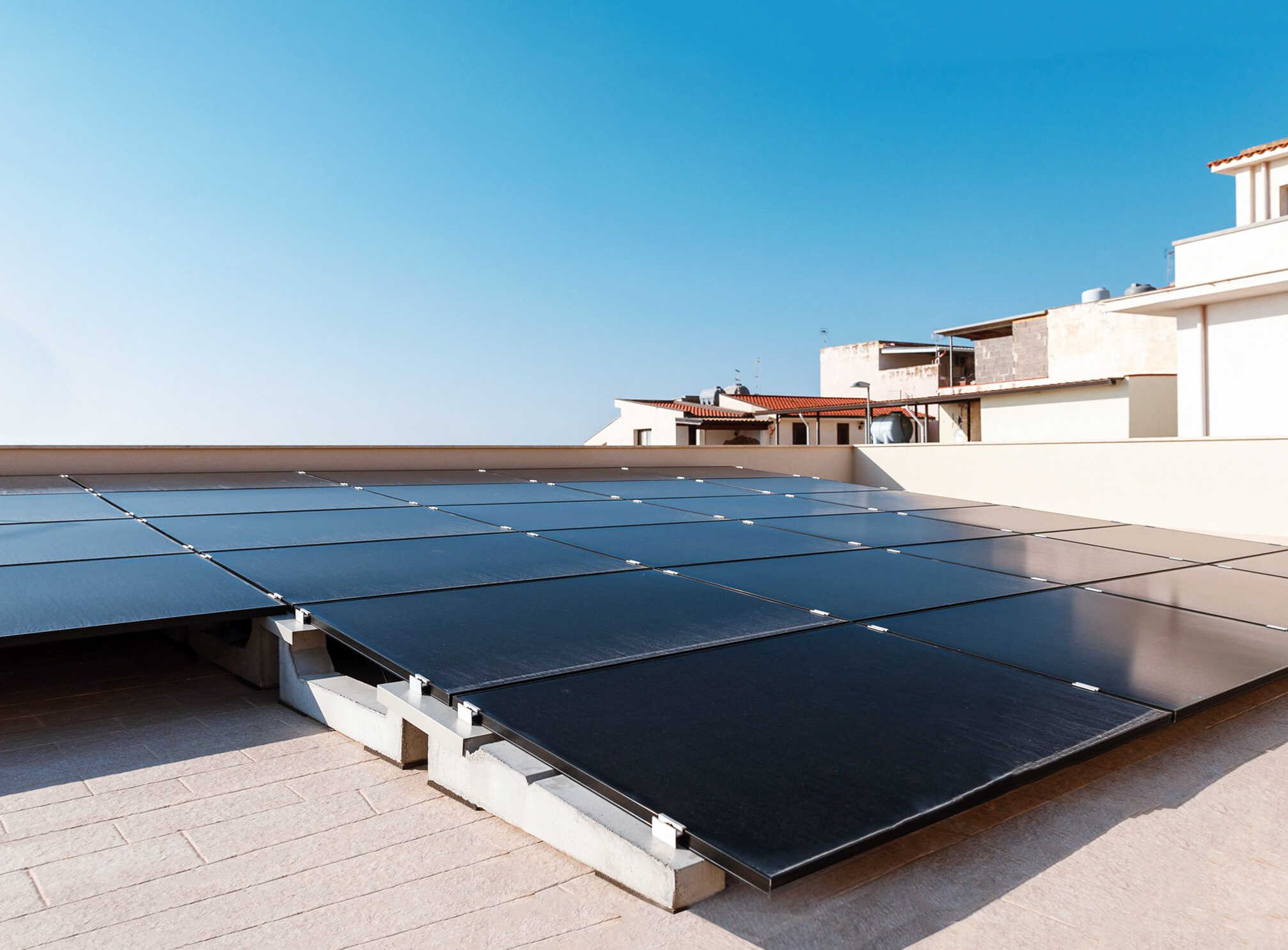 En outre, grâce à la qualité des structures innovantes Sun Ballast, il est possible d’utiliser non seulement les toits, mais tous les types de surfaces plates, comme les terrasses : en effet, aucun trou de fixation n’est nécessaire, la pose des structures peut se dérouler extrêmement rapidement même lorsque la couverture – comme dans ce cas – est pavée, en évitant tout type de dommage et en procédant à l’installation sans accroc.