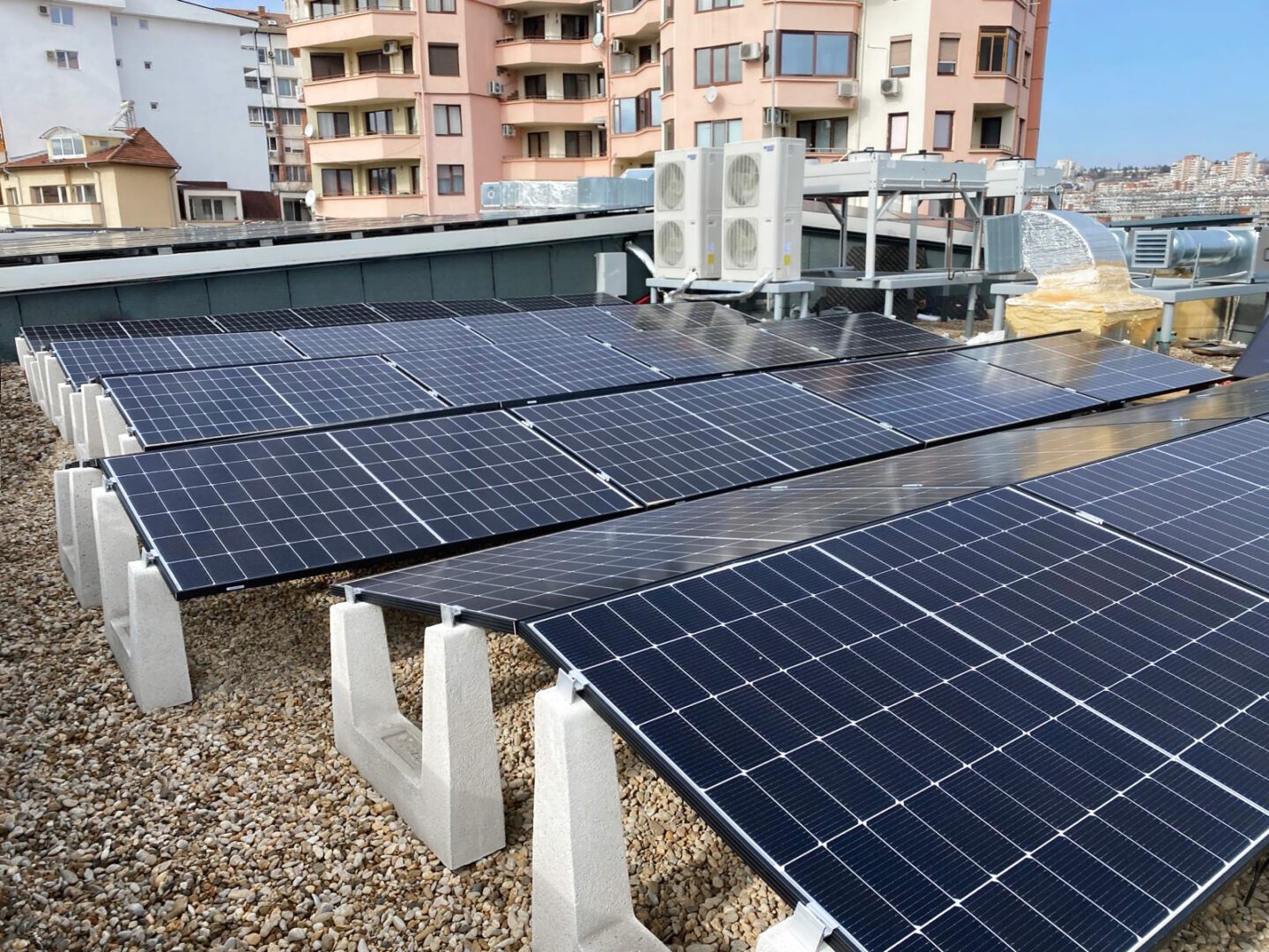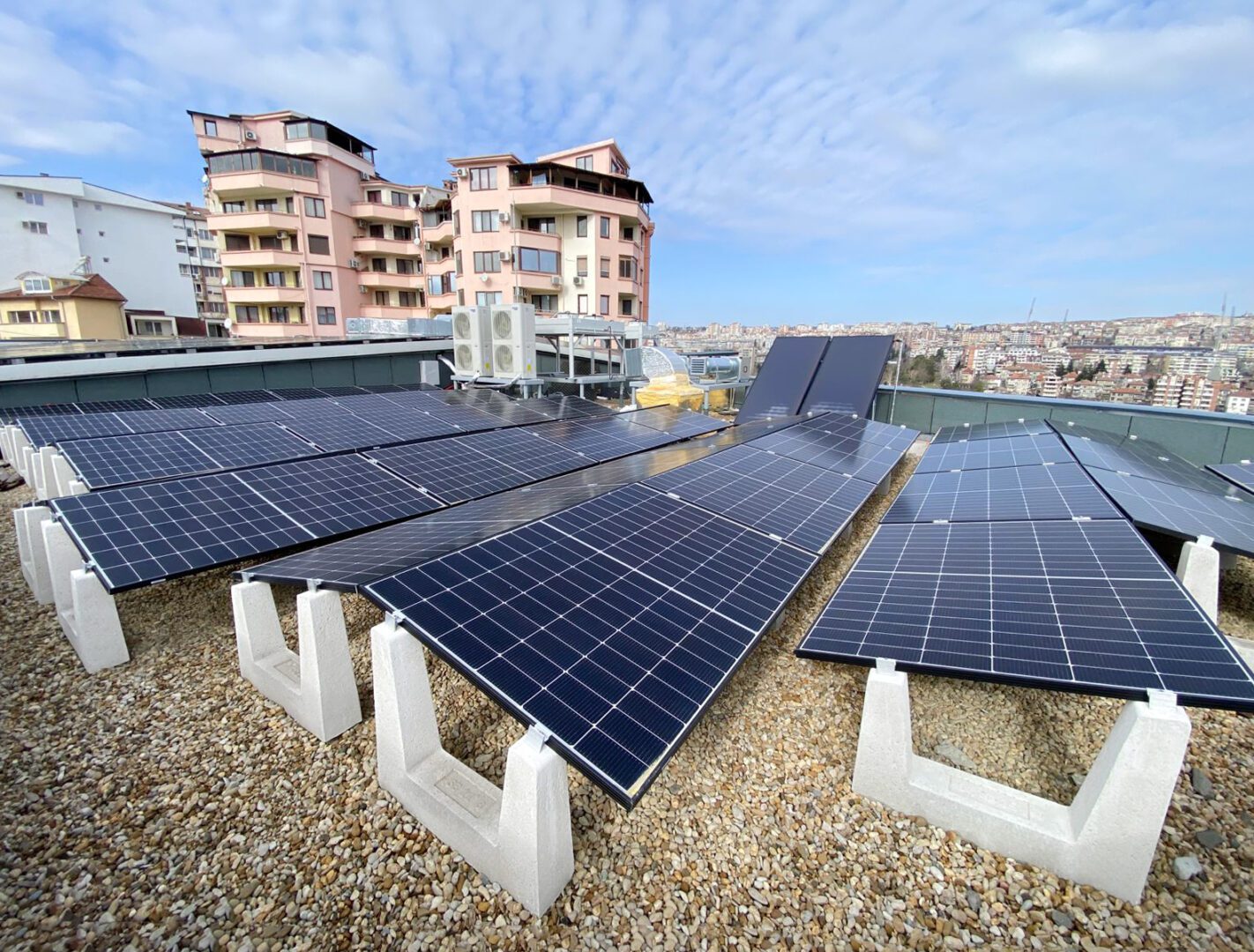 Réalisé à Veliko Tarnovo (Bulgarie) par notre client SMV Energy Ltd, ce système photovoltaïque sur toit plat a été installé sur le toit en gravier d’un bâtiment résidentiel, et grâce à la structure photovoltaïque Sun Ballast, les travaux d’installation ont été réalisés de manière simple, rapide et professionnelle. Les ballasts pour panneaux photovoltaïques ne nécessitent aucun ancrage au toit et ils sont compatibles avec n’importe quel matériau. Dans ce cas, le ballast en béton a été installé sur un toit en gravier et les ballasts ont été placés directement sur la couche de gravier, ce qui a permis de réduire au minimum le temps et les coûts d’installation.