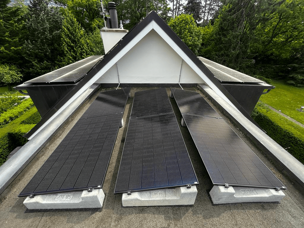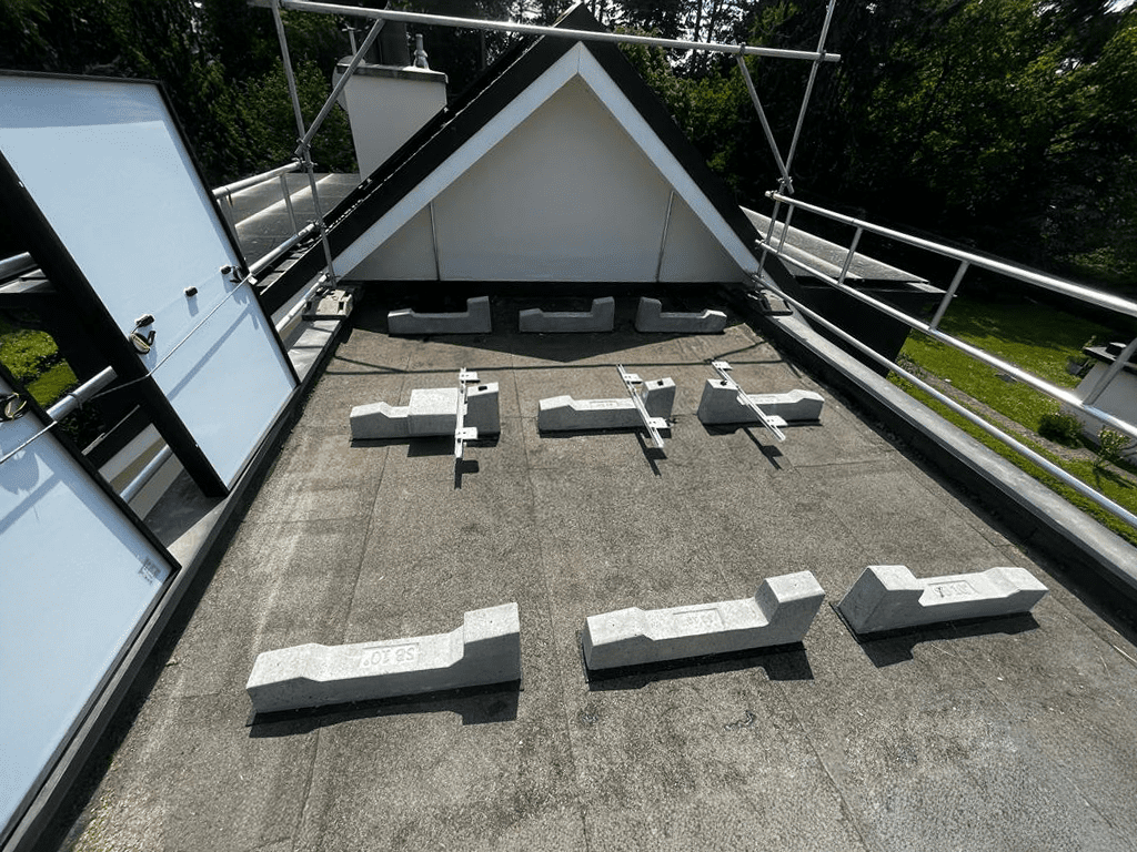 Cette petite installation photovoltaïque de 2,5 kW a été réalisée sur le toit plat d’une habitation en Suisse, et les structures pour photovoltaïque Sun Ballast ont permis d’effectuer le montage de manière simple et rapide, sans risquer d’endommager la couche de gaine sur la couverture. Les ballasts en béton ne nécessitent pas de trou d’ancrage et peuvent être facilement installés sur des surfaces plates de n’importe quel matériau.