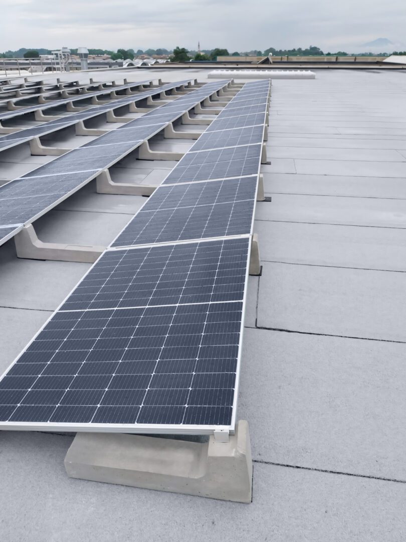 Cette installation de 39 kW a été réalisée à Onara (PD) par notre client Unosolare avec la version inclinée à 10° : les trois différentes structures photovoltaïques qui composent l’installation sont disponibles avec une inclinaison de 5° à 30° et contiennent déjà les douilles de fixation M8 à l’intérieur : pour réaliser l’installation photovoltaïque, il suffit de placer les ballasts sur la surface, de poser les modules, de serrer les clips et de procéder ensuite aux raccordements électriques.
