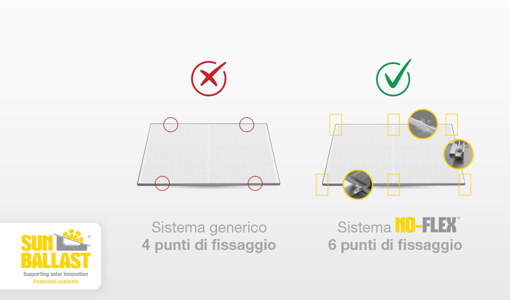 Fin dal 2012 l’obiettivo di Sun Ballast è fornire a progettisti e installatori di impianti fotovoltaici soluzioni semplici e veloci da installare: un obiettivo raggiunto anche con il nuovo sistema No-Flex, l’innovativa soluzione Sun Ballast dedicata ai pannelli di grandi dimensioni. No-Flex consente infatti di risolvere con grande semplicità il problema delle flessioni, offrendo anche ai moduli più grandi il massimo livello di resistenza: la speciale staffa in acciaio posizionata sulla zavorra supplementare offre infatti la possibilità di fissare il pannello anche sulla parte centrale, quella più soggetta alle flessioni. In questo modo i punti di fissaggio salgono da 4 a 6, i parametri di appoggio indicati dai produttori vengono rispettati con precisione, e i moduli risultano estremamente stabili, anche in presenza di forti raffiche di vento. Rispetto agli altri sistemi presenti sul mercato, No-Flex si distingue infatti proprio per il maggior numero di punti di fissaggio: una caratteristica unica, che offre ai pannelli fotovoltaici di grandi dimensioni una resistenza ai carichi di vento e neve senza pari. E a dirlo sono i test.