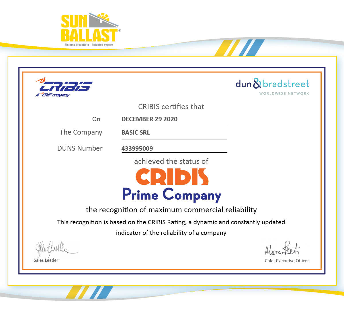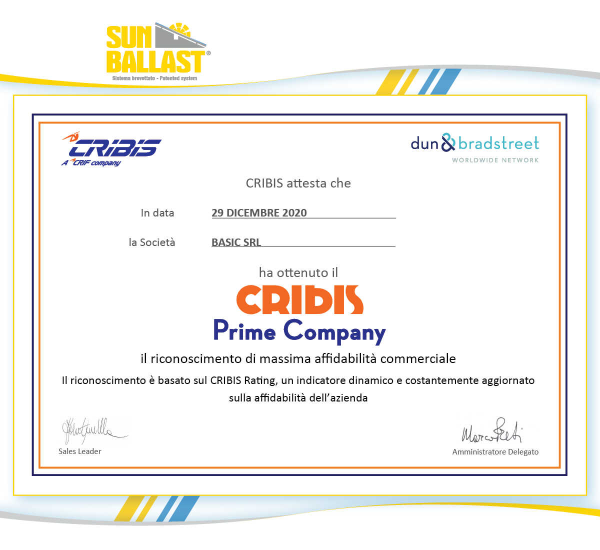 Persino il 2020, se lavori con serietà e pianifichi con lungimiranza, può regalare grandi soddisfazioni. Come “il riconoscimento di massima affidabilità commerciale”, un certificato assegnato a Sun Ballast da CRIBIS D&B, società leader nel campo della business information.