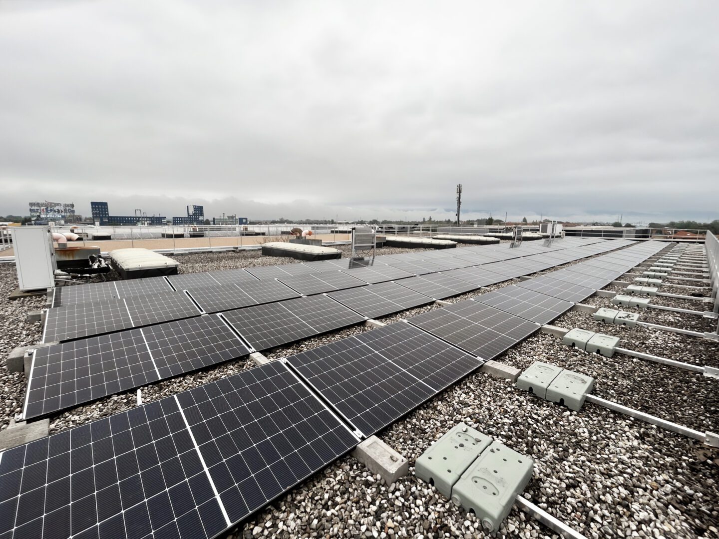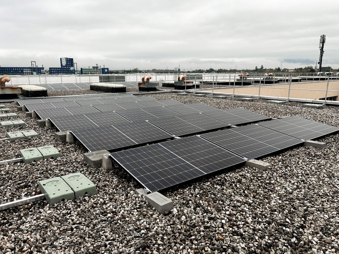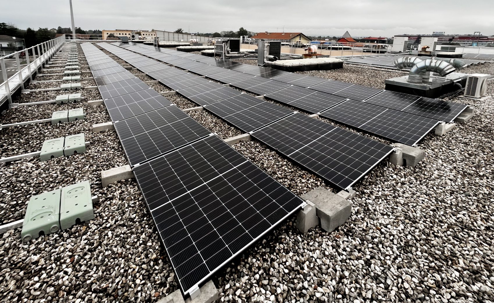 L’impianto da 103 kW in foto è stato realizzato in provincia di Udine dal nostro cliente Evolved Group Srl su un tetto piano in ghiaia, e grazie al sistema Connect 10° è stato raggiunto facilmente il perfetto bilanciamento fra resistenza al vento e carico sul tetto. La configurazione a reticolo permette infatti di distribuire le sollecitazioni atmosferiche sull’intera rete, bilanciando i pesi e assicurando all’impianto la massima stabilità.