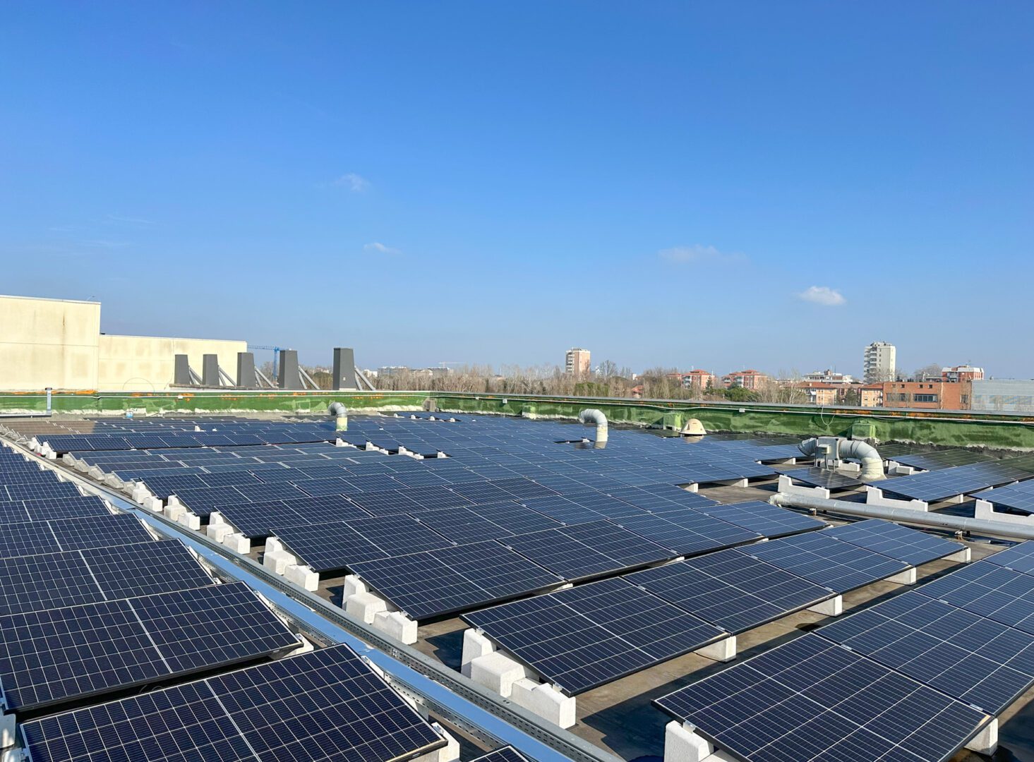 L’impianto in foto – da ben 605 kW – è stato realizzato sul grande tetto piano di un edificio industriale a Formello (Roma) dal nostro cliente Ittin S.r.l., e grazie al sistema Monofila 10° tutte le operazioni di installazione sono state effettuate con grande facilità. Le zavorre per fotovoltaico Sun Ballast non richiedono infatti alcun foro – né per il fissaggio della struttura, né per quello del pannello – e si appoggiano alla copertura riducendo sia i tempi che i costi di manodopera.