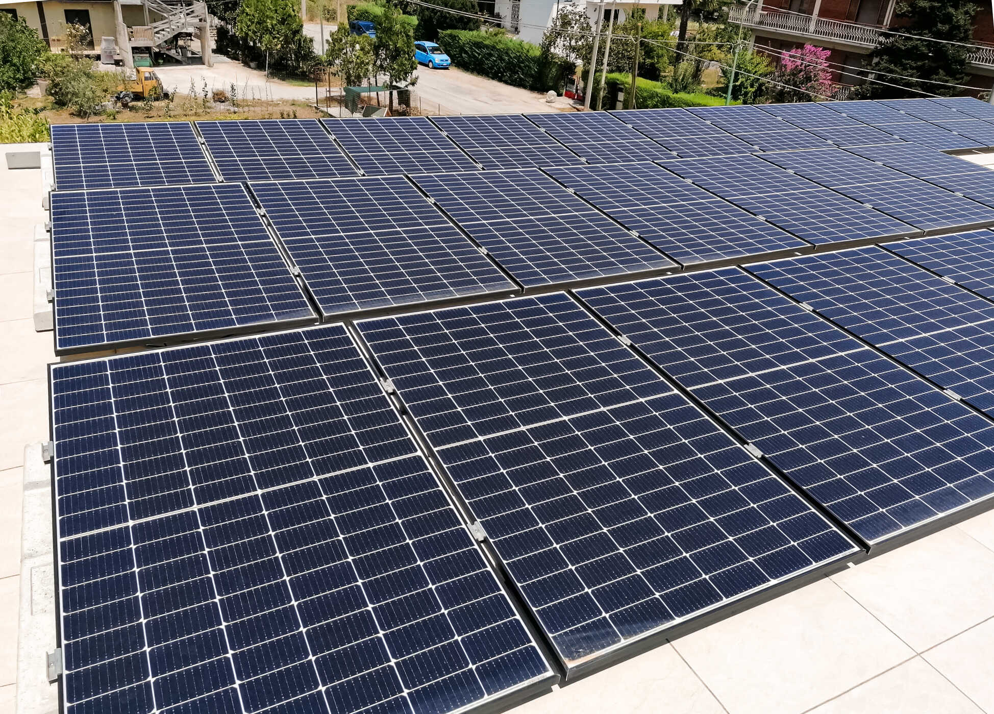 In poco tempo è possibile installare un impianto fotovoltaico anche su superfici piane in pavimentazione, i nostri sistemi, infatti, vengono semplicemente appoggiati al suolo senza dover praticare fori o fissaggi, ciò permette di lasciare intatta la copertura senza recare danni.